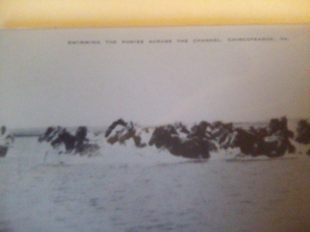 The product is a printed postcard featuring the Annual Pony Swim in Chincoteague, Virginia. The postcard depicts a scene of swimming ponies in the picturesque town of Chincoteague on the East Coast of the United States. Made of paper, this original postcard captures a unique and charming aspect of Virginia's coastal culture, making it a collectible item for postcard enthusiasts and fans of equestrian activities.