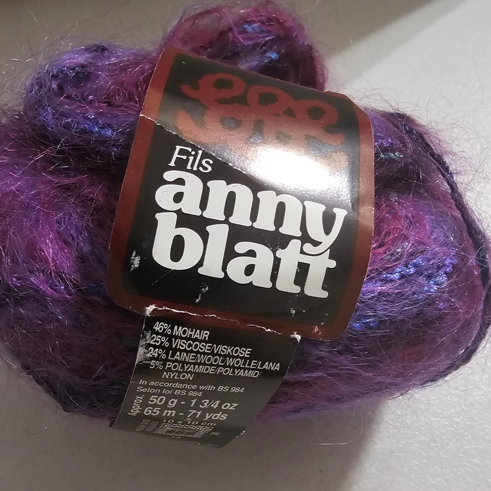 Anny Blatt Mohair blend yarn. Made in France. 50 g 71 yds. Fiber content: 46% Mohair 25% Viscose 24% Wool 5% Nylon Returns accepted within 30 days in same condition as purchased. Buyer pays return shipping. Shipping USPS ground.
