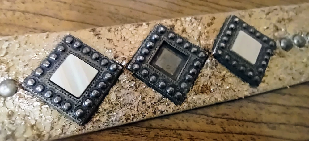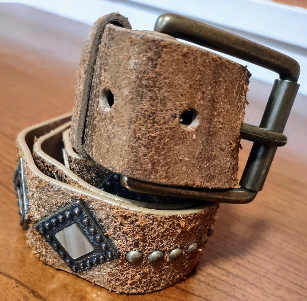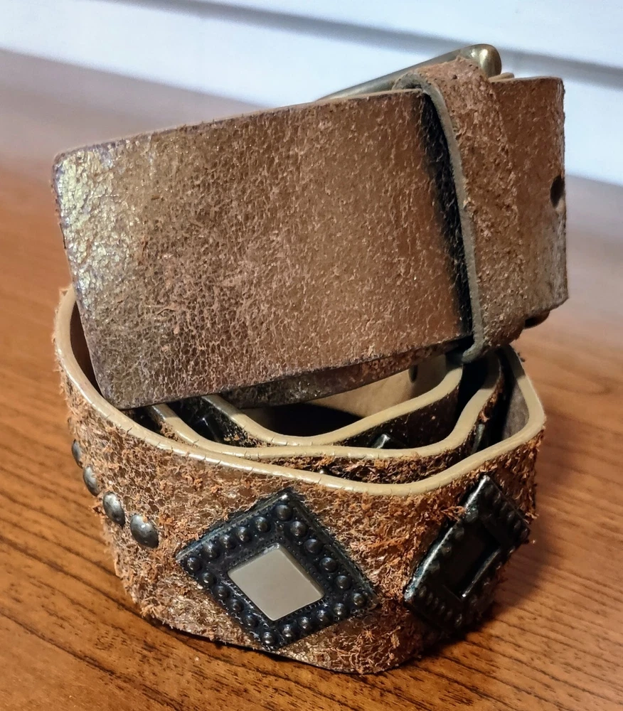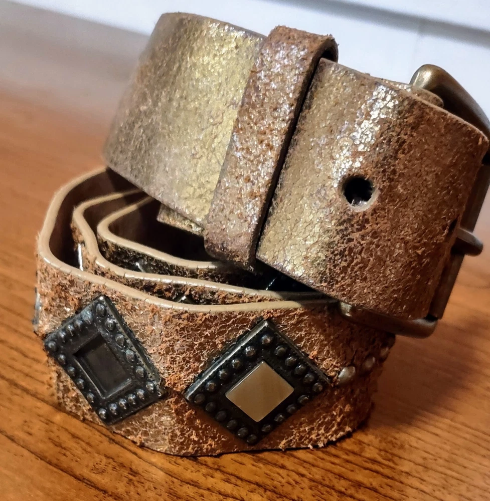 Another Line Distressed Italian Leather Wide Gold Belt Studded Brass Buckle. Size Medium Great pre-owned condition with one stone missing as shown in pictures. Shipped USPS ground advantage. Message me with any questions for a prompt reply. Be sure to check out and consider following my eBay shop thriftThippie to see more amazing items listed daily. Y'all stay safe healthy and happy!!!