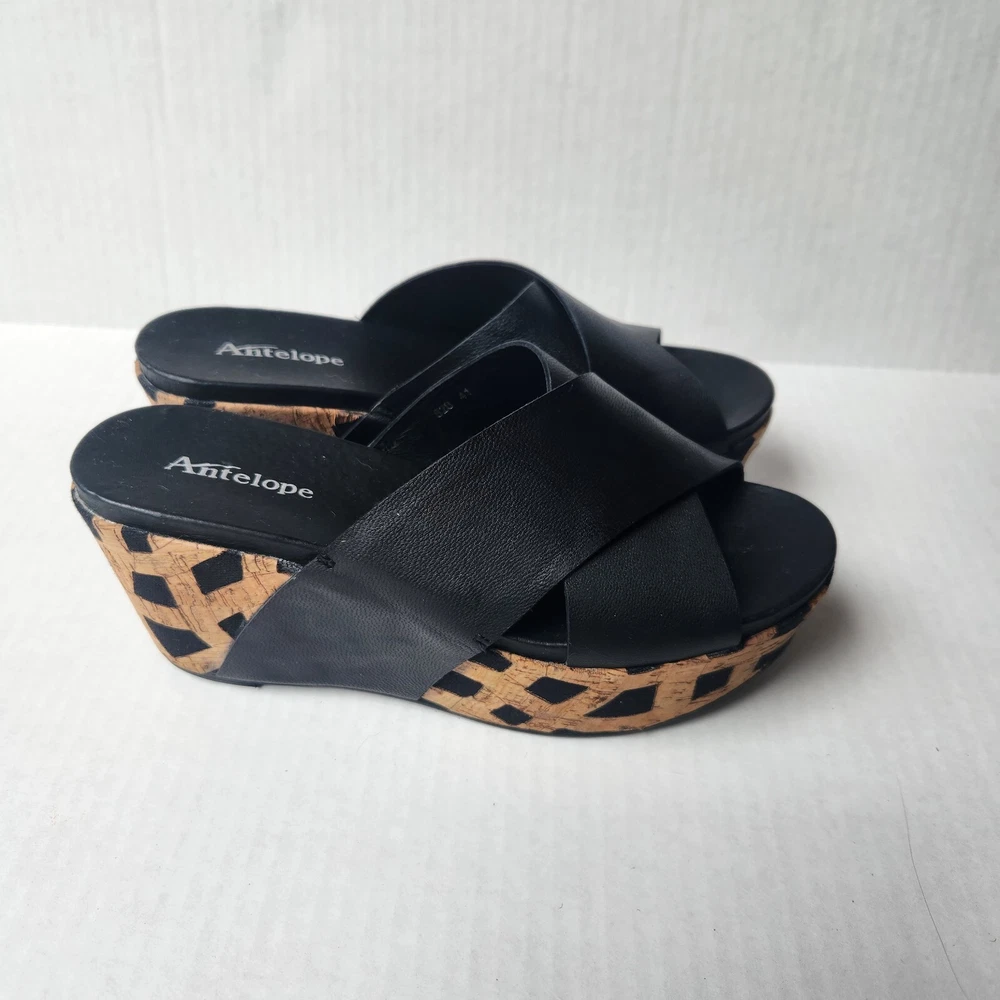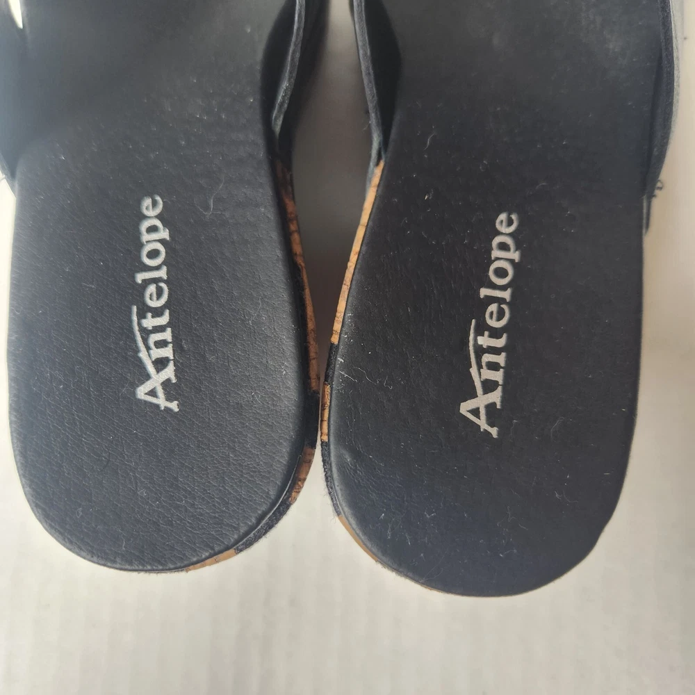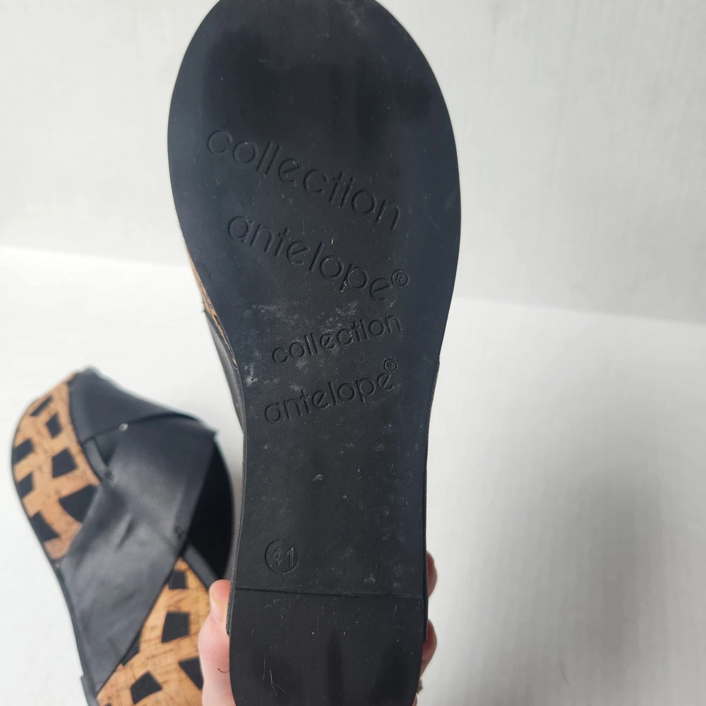 Women's Antelope 828 Cross Band Wedge Sandal Size: EU41 US9.5 Color: Black/Tan Leather/Cork Material Pre-owned item in excellent condition with little signs of wear. Item ships from smoke free home in 2 business days. Please feel free to reach out with any questions you may have, and thanks for taking a look!