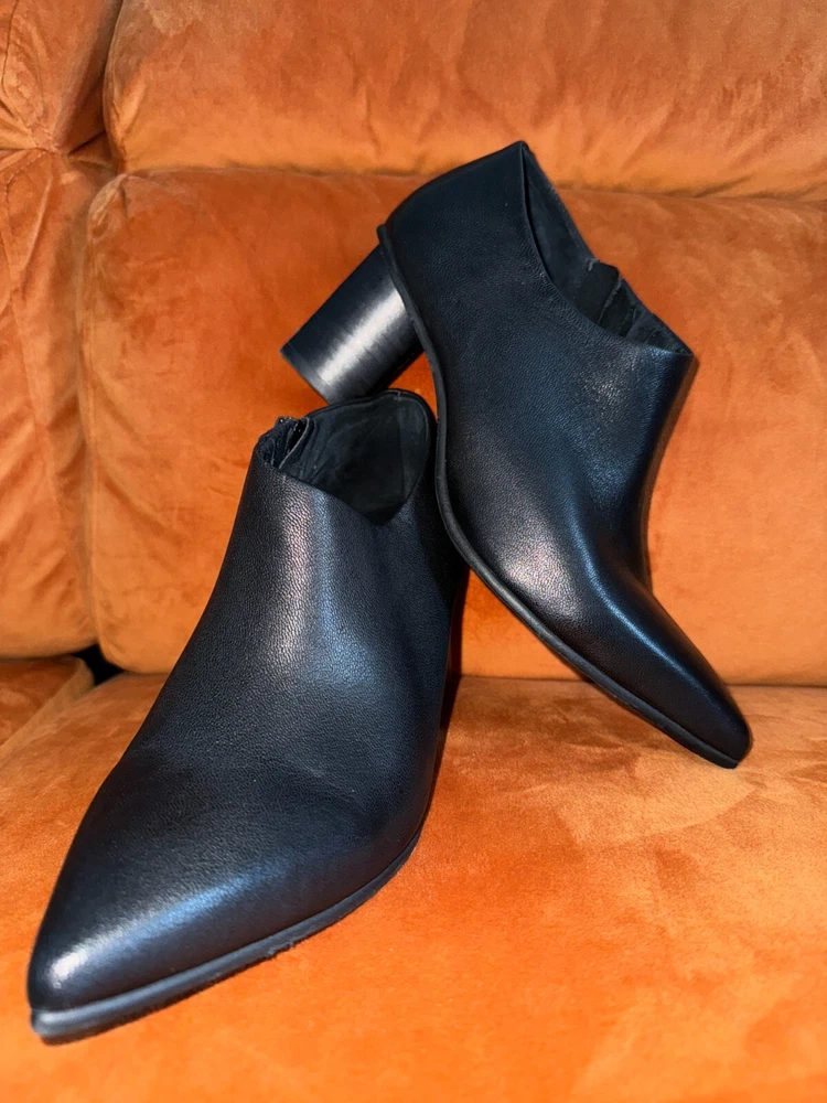 Elevate your shoe collection with these stylish Antelope Hollis Black Booties. These pointed toe heels have a 3" lift and are made of high-quality leather. The sleek black color and bootie style make them perfect for any occasion. The brand Antelope is known for its exceptional quality and attention to detail. These heels are no exception, with their comfortable fit and durable construction. Add these shoes to your wardrobe today and step out in style. Details & care Punctuate any outfit with this pointed-toe bootie fashioned with an easy side-zip closure and lofty block heel. 3" heel Inset side-zip closure Cushioned footbed Leather upper and lining/rubber sole Imported Item #10337698 Glad to answer all questions. Smoke-free home. No returns. Thanks for looking!