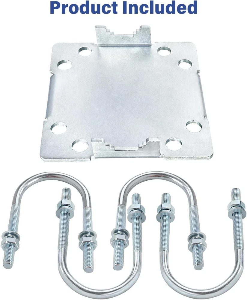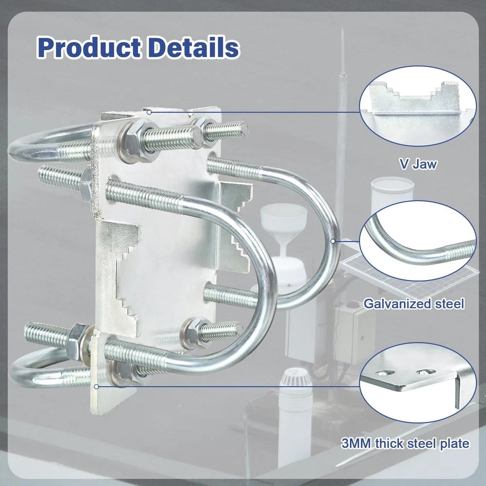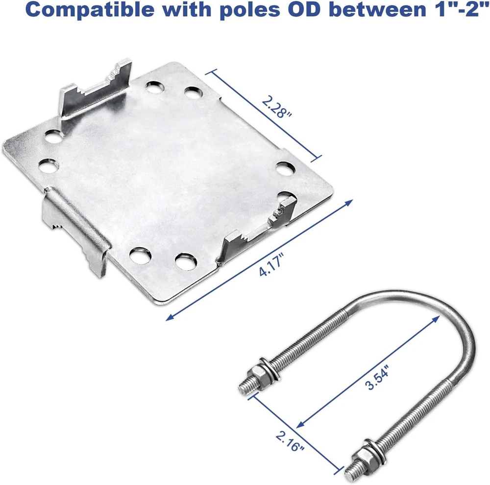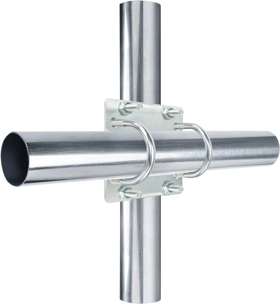 Important: Only Clamps, Poles are not included! [Easy to Install] Mount 2 antenna mast poles at a 90°(cross or T shape) firmly, V jaw blocks and U-shape bolts would prevent it slip down. [High Quality Made] Made of Q235 low carbon alloy steel that could effectively prevents rusting, and it is galvanized which provide oxidation and corrosion proof. [Widely Used] Long time service antnena pole mount that suitable for mino antennas, yagi antenna, TV antenna, weather station, security camera, solar panel, LED street light etc. [Heavy Duty Hardware] 3mm thick steel plate for heavier mast and not easy to be bent, can strongly against winds and extreme weather to keep your device safe. The entire hardware can be used for poles 1"-1.8" in diameter [Package Included] The package contains 1*steel plate, 4*U-bolt, 8*nut, 8*washer, 8*grommet. If you have any issues about it, contact us freely. Product Description Feature: Antenna mast mounting kit that easy and stable installation. Anti-corrosion and anti-oxidation antenna pole bracket. High quality made, not easy to deform. Widely used hardware. 3mm thickened steel plate, not easy to deform, more stable. Appliciation About us MOOKEERF is a professional brand of communication accessories. We have been focusing on research and development of communication accessories for 10 years. The products sold include coaxial cables, connectors, antennas, power dividers, etc. MOOKEERF U-bolt cross over antenna mast clamp Important: There's only mounting kits, poles are not included! Material: Galvanized Q235 low carbon alloy steel Parameter: Suitable for poles OD 1"-1.8" Applications: Antennas, Outdoor lights, security camera, solar panels, weather stations