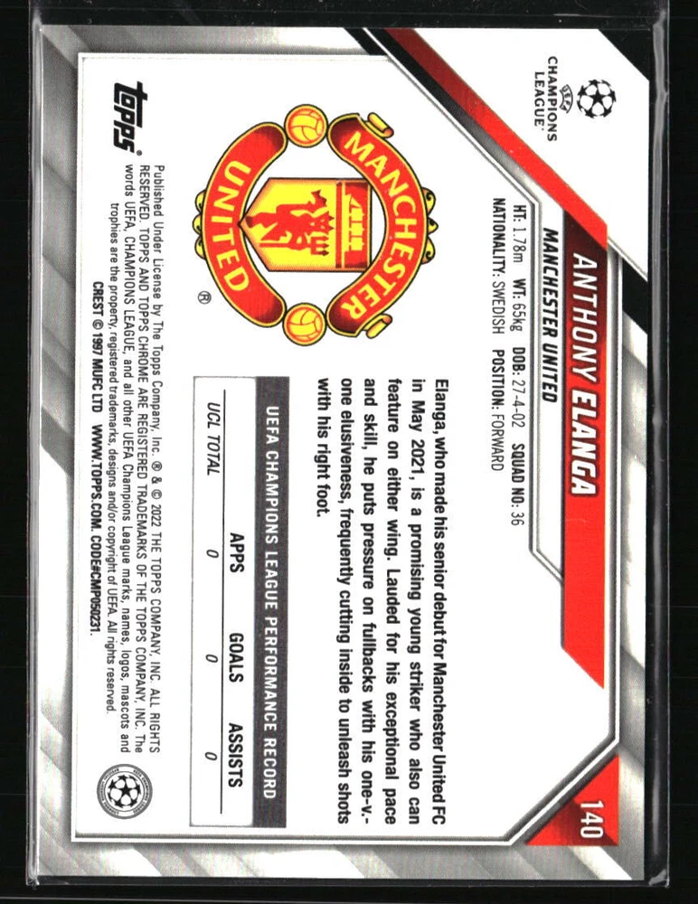 Anthony Elanga 2022 Topps Chrome UEFA Champions League #140 RC Soccer Card