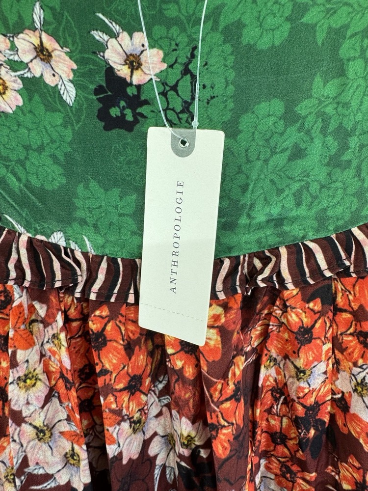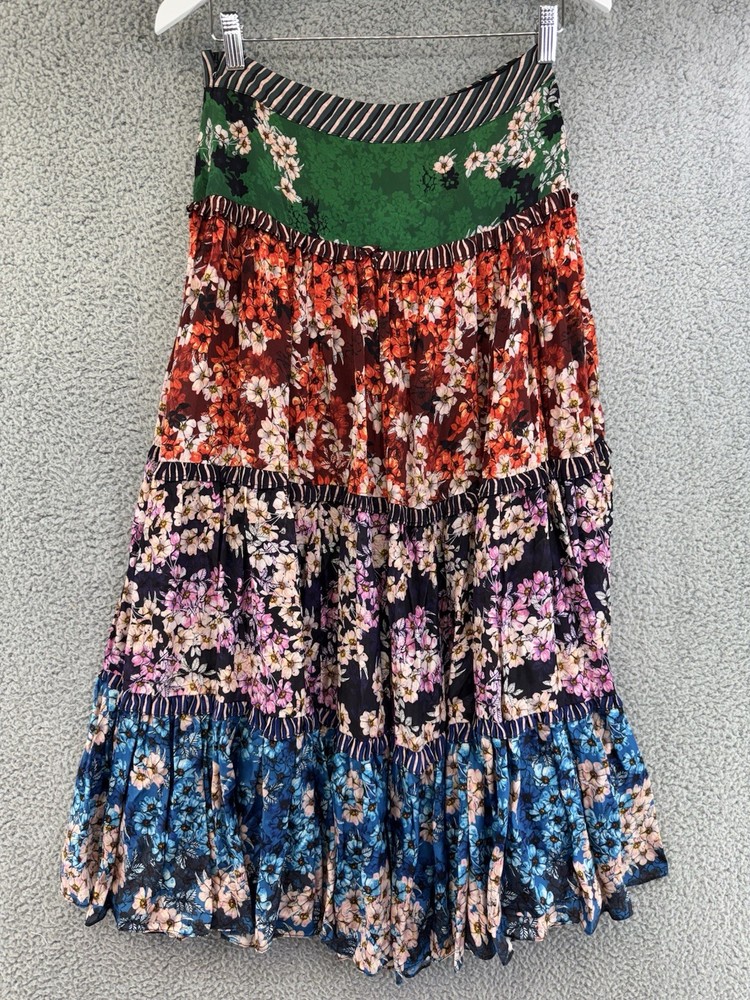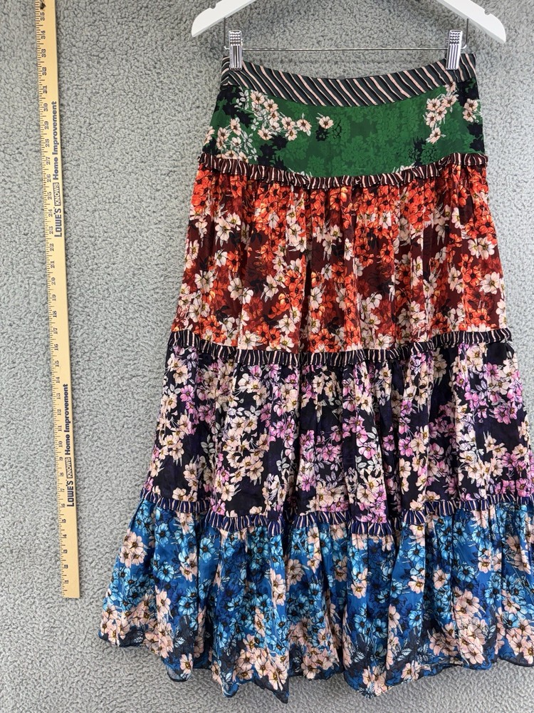 The Anthropologie Bhanuni by Jyoti Colorful Tiered Floral Maxi Skirt in size 8 features a vibrant multicolor floral pattern with ruffle accents, perfect for a casual bohemian look. Made of lightweight viscose fabric, this long skirt with a mid-rise and zip closure is ideal for summer, fall, or spring occasions. Woven in India, this Anthropologie skirt adds a touch of bohemian charm to your wardrobe with its colorful and layered design.