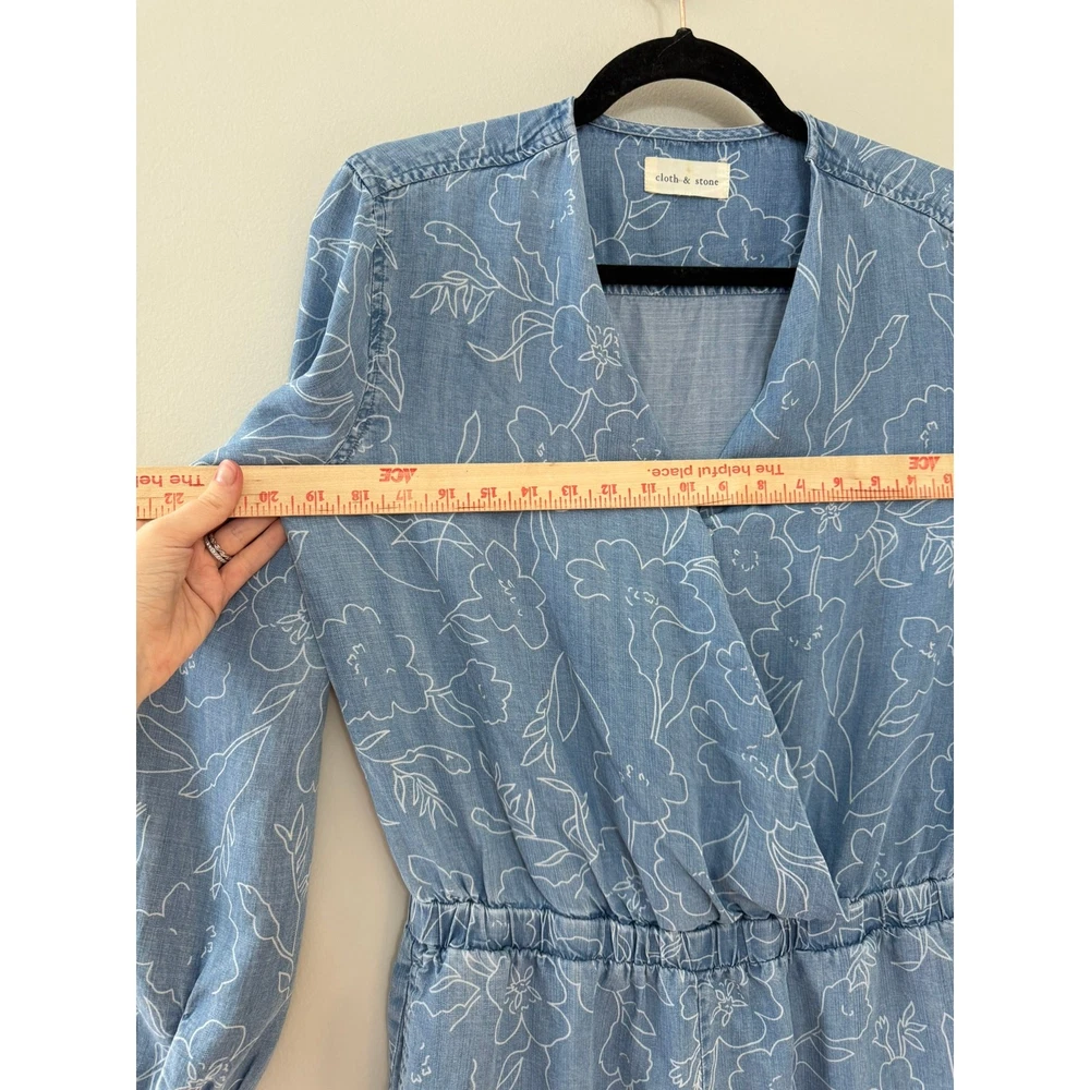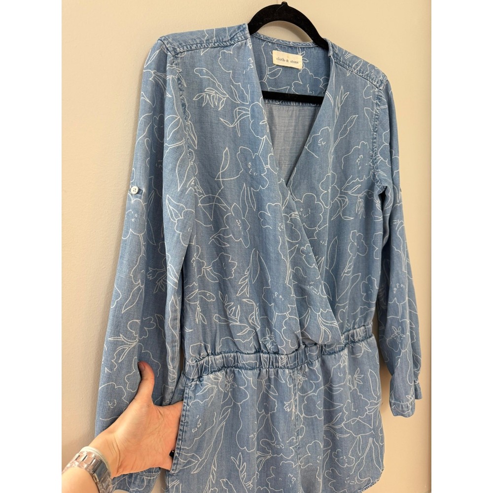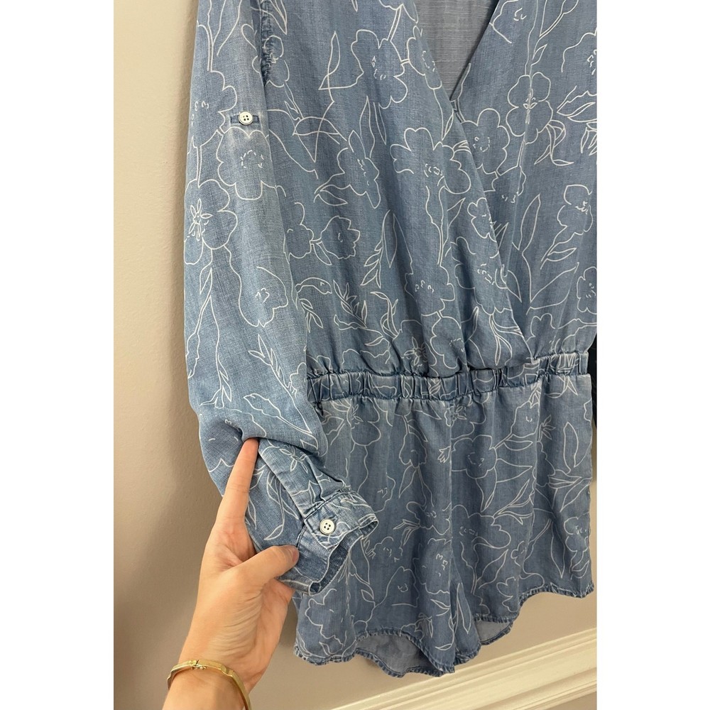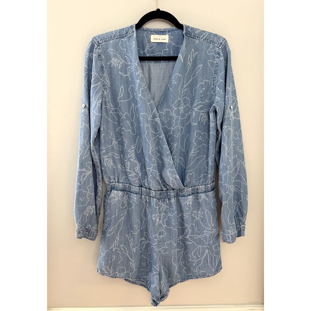 Cloth & Stone Coastal Minimalist Floral Chambray Long Sleeve Romper. No size indicated, but this works best for a medium or maybe an oversized small. Please see measurements, P2P about 20 across back (flexible in bust due to wrap) WLF about 15-18 inches, rise 12 inches, inseam 2.5 inches. The sleeves roll up too! An adorable feminine floral pattern. Retailed $175. Excellent used condition, no flaws noted. Smoke free pet friendly home. Check out my other listings for a bundle deal!