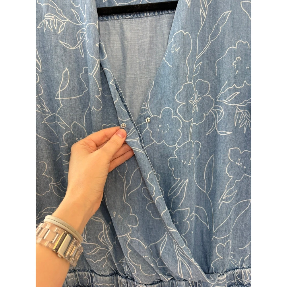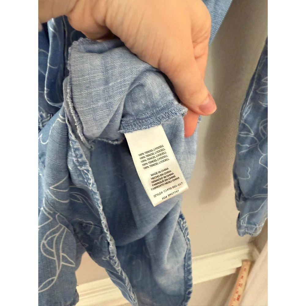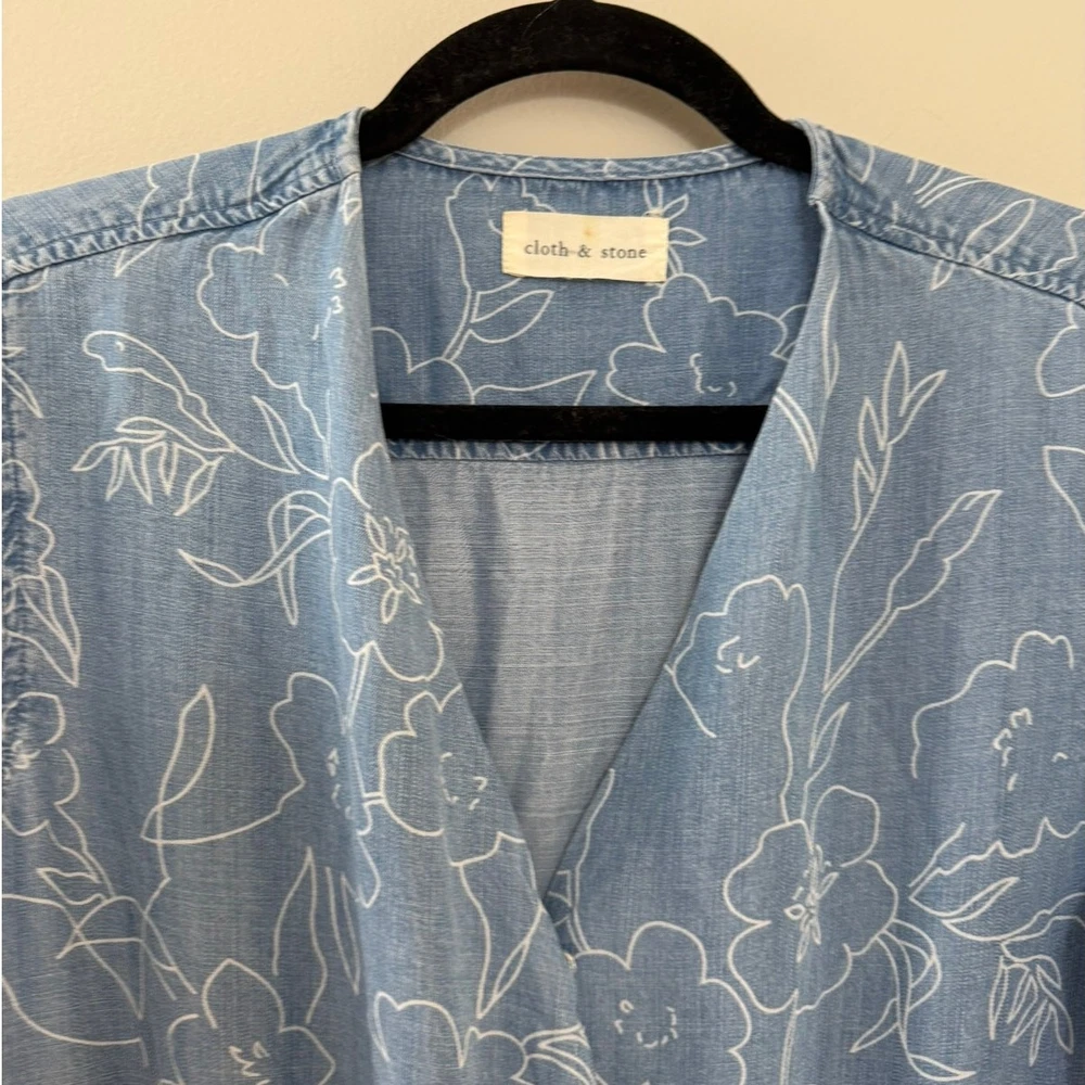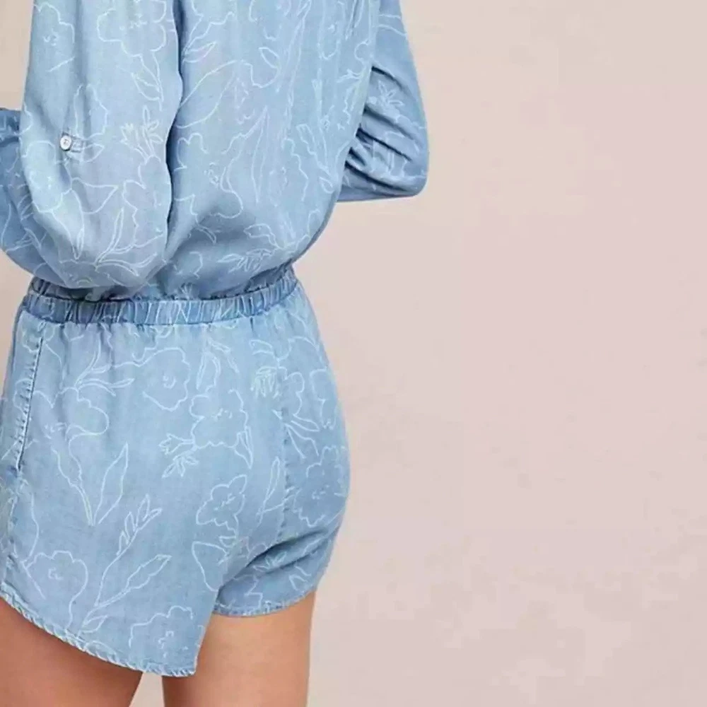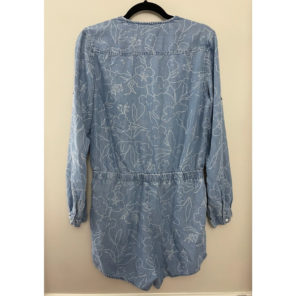 Cloth & Stone Coastal Minimalist Floral Chambray Long Sleeve Romper. No size indicated, but this works best for a medium or maybe an oversized small. Please see measurements, P2P about 20 across back (flexible in bust due to wrap) WLF about 15-18 inches, rise 12 inches, inseam 2.5 inches. The sleeves roll up too! An adorable feminine floral pattern. Retailed $175. Excellent used condition, no flaws noted. Smoke free pet friendly home. Check out my other listings for a bundle deal!