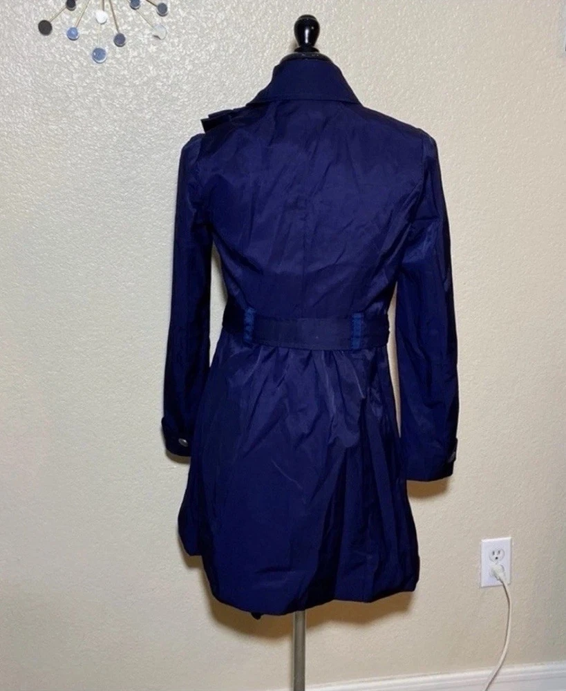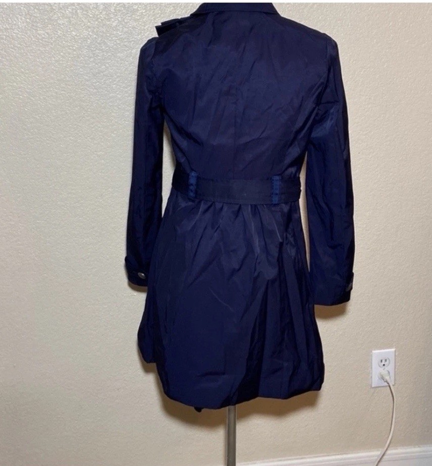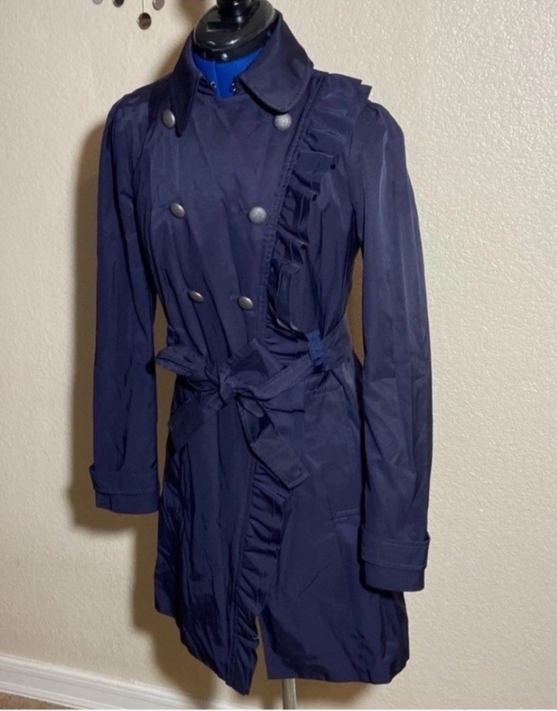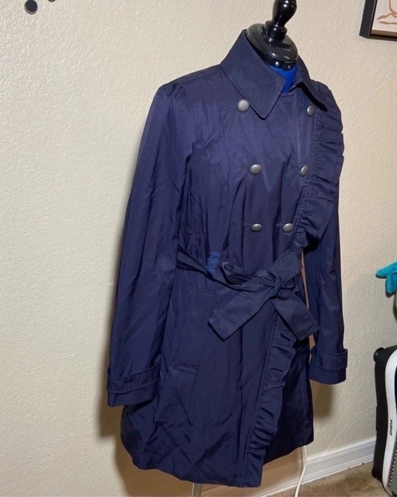 The Elevenses Women's Navy Ruffle Double Breasted Belted Mid Length Trench Coat is a versatile and stylish outerwear piece suitable for various occasions. Made from a cotton blend outer shell and lined with 100% cotton, this coat features long sleeves, a zip and button closure, and a flattering belted fit. The ruffle accents and double-breasted design add a touch of sophistication, making it a perfect choice for casual outings, formal events, or business meetings. With a mid-length design and solid blue color, this trench coat is a timeless and classic addition to any wardrobe. 57% COTTON, COTON, ALGODÓN, COTONE, BAUMWOLLE 43% POLYESTER, POLYESTER, POLIÉSTER, POLIESTERE, POLYESTER BODY LINING, DOUBLURE CORPS. CUERPO DE FORRO, FODERA DEL CORPO, RUMPFFUTTER 100% COTTON, COTON, ALGODÓN COTONE, BAUMWOLLE SLEEVE LINING. DOUBLURE DE LA MANCHE MANGA DE FORRO, FODERA MANICA ARMELFUTTER 100% POLYESTER, POLYESTER.