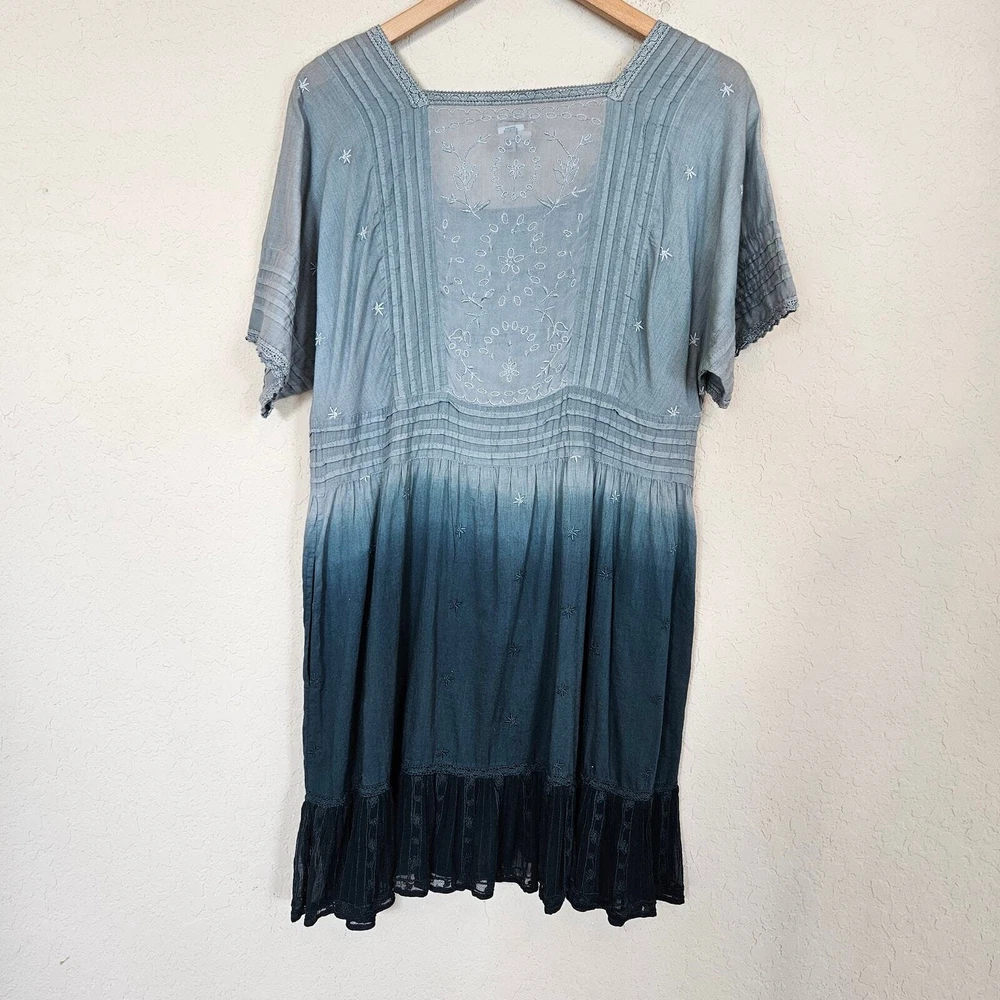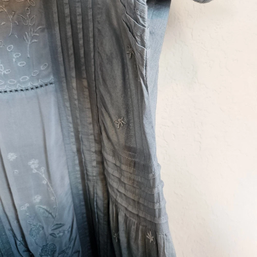 Anthropologie Holding Horses Ocean Dipped Tunic Dress Women's Small Boho Summer •Blue dipped ombré in color. •Woven, gauzy cotton. •Relaxed tunic silhouette. •Embroidered detail. •Pullover styling. •Square neckline. •Pockets. •Lace trim with sheer panels & embroidery. • Pintuck detail •Ruffle Hem • Ombre coloring with Teal Blue green into a sea foam blue Pastel that is muted. Size S Small Approximate Measurements: pit to pit - 18" across waist - 17.5" hips - 20" length - 35" Excellent pre-owned condition, no rips, tears or stains. Does not come with a slip. Smoke free, dog friendly home. casual everyday classy spring summer flowy chic western Yellowstone boho bohemian farmhouse cottage faerie