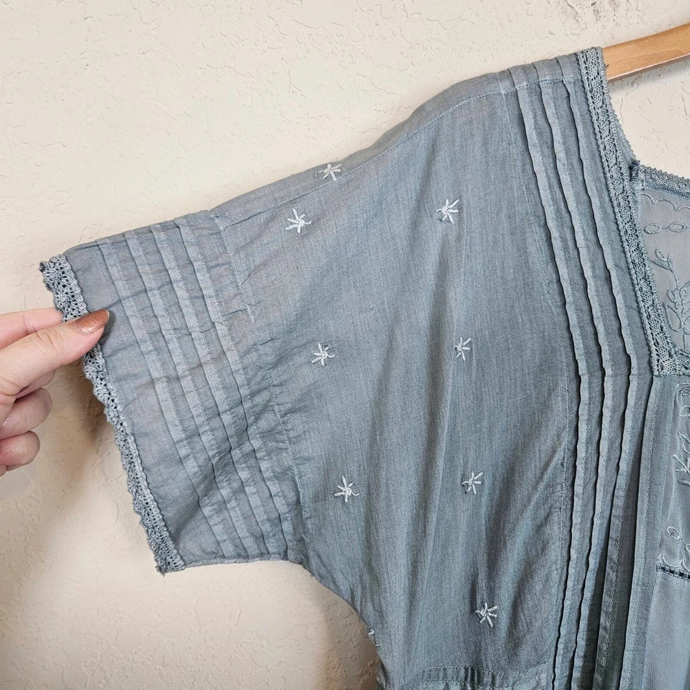 Dress Length: Short Size: S Sleeve Length: Short Sleeve Material: 100% Cotton Color: Blue Season: Spring, Summer Closure: Pullover Size Type: Regular Brand: Anthropologie Department: Women Occasion: Casual Accents: Embroidered, Ruffle, Pleated Features: Lightweight Style: Mini