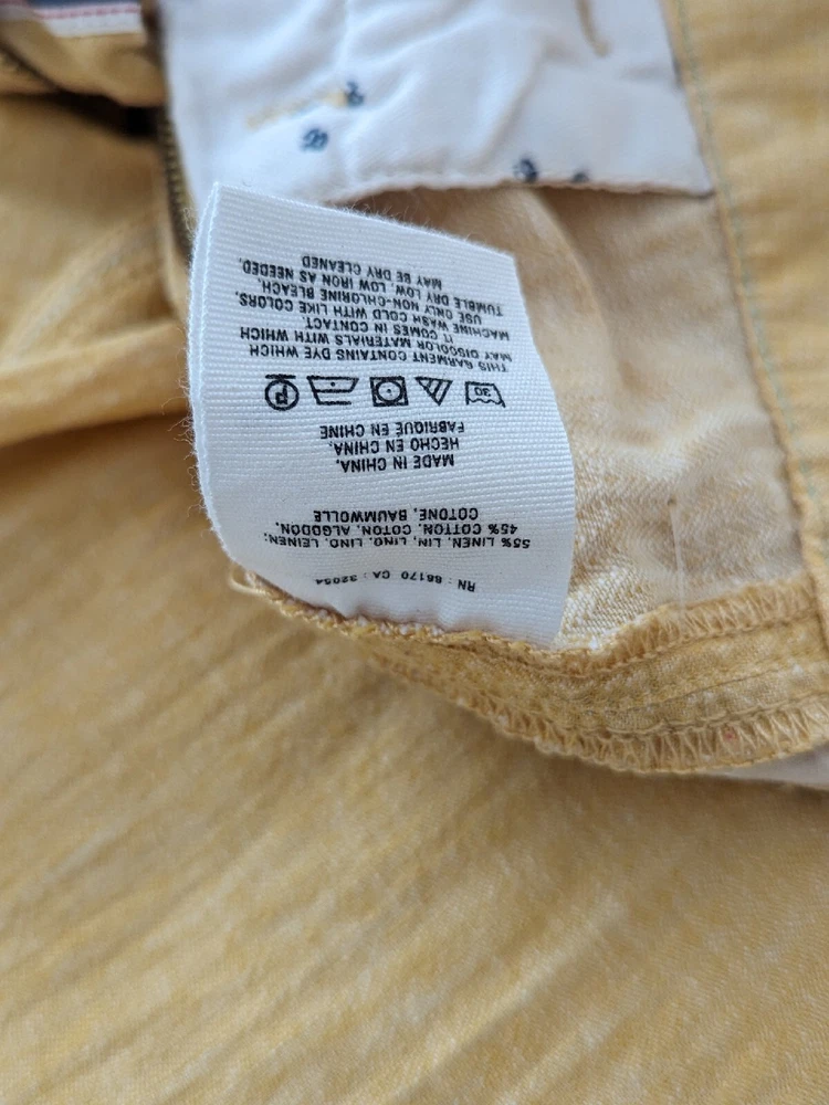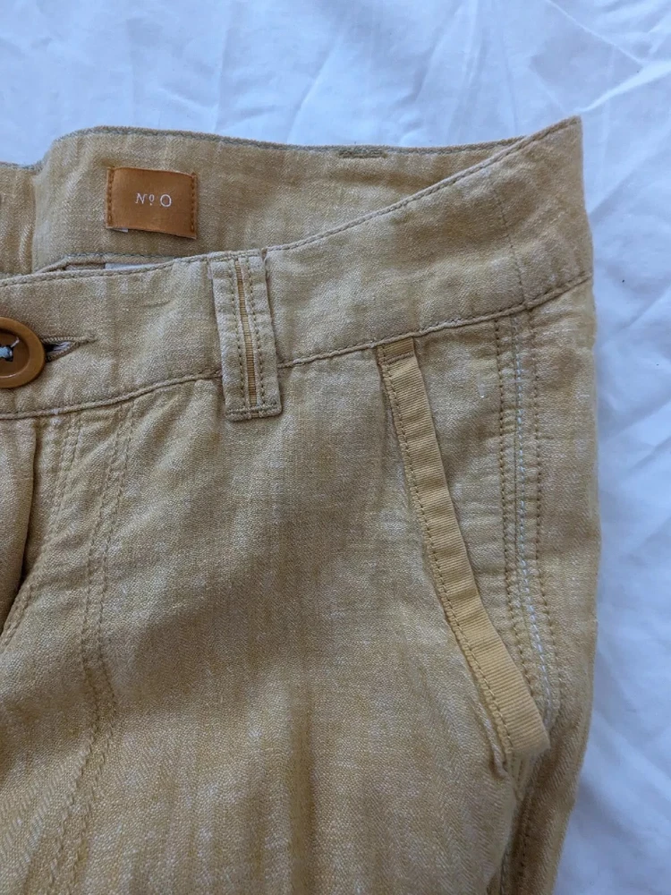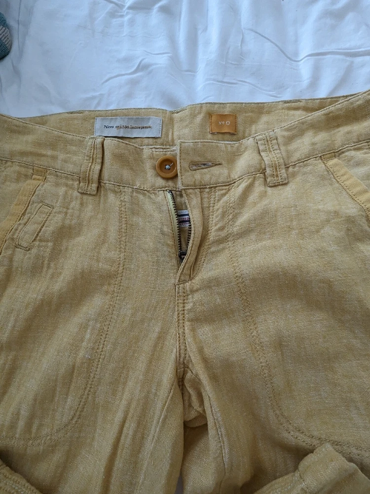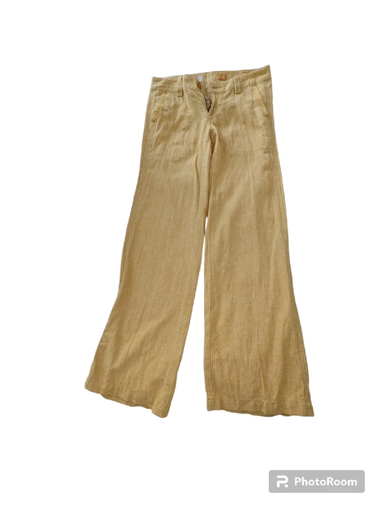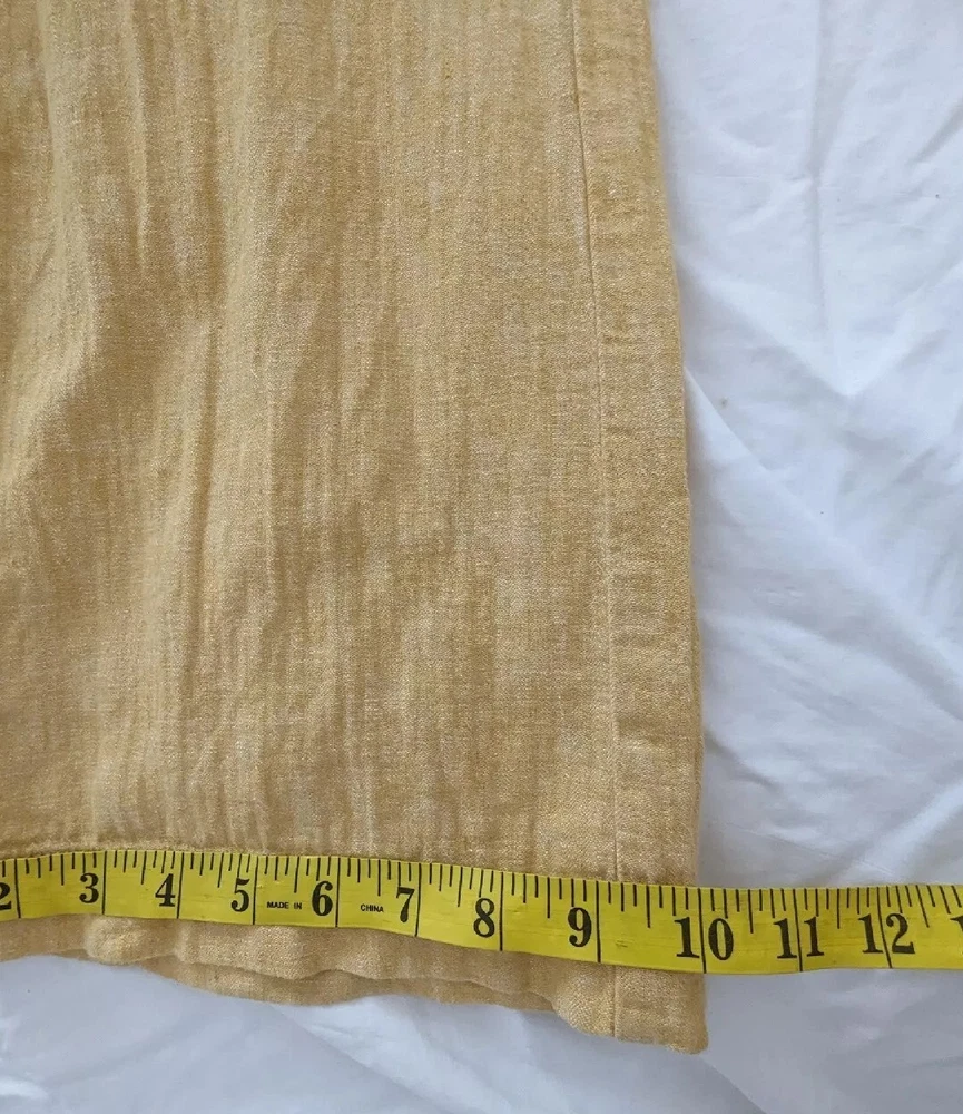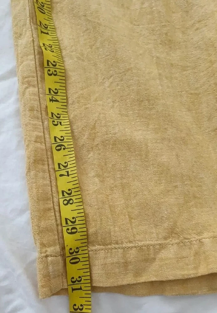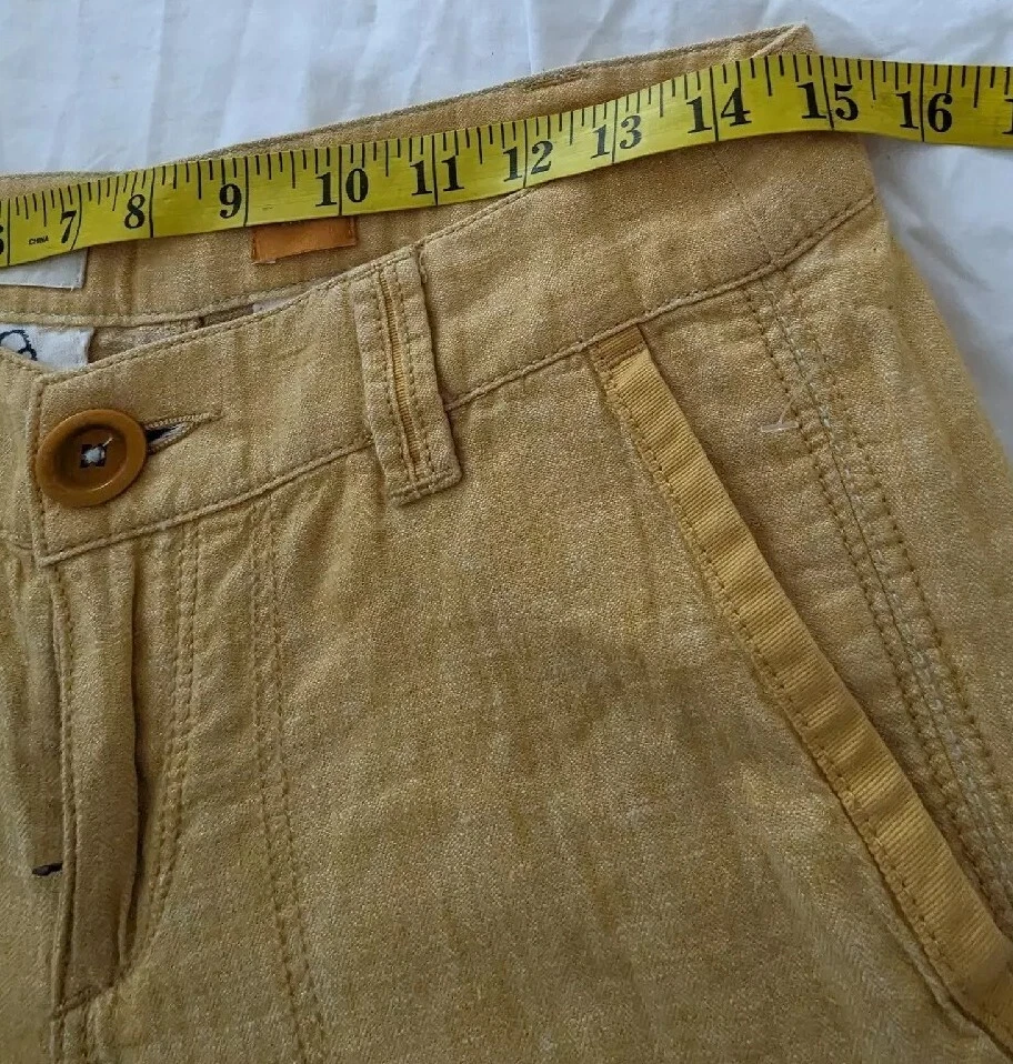 These Anthropologie Pilcro pants are a must-have for any wardrobe. The pants are made of a comfortable blend of linen and cotton, and the ocher yellow color adds a pop of brightness to any outfit. The pants feature a flat front and a slight flare at the leg, with a zip closure for easy wear. Perfect for any occasion, these pants can be dressed up for work or dressed down for a casual day out. The pants are machine washable, making them easy to care for. The woven fabric type gives the pants a durable and stylish look. These pants are a great addition to any wardrobe, and they are sure to become a favorite. Measurements in photos