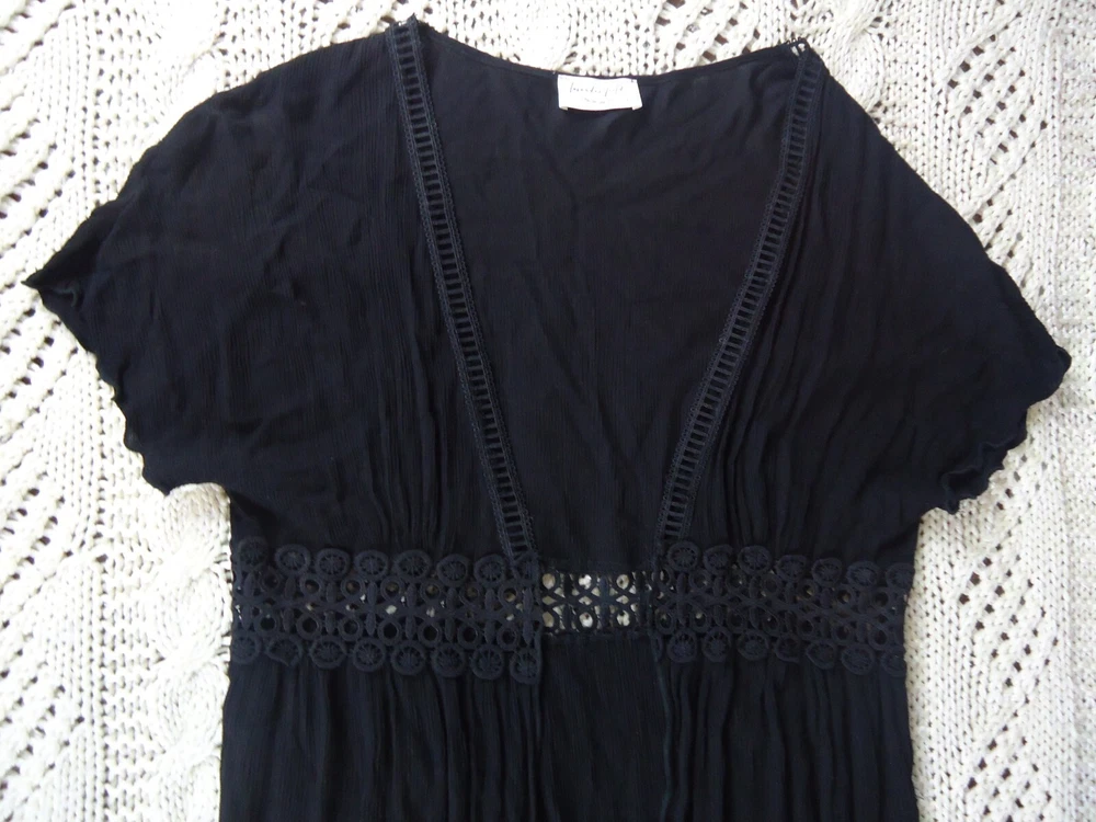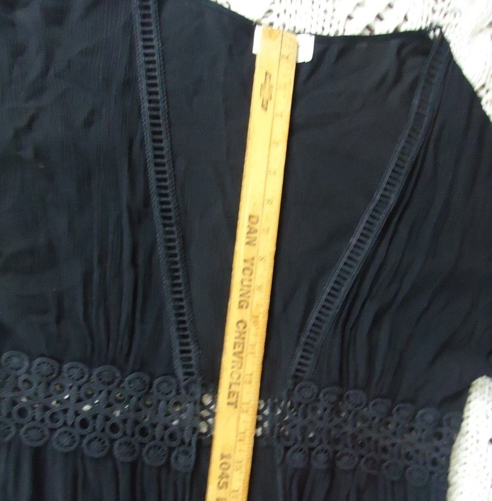 Anthropologie Wrap Dress By Lavender Field Women's Size L Black Gauzy flowy fabric with a lacy detailed waistline. This is preowned and in used condition and as such may show some minor signs of wear but it is in great condition overall. The tag that tells the material type and the washing instructions has been removed. Please see all pictures for measurements and condition. C4