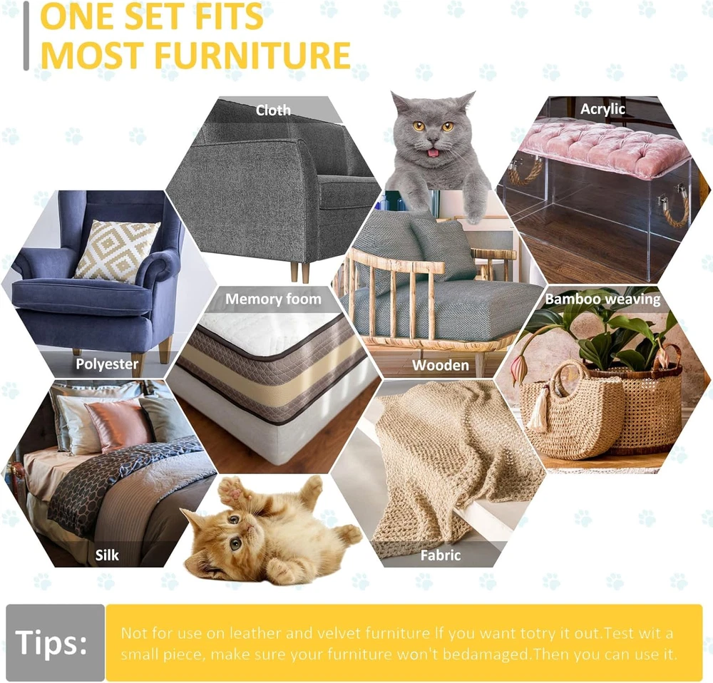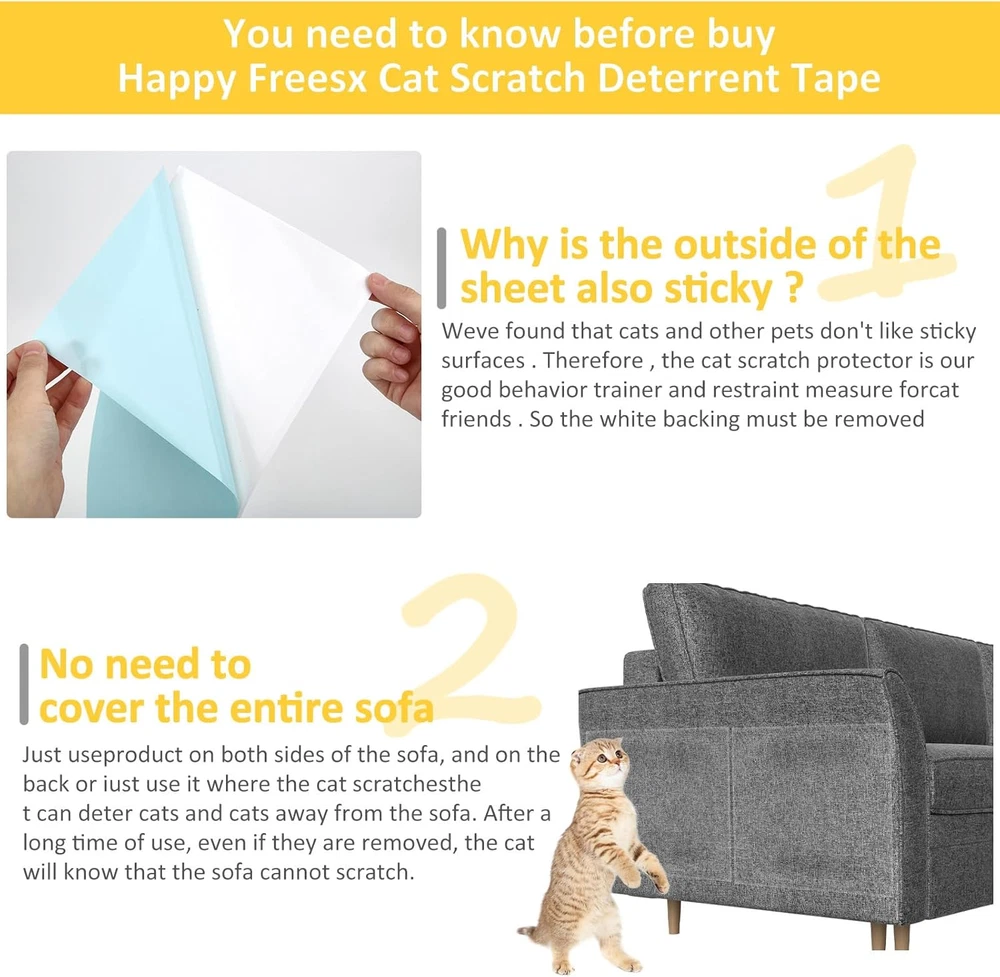 CUSTOM FIT FOR ALL FURNITURE: Say goodbye to guesswork! Our anti cat scratch furniture protector includes two sizes, 5 XL and 6 L sheets, offering a custom fit for various surfaces. Enjoy the simplicity of protecting all your furniture needs. double-sided sticky tape cover more area per sheet, providing a mess-free solution for protecting your furniture. No more messy cutting – just stick and enjoy a harmonious home. STRONG ADHESION, RESIDUE-FREE REMOVAL: XMZCYMyo tape's reliable adhesion keeps it in place during training, and when it's time to remove, there's no sticky residue left behind. Effortless protection for your furniture. TRAIN & PROTECT WITH EASE: Transform your cat's scratching habits with our game-changing Cat Scratch Deterrent and Training Tape. Train your feline friend stress-free and say goodbye to costly furniture damage. ENJOY A SCRATCH-FREE HOME: Reclaim your furniture with our ultimate Cat Scratch Deterrent & Training Tape! The flat sheets, in three sizes, offer wider coverage without the mess, ensuring a scratch-free home. Plus, our satisfaction guarantee lets you train your cat with confidence. SATISFACTION GUARANTEED: Rest easy with our 100% satisfaction guarantee. If our Cat Scratch Training Tape doesn't meet your expectations, we'll make it right – your satisfaction is our priority! Product Description You need to know before buy XMZCYMyo Cat Scratch Deterrent Tape 1.Why is the outside of the sheet also sticky? We've found that cats and other pets don't like sticky surfaces. Therefore, the cat scratch protector is our good behavior trainer and restraint measure for cat friends. So the white backing must be removed. 2.No need to cover the entire sofa. Just use the product on both sides of the sofa, and on the back or just use it where the cat scratches. It can deter cats and cats away from the sofa. After a long time of use, even if they are removed, the cat will know that the sofa cannot scratch. 3.Recommend Put the cat training sticky tape where your cat scratches often and place a scratching post near the taped surface. The cat will stop scratching the taped area and scratch the scratching post instead! How to Use Our Cat Scratch Deterrent Tape? 1.Cut the Training Sheets XMZCYMyo anti scratching sticky tape can by easily cut to the size you need. Cut & adjust within seconds. 2. Peel Off The White Backing Peel off the white backing and prepare the sticky side for use. 3. Stick The Adhesive Where You Want to Protect 4. Peel Off The Blue Backing Peel off the blue backing to expose the sticky side. Your cat will not approach it. Protect Your Furniture Against Cat Scratch(Couch, Door, Bed, Table, Corner) What’s The Size? The double-sided cat scratch deterrent tape 5 PCS XL 13.7” L 9.8”W + 6 PCS Large 13.7” L 5.9”W. Why Choose Our Anti Cat Scratch Furniture Protectors? What problem are we solving? As a pet owner, offer a good way to solve the problem - reduce the damage of PAWS on furniture, and train your cat where not to scratch. Our Double Side Couch Protector for Cats are simple and practical, save your time and energy, and let my pets better accompany us Suitable Size Two different sizes to choose, more convenient and flexible, 5 PCS XL 13.7” L 9.8”W + 6 PCS Large 13.7” L 5.9”W. Protect the aesthetics 100%Transparent, virtually invisible protection Purrfectly Safe No harmful substances, keep cats and furniture safe Residue-free & No marks Your furniture is guaranteed to be flawless REMEMBER: We do not recommend using our cat training tape on artificial leather or genuine leather. 1. Cut, peel and apply a small piece of protective film, then test in the hidden area. 2. Apply it and leave it for48 hours. 3. Remove and check your furniture. 4.If the material is intact, apply the rest of the protectors