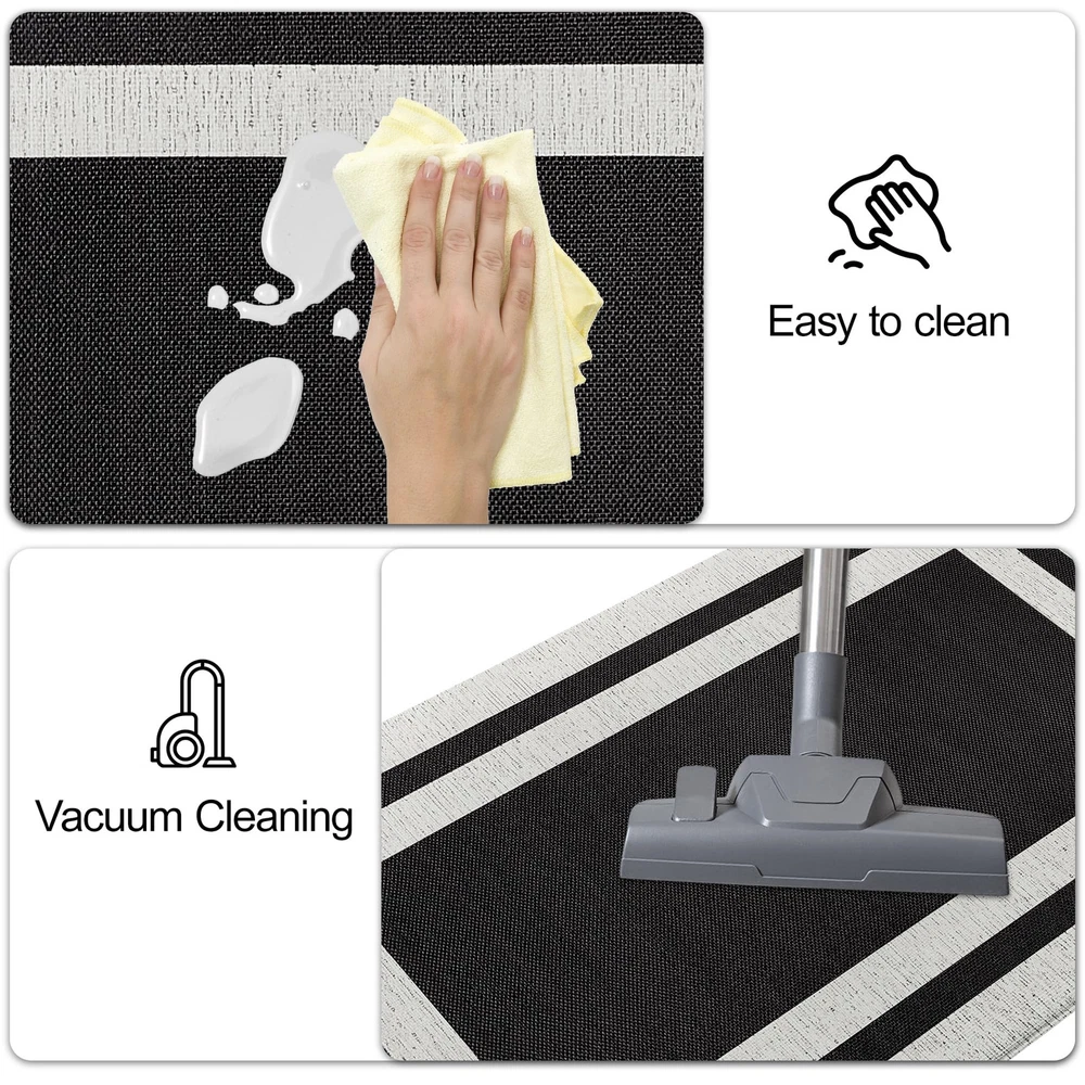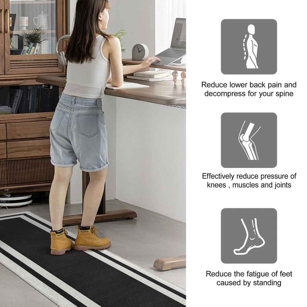 ANTI-FATIGUE MAT: 0.4 inch (10mm) anti-fatigue kitchen floor mat is ergonomically designed to relieve pressure on feet and legs. Memory foam kitchen mat can improve circulation and standing posture while you work at kitchen or office. QUALITY MATERIAL: Kitchen mat is made of high quality PVC material, which is environmentally friendly for your family. Rubber kitchen mats for floor has a slow-rebound feature to protect your dropping dishes from breaking. EASY TO CLEAN: Non-slip kitchen mats are easy to clean. the PVC material is waterproof, oil and stain resistant. Simply wipe away the dirt with a damp cloth or handheld vacuum as needed and the cushion kitchen mats for floor will maintain its new look. WIDE VARIETY OF USES: The classic simple geometric pattern black kitchen rug can easily match your kitchen decor and brighten up your home. The kitchen mat provides large surface area for laundry, kitchen, office, living room, in front of the sink. SAFETY: The kitchen mats have a waterproof PVC surface, which helps to keep the carpet sturdy and prevents it from moving. Open anti fatigue kitchen mat fully and place on even and flat floor, the kitchen runner will be back to normal in a few days.