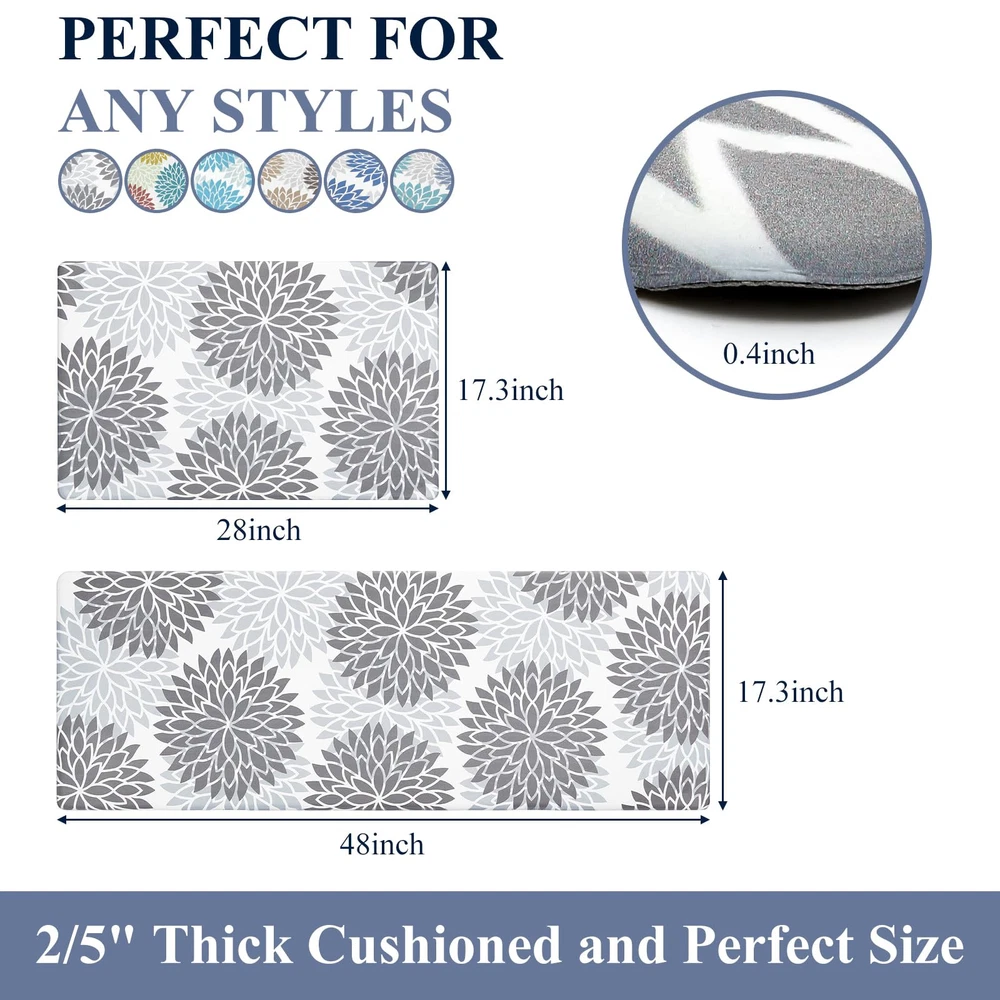 Anti Fatigue Kitchen Mats for Floor 2 Piece Set: farmhouse antifatigue kitchen mat and runner set contains 2 size (17 x 28 inches and 17 x 48 inches rectangle mats). The comfort standing mat with runner are made of high-quality and premium PVC materials, it can ensure its shape even after long-term heavy duty use. Comfort Anti-fatigue Mats for Kitchen Floor: 2/5inch thick cushioned anti fatigue kitchen floor mats are ergonomically engineered,extra thick mat provides comfortable support to help improve circulation and posture and to ensure that you are able to stand comfortably while working in the kitchen or at any work station. Perfect for home or commercial use in areas such as hair salons, restaurants, or in any space in which people stand for long periods of time. Non Slip Kitchen Rugs and Mats Set: Top of the anti fatigue kitchen mat set are designed with attractive dimand style and bottom is made of non-slip material;also beveled edges help prevent tripping. The PVC foam kitchen floor mat may be used on multiple surfaces (tile, wood, ceramic, marble, etc). [WARNING!!] Open kitchen rugs and runner set fully and place on even, flat, dry floor.Kitchen mats must be placed on dry surface during use. Easy Clean & Waterproof Kitchen Rugs Set of 2: Antifatigue kitchen rug runner set are easily cleaned,just simply wipe clean with a damp cloth or sponge, use any common household cleaner or sweep clean of dirt and dust.Please pay attention to this, if the floor mat is dirty, please clean it immediately, otherwise it will be difficult to restore the original appearance after a long time. c Versatile Cushioned Kitchen Rug Set: washable kitchen floor carpet set provides ample support for standing in kitchen, kitchen sink, stove, laundry room, office, farmhouse or any other high-traffic indoor or outdoor space. The neutral color any decor.Also be great gift idea for Thanksgiving,Christmas or any other holiday!