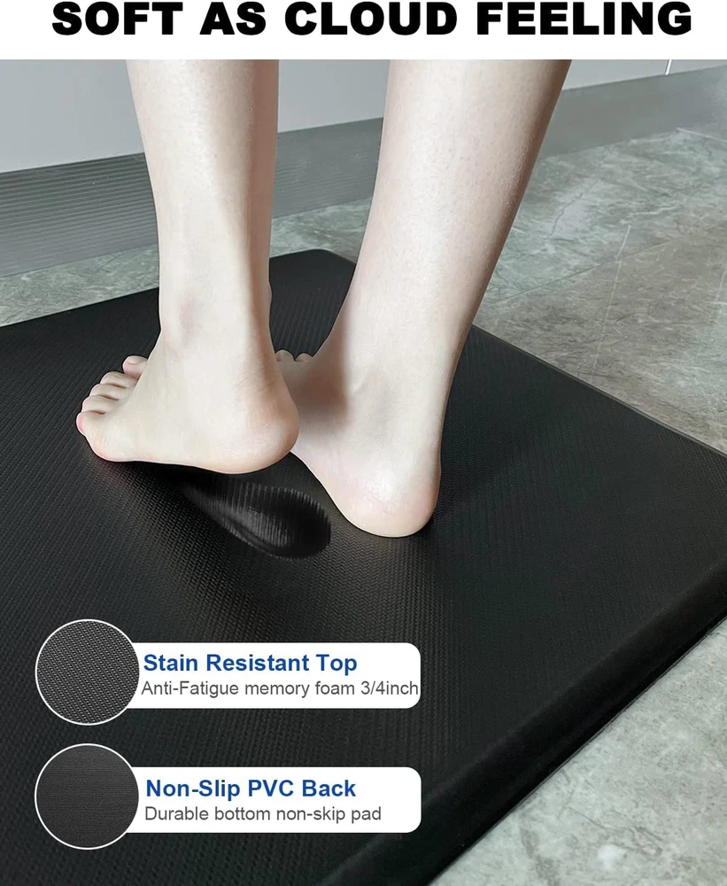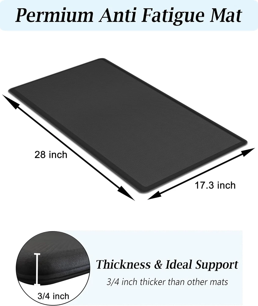 Store New Arrivals Add to Favorite View Feedback Contact Anti Fatigue Mat Standing Desk Office One Piece 0.75" Memory Foam 17.3" X 28" Description Item Thickness 0.74 Inches Additional Features Cushioned, Non-Slip Bottom, Stain Resistant, Waterproof Item Dimensions L x W x Thickness 28"L x 28"W x 0.75"Th Pattern Single Material Type Memory Foam Color Black Shape Rectangular Product Care Instructions Wipe with damp cloth or vacuum Material Type Free Phthalate Free Special Feature Cushioned, Non-Slip Bottom, Stain Resistant, Waterproof Material Memory Foam Shape Rectangular Size 28"L x 17.3"W x 0.8"Th Safe Kitchen Mat Long Runner for Home: Kitchen floor mat cushioned anti fatigue. One piece 3/4 inch thick cushioned kitchen floor mat. The anti fatigue mat standing desk office measure: 17.3"x28", perfect for standing desk,office, kitchen floor or laundry.The anti fatigue mat for standing desk is made of cushioned memory foam, high quality mat materials will not break down or compress over time. It is lightweight and could be continually used for a long time Ergonomic Kitchen Mats for Floor Anti Fatigue Mat:18mm thick mat for standing desk anti-fatigue provides more cushion and stability. This memory foam non slip kitchen rug is safer and more comfortable than others in the market. The kitchen mat anti fatigue is perfect for people who stand for long periods of time, and help relieve back pain, the pressure of your knees, and the fatigue of your feet caused by standing Non-skid Kitchen Mats Cushioned Anti Fatigue: The standing desk anti fatigue mat is designed with non-slip backing that makes the kitchen floor mats for in front of sink keep in place well, helpful to protect you from slipping and tripping. Cushioned kitchen mats for standing are stain-resistant and waterproof, simply wipe off the dirt and dust with a damp cloth or vacuum Stylish Ergonomic Floor Mats for Standing Decor: The modern black kitchen mats for floor provide an extra large activity area in work place, office, laundry room, kitchen, or any other high-traffic place. The kitchen mats cushioned anti fatigue are made of the safest memory foam material, that is no phthalate, no latex, and no odor and the neutral color matches any décor and it is a great kitchen mats for your family Cushioned Floor Mat Tips: After receiving the kitchen floor mat, you can lay the anti fatigue kitchen rugs flat and wait for some time and then the kitchen mat's surface will return to a flat state.The kitchen sink floor mat underlay should be clean, flat, and dry before placing the mat on the floor Product Description ABOUT US We offer the best prices around on high quality products. Our E-store includes media such as books, movies, music and games while offering electronics, toys, sporting apparel, clothing, tools, general home, garden items and more. SHIPPING We are always working hard to ensure your package arrives as soon as possible. Please understand that some factors like weather, high postal traffic, and the performance of shipping companies are outside of our control. We offer free shipping to the lower 48 states and ship within 2 business days of payment, usually sooner. We do not accept P.O. Boxes. Please provide a physical address. RETURNS We offer a 30-Day Return Policy on items which you are not completely satisfied with. You have the option for a full-refund or an exchange of the item. No returns are available on items shipped outside of the USA. PAYMENT We accept PayPal. CONTACT US This page content is yet to come Please ad us to your favorite seller and visit again later Thank You CUSTOMER SATISFACTION We try our very best to make sure every customer is completely satisfied. If there's a problem, message us! We're happy to help.