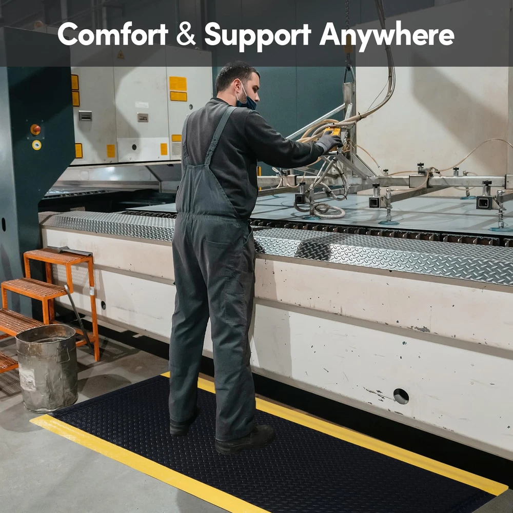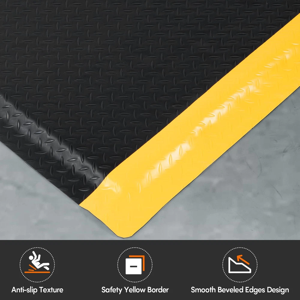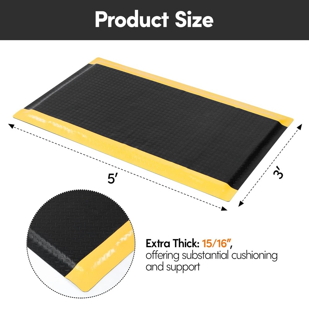 ANTI FATIGUE STANDING MAT: Antistatic anti-fatigue ground upper layer made of anti-static rubber material, the middle layer is composed of EPDM foam cotton, the bottom layer is conductive rubber, 15/16 inch thick, dimensions is 3 x 5 FT NON-SLIP SURFACE: The textured surface and smooth beveled edge design help prevent slipping and tripping. The yellow border strip design provides a warning effect. The rubber surface is bonded to the cushion, ensuring it remains firmly attached for increased longevity. VERSATILE COMFORT FLOOR MAT: Extra thick sponge mat comfortable feet, effective in reducing stress and pressure on feet, knees and lower back over long standing periods, greatly reducing the fatigue of standing for a long time. Protect products or tools dropped during work from damage, thus reducing production costs BORDER SAFETY MAT: Heavy duty Industrial floor mat Beveled edges design, more close to the ground seamless, which provides a better grip for the mat and is not easy to move. prevent tripping, fit the ground without warping, not open glue, not collapsing VERSATILE: Whether you are repairing the car in the garage, working in the factory, standing at the desk, cooking in the kitchen, or washing in the laundry, you can use this kitchen mat