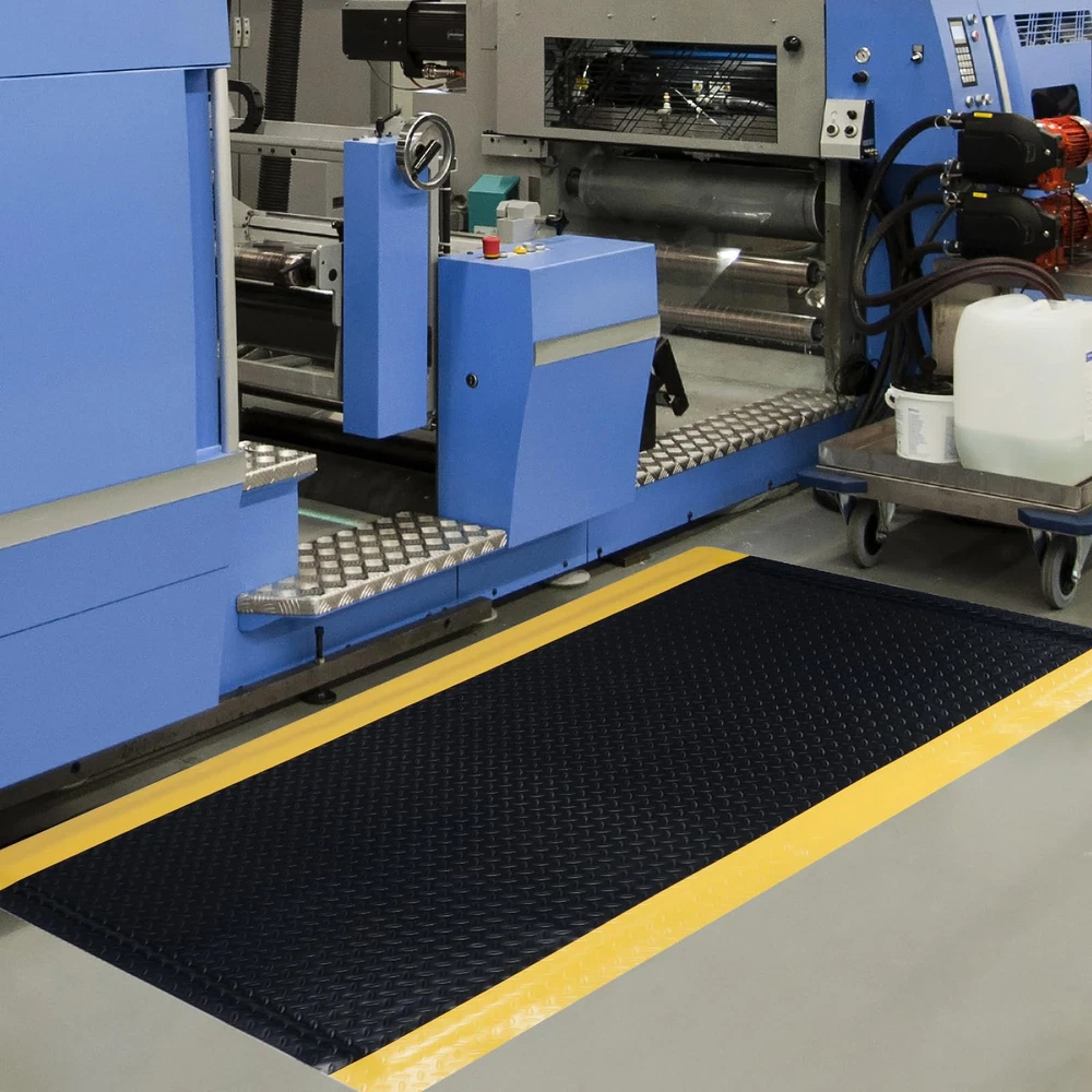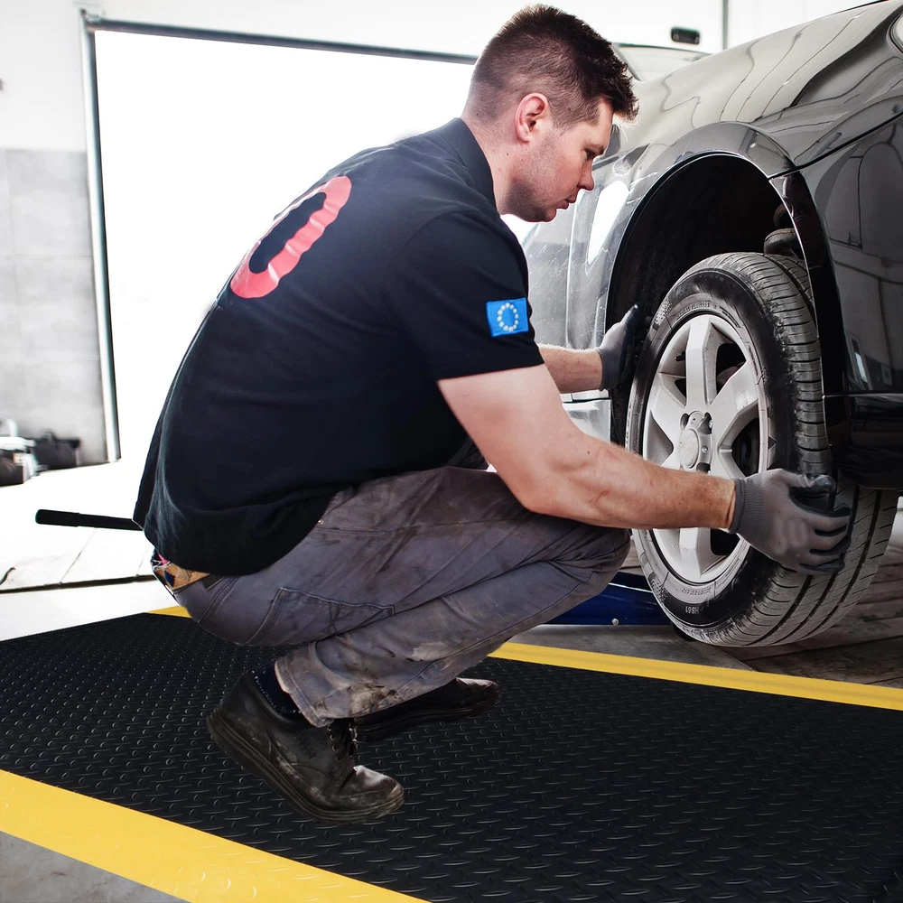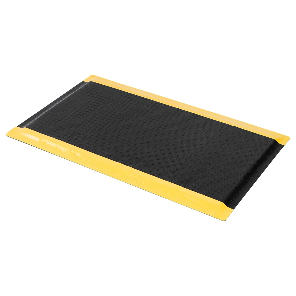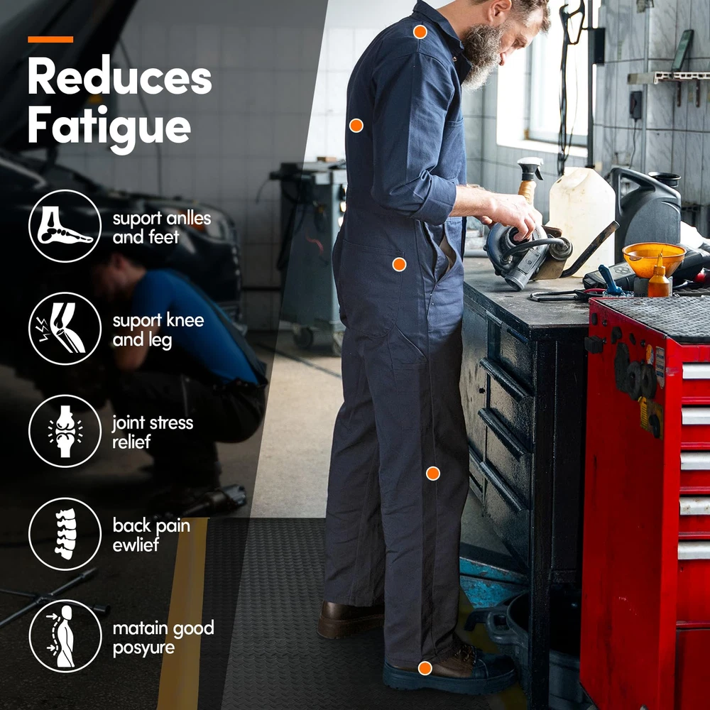 ANTI FATIGUE STANDING MAT: Antistatic anti-fatigue ground upper layer made of anti-static rubber material, the middle layer is composed of EPDM foam cotton, the bottom layer is conductive rubber, 15/16 inch thick, dimensions is 3 x 5 FT NON-SLIP SURFACE: The textured surface and smooth beveled edge design help prevent slipping and tripping. The yellow border strip design provides a warning effect. The rubber surface is bonded to the cushion, ensuring it remains firmly attached for increased longevity. VERSATILE COMFORT FLOOR MAT: Extra thick sponge mat comfortable feet, effective in reducing stress and pressure on feet, knees and lower back over long standing periods, greatly reducing the fatigue of standing for a long time. Protect products or tools dropped during work from damage, thus reducing production costs BORDER SAFETY MAT: Heavy duty Industrial floor mat Beveled edges design, more close to the ground seamless, which provides a better grip for the mat and is not easy to move. prevent tripping, fit the ground without warping, not open glue, not collapsing VERSATILE: Whether you are repairing the car in the garage, working in the factory, standing at the desk, cooking in the kitchen, or washing in the laundry, you can use this kitchen mat
