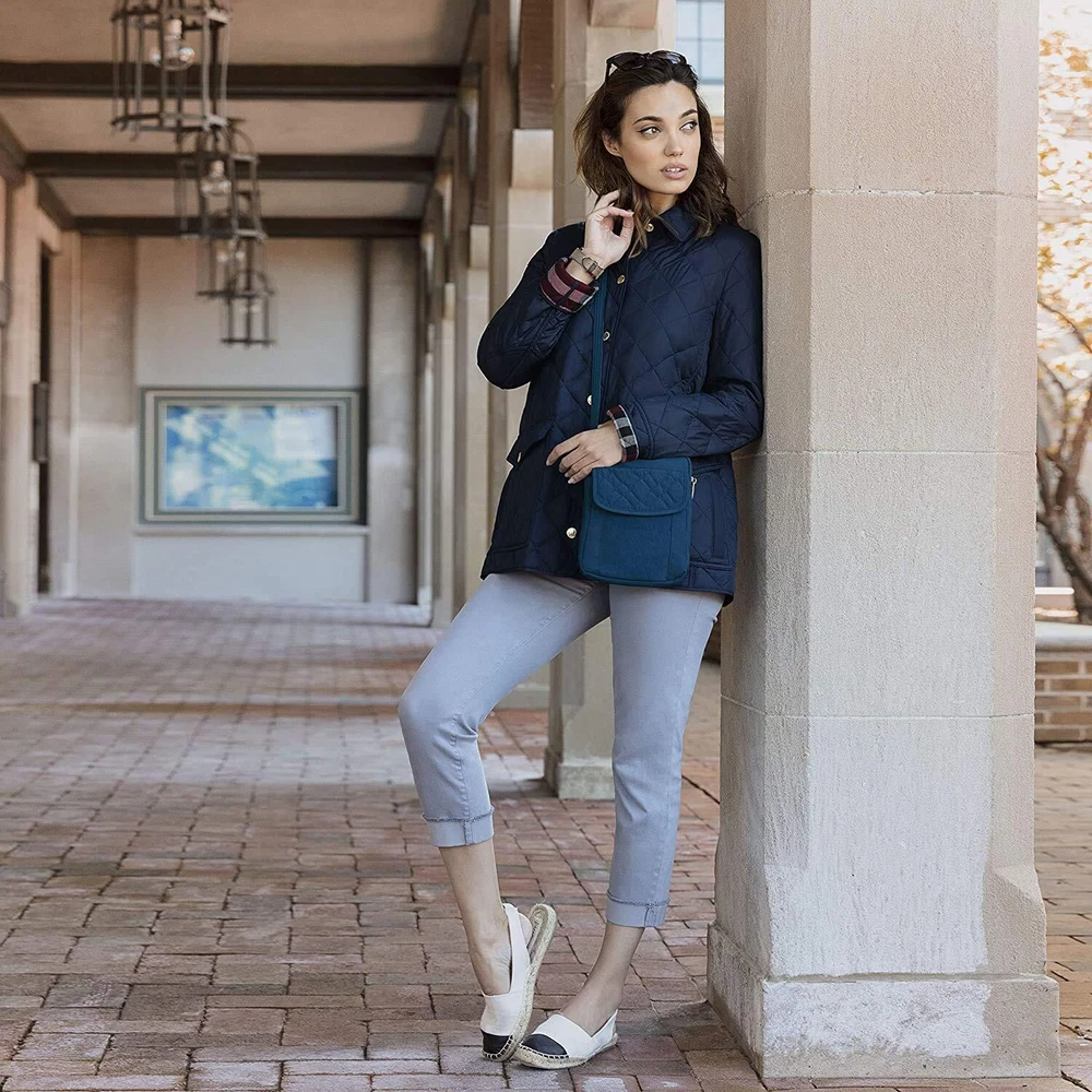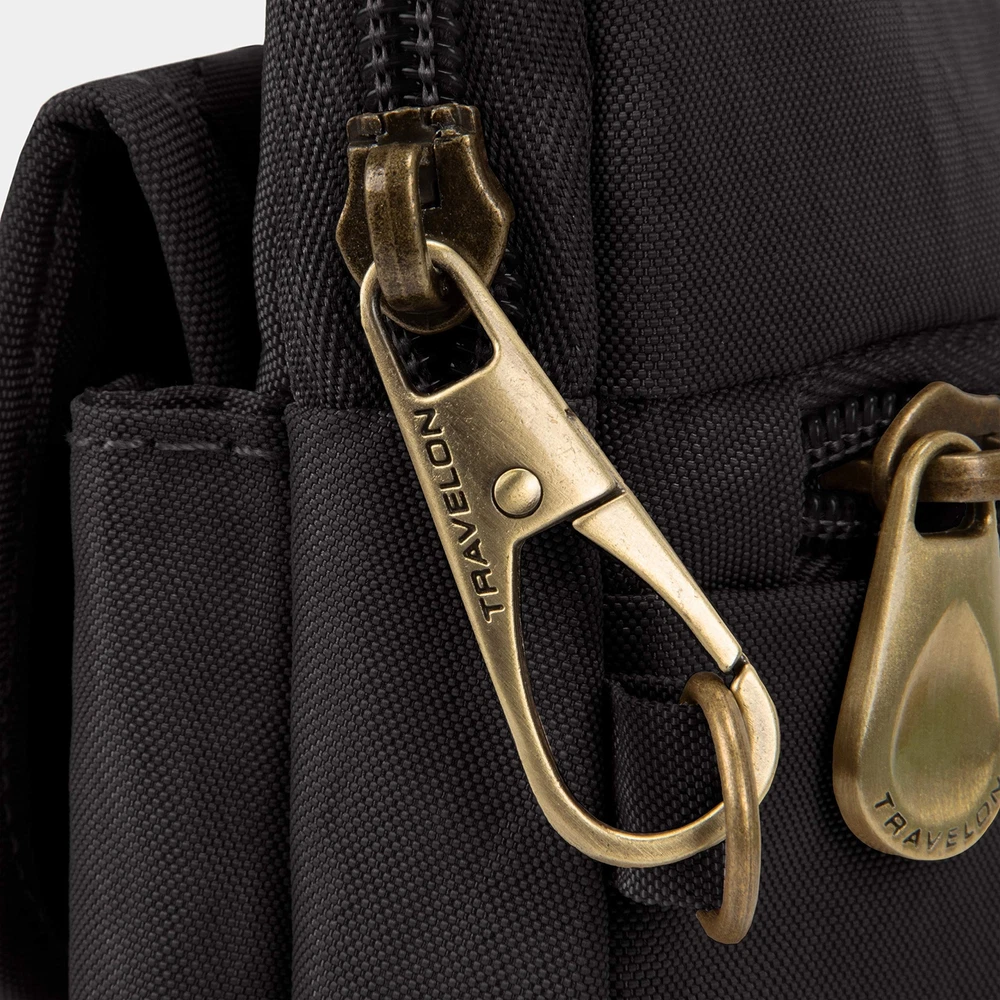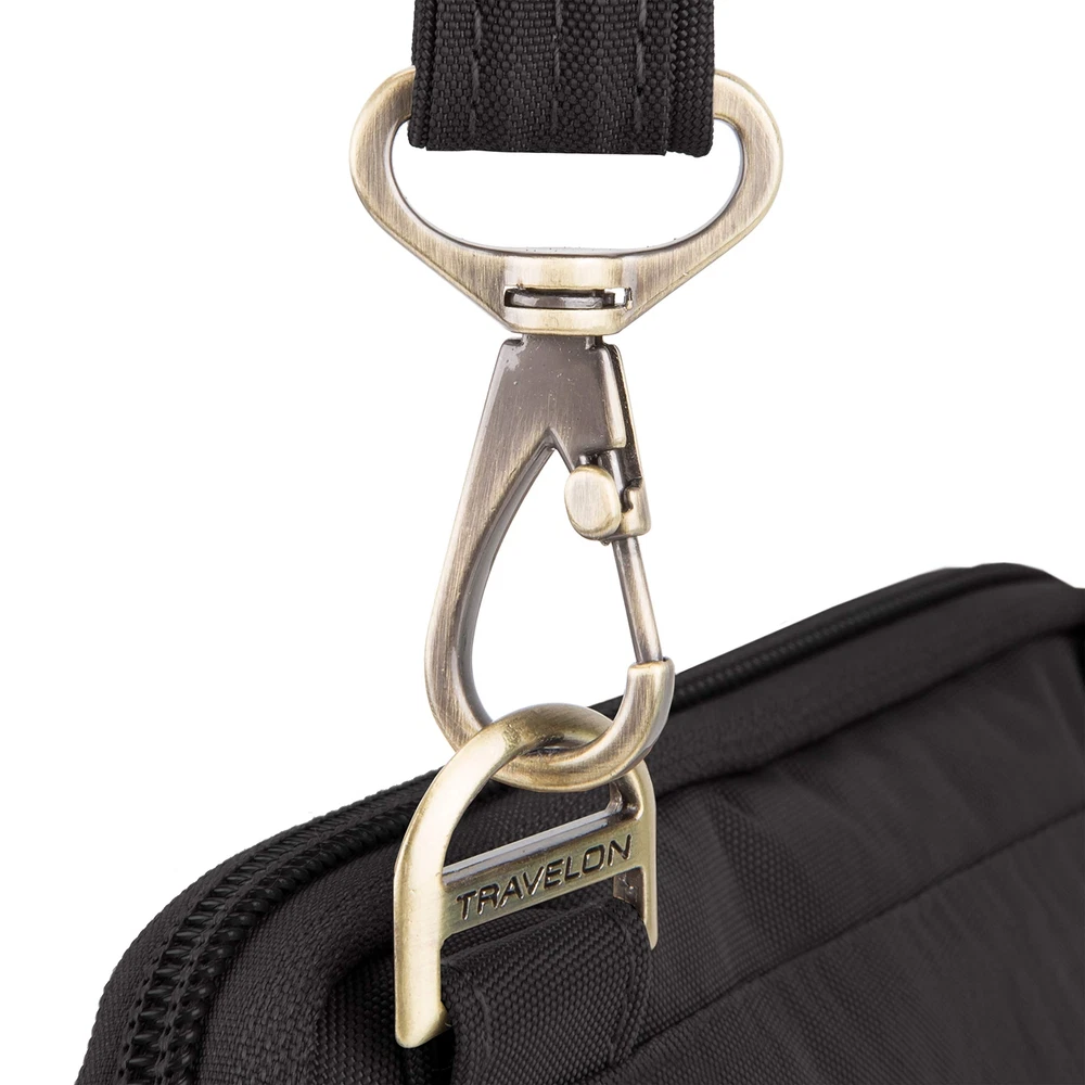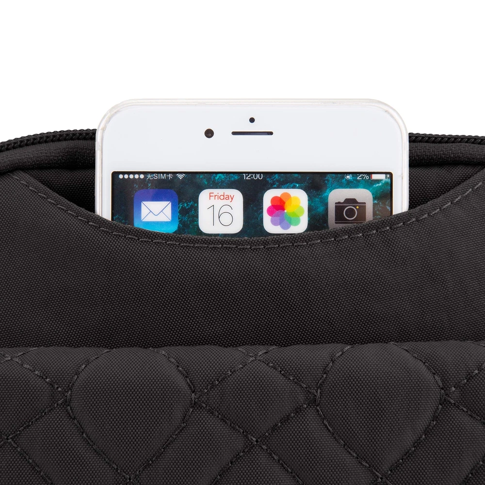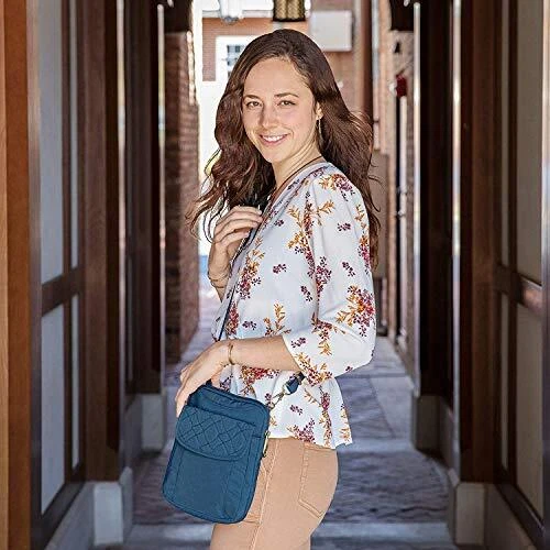 Description The Anti-Theft Signature Quilted Slim Pouch has a small frame but still features a roomy enough interior to keep all your essentials at your side. The deep main compartment has 3 RFID blocking card slots, a RFID Passport Pocket, a zippered wall pocket, a tethered key clip plus it is deep enough to carry a Mini iPad. The slash and cut resistant shoulder strap is adjustable allowing you to find the perfect fit and the locking swivel clasp prevents the strap from tangling plus it can be attached to a stationary object to prevent a grab-no-go. The front flap pocket has a hidden magnetic closure to keep your items secure and is perfect for quick grab items. A front slash pocket keeps your smartphone easily accessible and the rear zipper pocket keeps your items organized. This bag is versatile and can be carried as a Crossbody for hands-free convenience or traditionally over your shoulder. Made from durable, water and stain resistant nylon material an accented in beautiful antique brass finished hardware. The timeless shape and minimalist style mean you can carry this bag season after season and always look on trend. 5-Point Anti-Theftsecurity system, Locking zippered main compartment has 3 RFID blocking card slots, a RFID Passport pocket, a zippered wall pocket plus a tethered key clip Main compartment has full zipper opening allowing you easy access to your items Slash and cut resistant, adjustable straps and body panels Front slash pocket for easy access to your smartphone Size: 7" x 8.5" x 2", Strap Drop Length 15" - 28", Strap Length 59", Weight: 0.55 lbs