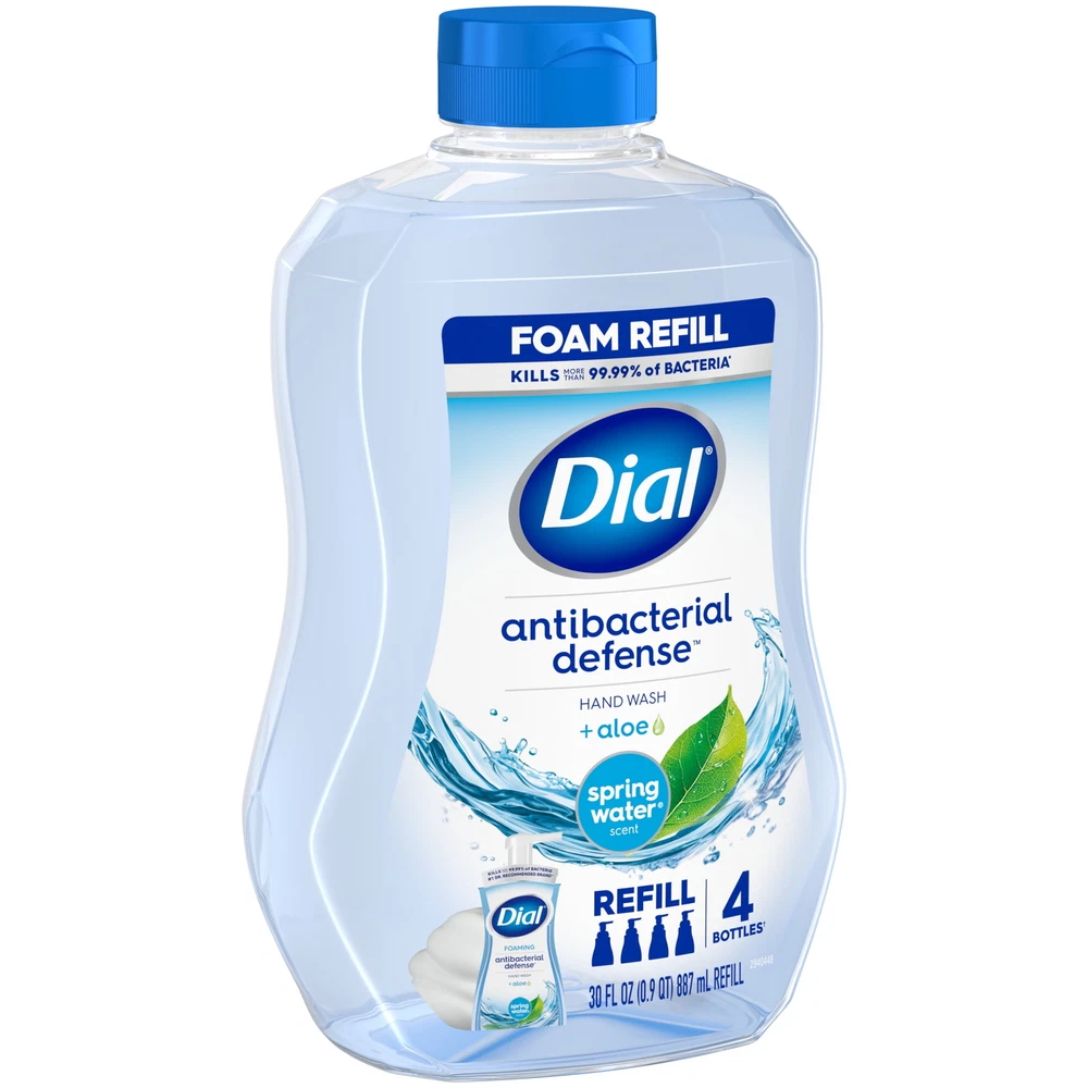 Enjoy the fresh scent of Dial Antibacterial Defense Spring Water foaming hand wash refill. Includes enough product to refill 4 Dial foaming hand wash bottles†. This formula contains aloe vera and kills more than 99.99% of bacteria* while being gentle on skin, leaving it feeling soft, smooth, & healthy. The #1 Doctor recommended antibacterial hand soap brand is dermatologist tested & approved as cruelty free under the Leaping Bunny program. This package contains 30 fluid ounces of Dial hand wash. *Encountered in household settings †Refills 4 Dial Foaming Hand Wash 7.5 fl oz Bottles Kills more than 99.99% of bacteria encountered in household settings. This foaming hand wash refill includes enough product to refill 4 Dial foaming hand wash bottles†. †Refills 4 Dial Foaming Hand Wash #1 Doctor Recommended antibacterial hand soap brand. This gentle pH balanced formula contains aloe vera and is dermatologist tested and cruelty free approved under the Leaping Bunny program. FREE FROM: -Sodium lauryl sulfate/Sodium laureth sulfate -Parabens -Phthalates -Silicones