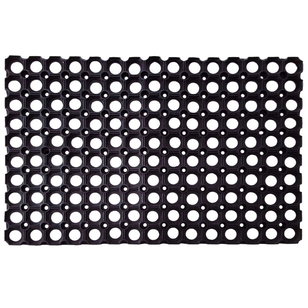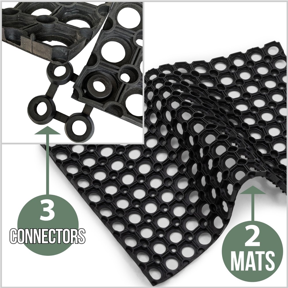 Rubber Mat With Drain Holes: The drainage holes allow liquid and waste to pass through, making this rubber matting easy to clean and stain resistant, providing a clean, dry, and safe work area Anti-Fatigue Mat: Anti-fatigue properties provide all-day comfort when standing for long periods. Perfect for in-plant applications including workstations, assembly lines, and more Home, Industrial, Commercial Use: Ideal for kitchens, food service environments like restaurants and bars, auto body shops, mechanic garages, as well as industrial applications Size/Design: Measuring 24 x 16 inches (61 x 40.6 cm). Low-profile design, 5/8 inch thick (16 mm), for indoor or outdoor use. Small pins on the bottom keep the mat up off the floor so water can drain beneath Includes: 2 interlocking drainage mats and 3 connectors