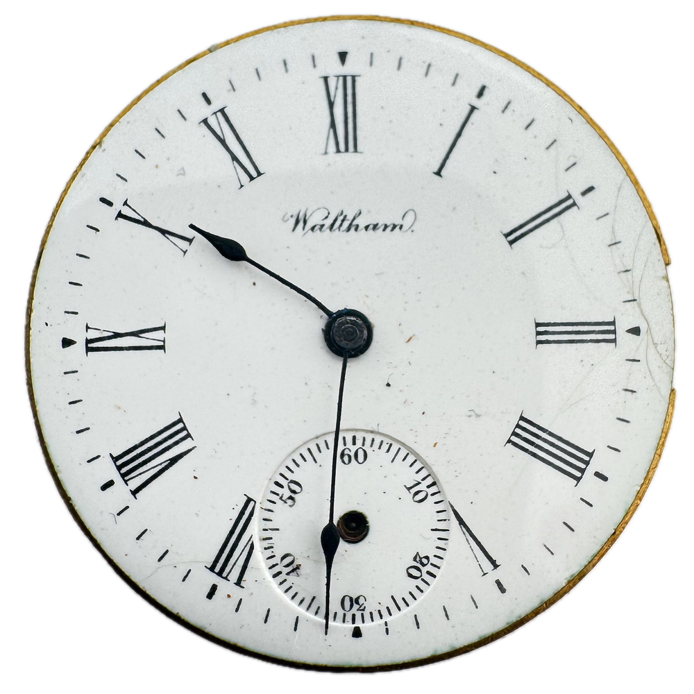 Antique 0s 1899 Waltham 7 Jewel Hunter Pocket Watch Movement Seaside USA Product Description Item: Pocket Watch Movement Brand: Waltham Movement: Mechanical Production Year: 1899 Country: USA Jewels: 7 Jewel Gender: Men's Grade: Seaside Size: 0s Product Measurements Diameter: 29.5mm Product Condition Overall Condition: Fair, overall condition for its age. Functions: Not running but the balance complete is in good condition. Dial: The dial has hairline crack(s) on it. Hands: It is missing the second hand.