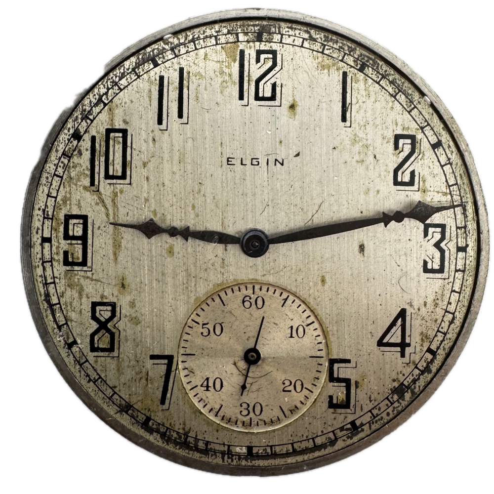 Antique 12 Size 1925 Elgin Brushed 15 Jewel Pocket Watch Movement 315 USA Product Description Item: Pocket Watch Movement Brand: Elgin Model: Brushed Movement: Mechanical Production Year: 1925 Country: USA Jewels: 15 Jewel Gender: Men's Grade: 315 Size: 12 Size Product Measurements Diameter: 39.5mm Product Condition Overall Condition: Poor, overall condition for its age. Functions: Not running as it is for parts Dial: The dial has scratches on it.
