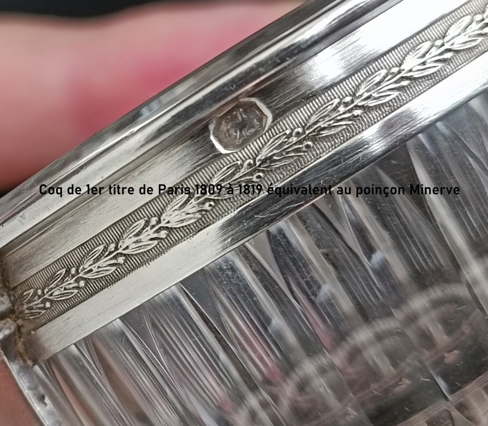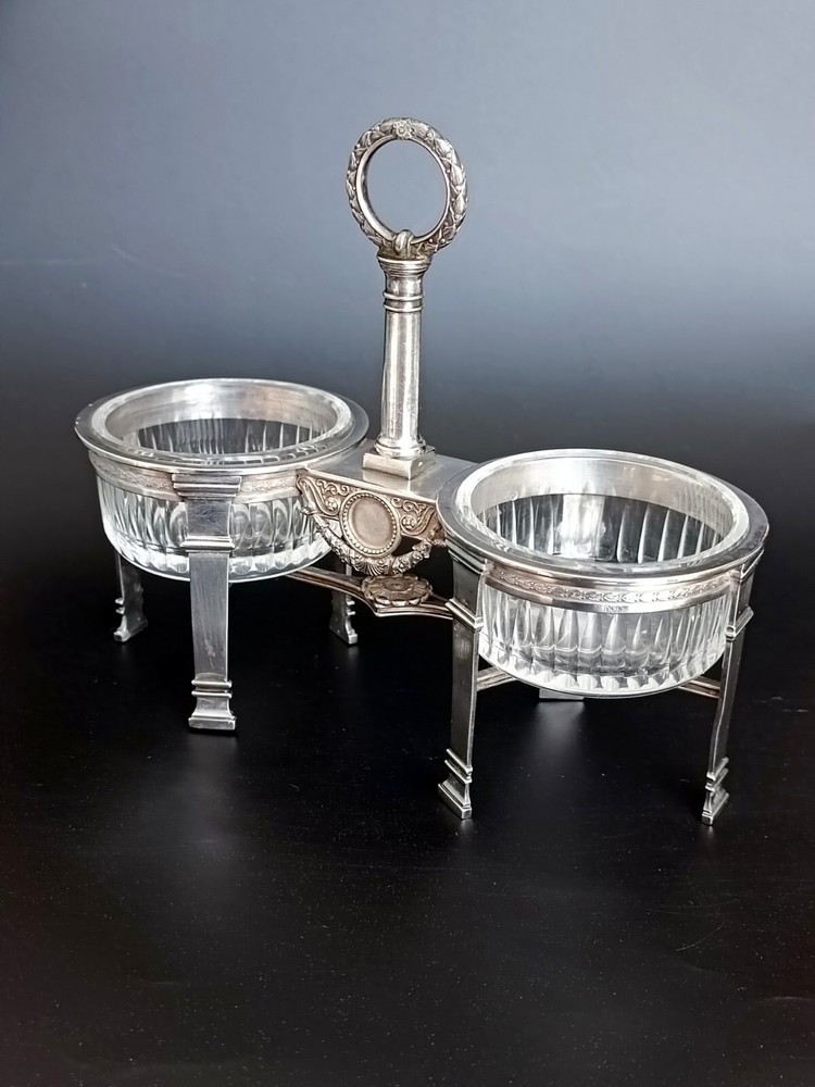 Ancien saleron saliere en argent Empire 1809-1819 N2 Magnifique travail d'argent, finement ciselé, typique de la décoration Empire. Pots en cristal d'origine en bon état, sans dommages. La structure en argent est estampillée du poinçon Coq de 1er titre de Paris (en usage de 1809 à 1819, équivalent au poinçon Minerve de 1er titre actuel), des poinçons de garantie utilisés à cette époque, et du poinçon de l'orfèvre Jean-Charles Cahier. JC Cahier était l'orfèvre officiel des rois français Louis XVIII et Charles X. Hauteur : 15 cm Poids 218 g