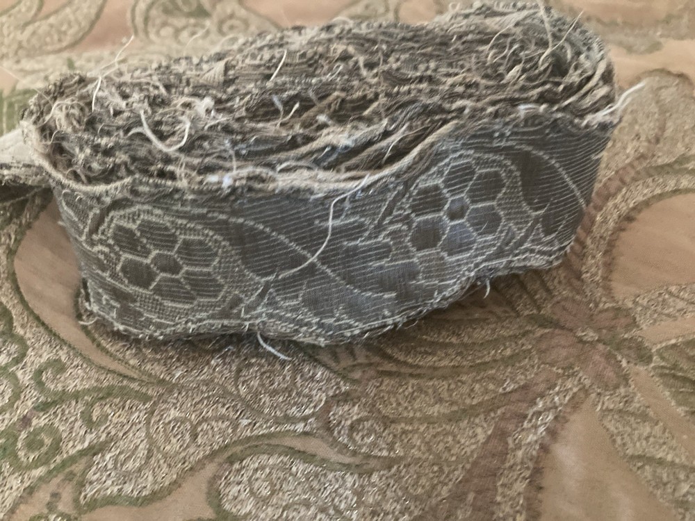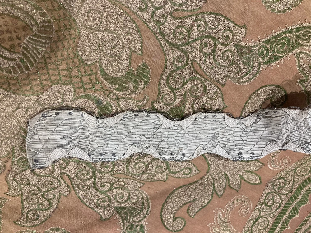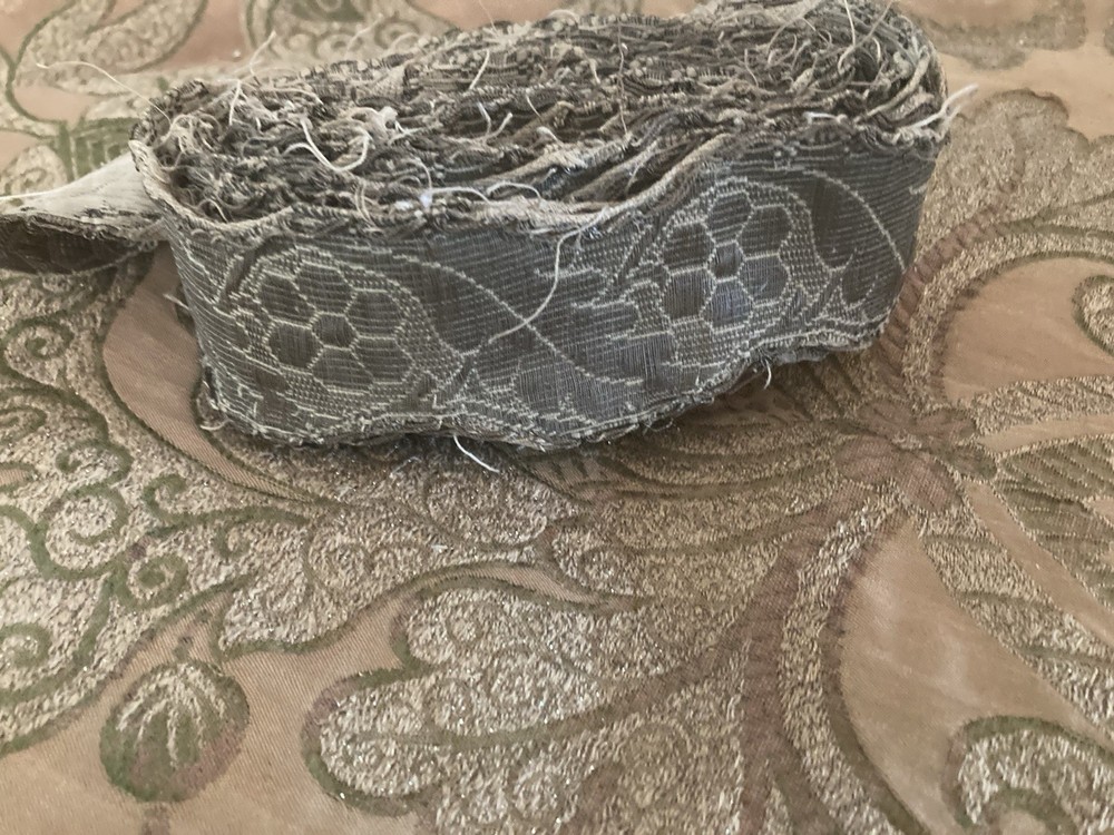 Exquisite and rare antique galloon trim from the 19th century , measuring 183 inches in length and 2 inches wide. This decorative textile features an elegant woven pattern of angular stems, florals, and stylized leaves , enhanced with light metallic silver thread that adds a subtle shimmer. The trim is finished with scalloped edges and fine looped detailing, typical of 19th-century European furnishing trims. Ideal for historical restoration, museum-quality projects, or as a striking accent in fine costume design or textile art. 🪡 Features: Type: Antique Galloon / Furnishing Trim Origin: 19th Century (likely European) Color: Soft sage green with light metallic silver threading Design: Angular florals and leaf motifs with scalloped and looped edges Material: Likely a blend of silk, cotton, and metallic threads Length: Approx. 183″ (15′ 3″ / 4.65 yards) Width: Approx. 2″ 🧵 Condition: Overall in great antique condition , with some loose threads consistent with age. The structure and design remain intact and display beautifully. 💡 Perfect For: Antique textile collectors Historic costume or set designers Restoration of period furnishings Decorative arts and craft projects Museum-quality textile work Please view all photos carefully—they are part of the description. Feel free to message with any questions. Fast and careful shipping !