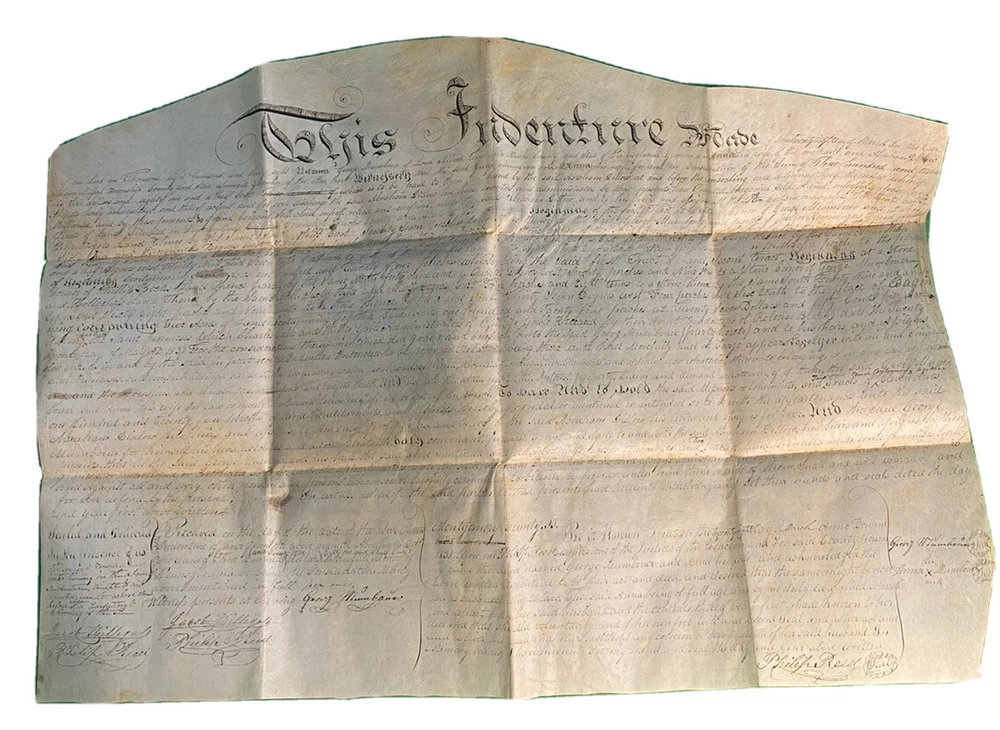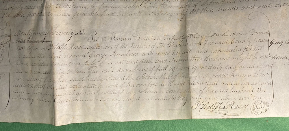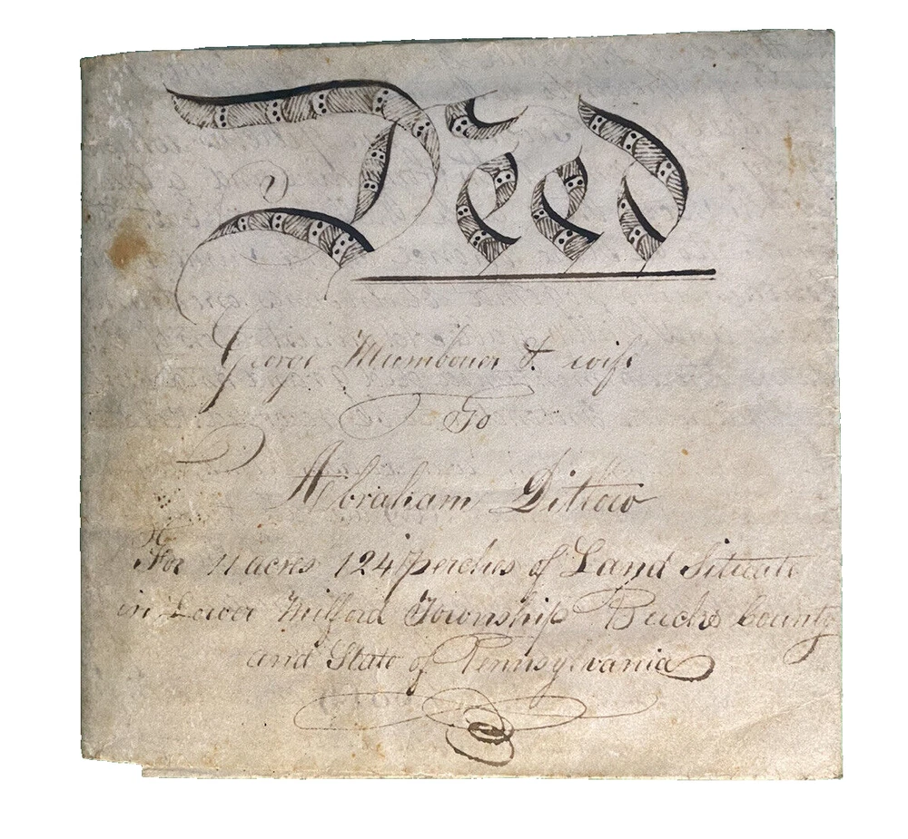 Antique 1838 Milford Township, Bucks County Pennsylvania PA Vellum Indenture ~ 28x19 in George Mumbouer & Wife to Abraham Dittoco 124 perches of land situated in Lower Milford Township Bucks County Pennsylvania Signed & Witnessed by Justice Philip Reed
