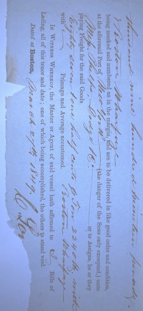 Original bill of lading dated March 27, 1849, documenting a coastal voyage from Boston to New York aboard the schooner Homer. The shipment records 766 bars of copper consigned to Phelps Dodge & Co., with freight rates and Boston wharfage charges noted. The document is signed by John Nickerson, master of the schooner. Period ink on a printed form. Expected folds, edge wear, and light toning consistent with age. Handwriting remains strong and fully legible. Docketed on the verso with shipment details and date. A scarce example of mid-19th-century American maritime and commercial ephemera, especially notable for its early copper cargo and named consignee. 🏠Helping special treasures find their new homes. Reasonable offers always welcome! ✨ I take pride in careful packaging to ensure your item arrives safely. Please buy with confidence – I maintain 100% positive feedback.