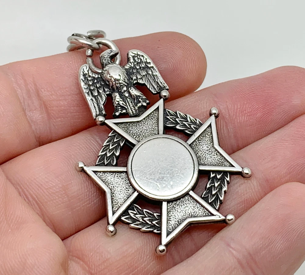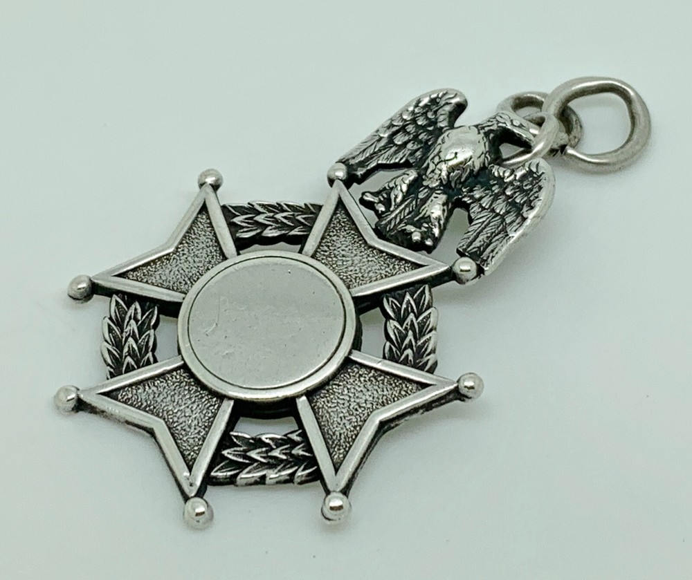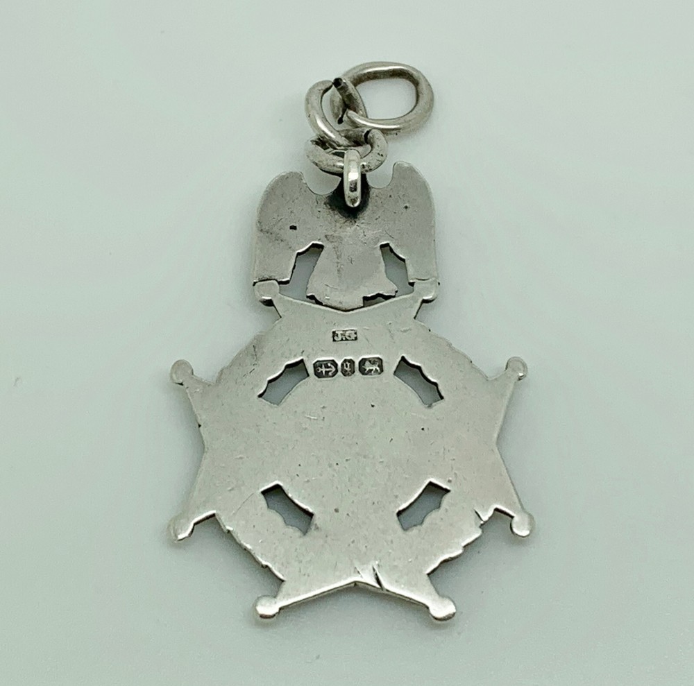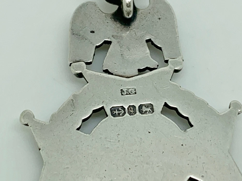 A superb antique victorian (hallmarked for 1890) english sterling silver large medal watch fob in rare design, an eagle sitting on top of a cross. A design I have never seen before and will likely never see another, it looks some like a military order! A lovely quality piece. Maker/Markings: Marked with english hallmark - JG for Joseph Gloster, Lion Passant, Anchor, Date Letter q for 1890 Condition: Very Good Used Condition, general wear/patina - Please look at photos Measurements: 2.5" drop inc bails - 1 7/8" long x 1 1/4" wide ~ 62 - 48 x 32mm Weight: 17g Combined Shipping on all items SC5658-49 Antique Victorian 1890 Sterling Silver Rare Eagle on Cross Large Medal Watch Fob
