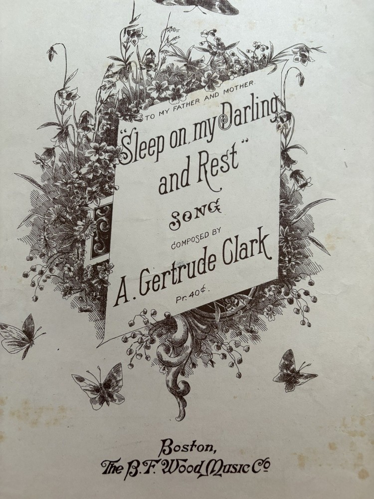 Includes: New Songs Worth Singing This product is an antique sheet music from 1895 featuring the songs "Sleep in My Darling" and "Rest" by Gertrude Clark. The sheet music is for piano and is published by B. F. Wood Music in Boston, United States. The materials for this product were sourced from Monaco, blending a touch of international flair into its American roots. Perfect for collectors or enthusiasts of vintage and antique sheet music, this item offers a glimpse into the musical landscape of the late 19th century. The "spine" area is taped. I don't know if that is part of the original distribution or if it was added later
