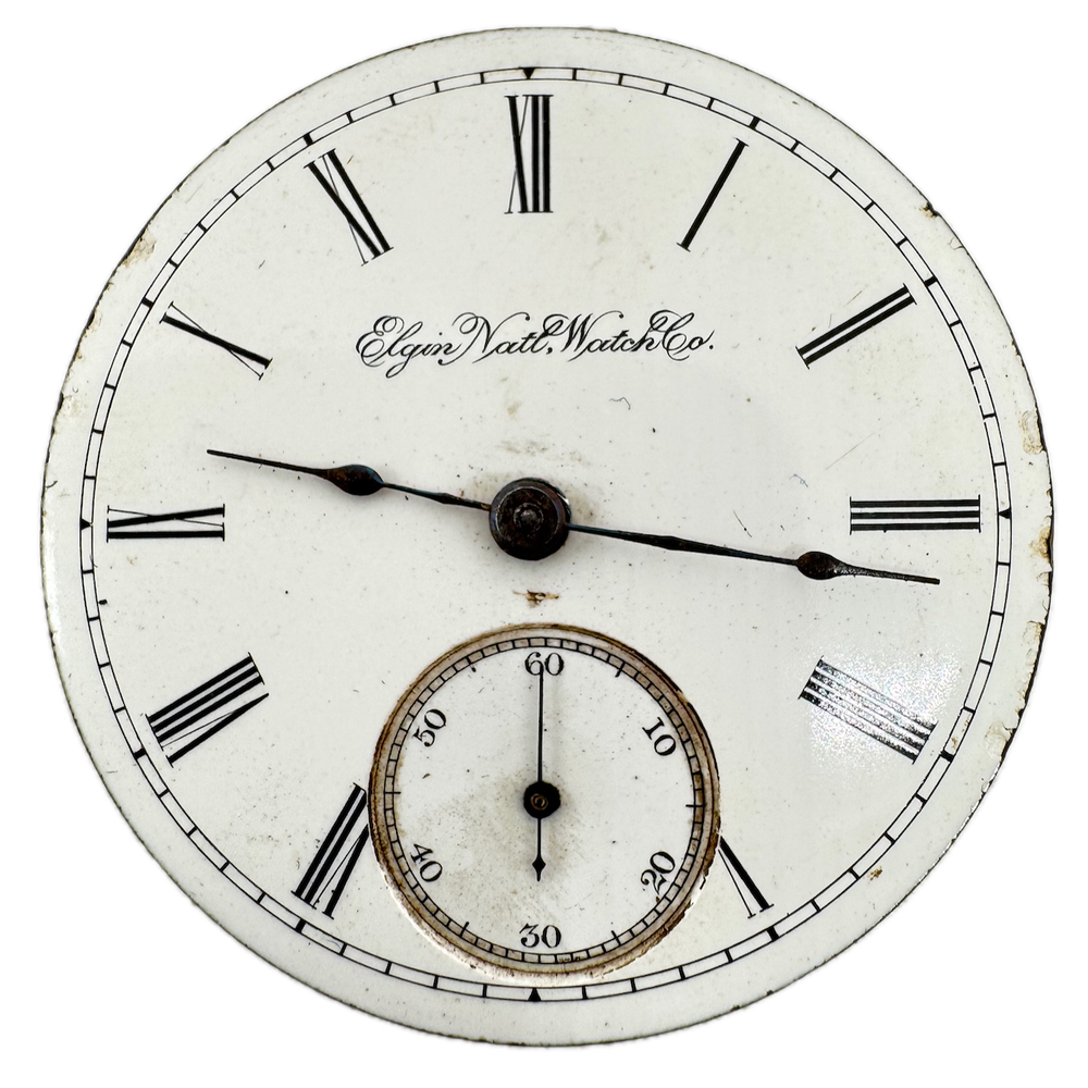 Antique 18s 1894 Elgin 7 Jewel Mechanical Pocket Watch Movement 73 USA Product Description Item: Pocket Watch Movement Brand: Elgin Movement: Mechanical Production Year: 1894 Country: USA Jewels: 7 Jewel Gender: Men's Grade: 73 Size: 18s Product Measurements Diameter: 45.5mm Product Condition Overall Condition: Poor, overall condition for its age. Functions: Not running, the Balance staff is broken. Dial: The dial has chips on it. Hands: There is discoloration on the hands.