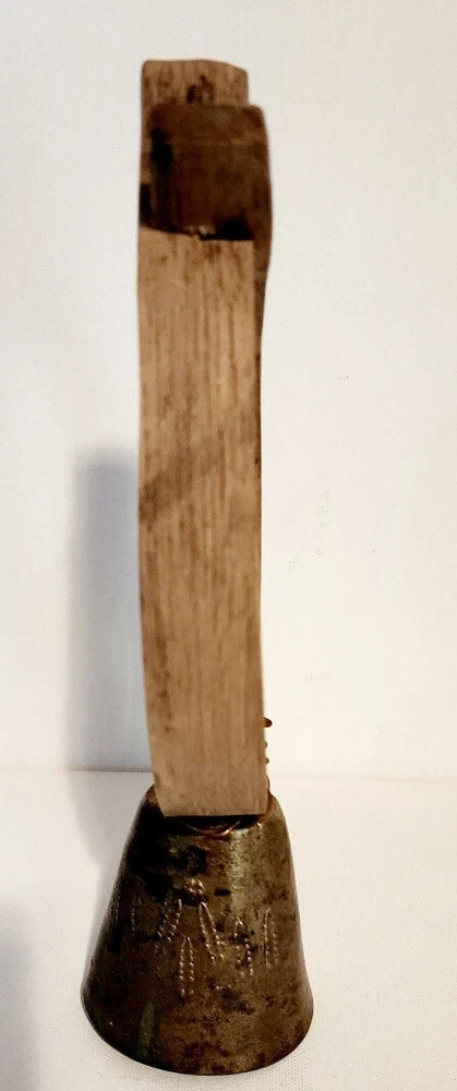 Antique 1900's Primitive Sheep or Goat Bell with a Bent Wood Collar. This is 10.5" tall x 4" wide, bell is about 3" long. Nice relief detail on both sides of the bell, and a nice ring to this!