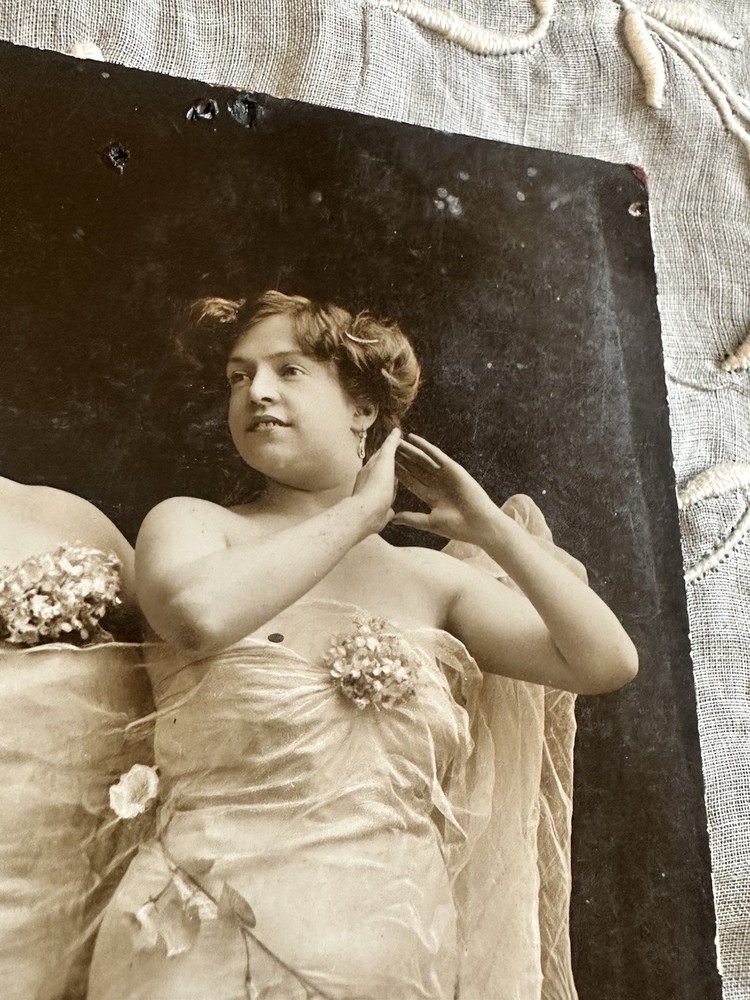 Charming and lovely, antique 1910s mermaid dress, ladies RPPC photo postcard. Most likely German made. Both cards are unused or unpost marked, but they do have some condition issues. Offering free USPS Ground Advantage Shipping! The card measures 3” 3/8 wide by 5” 3/8 long. The biggest flaws are some pin holes on the top and bottom front and back of the photo. There’s also some age stains on the box so the card as well. Also, please note, there’s some paper loss on the sides of the card as well as some paper curling and loss on some corners. There’s also some dark age marks/stains on the back of the card. There’s also some wear/aging/spots on places the photo as well. Selling as is/as found because of the noted flaws and condition. Makes a nice new addition to your antique RPPC photo postcard collection. Thanks for your interest!