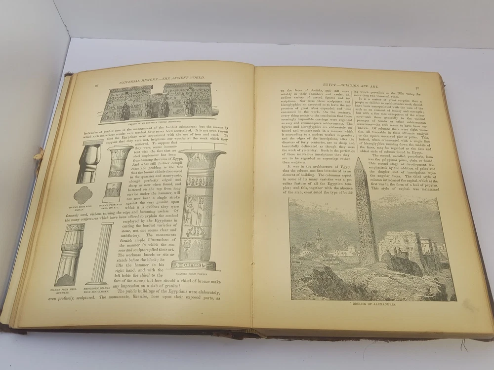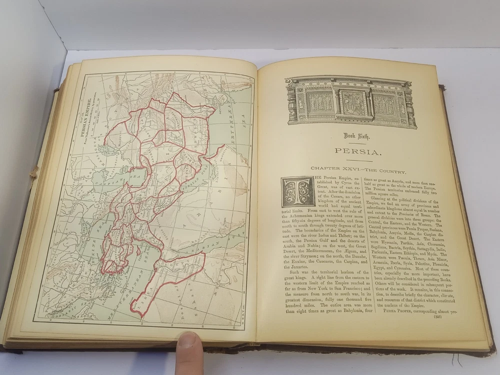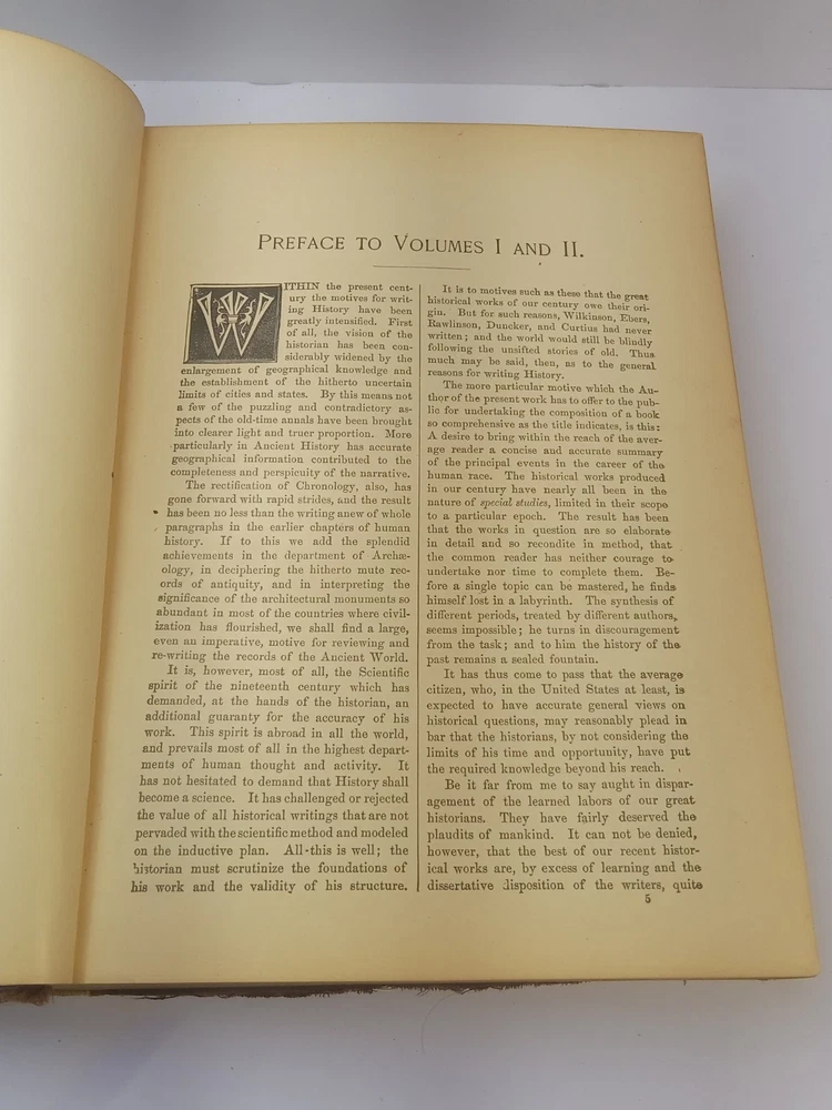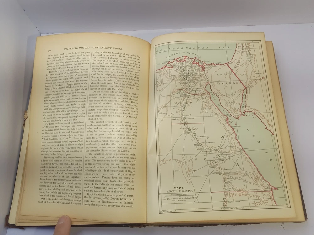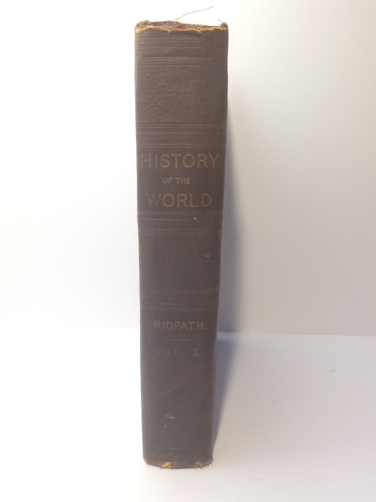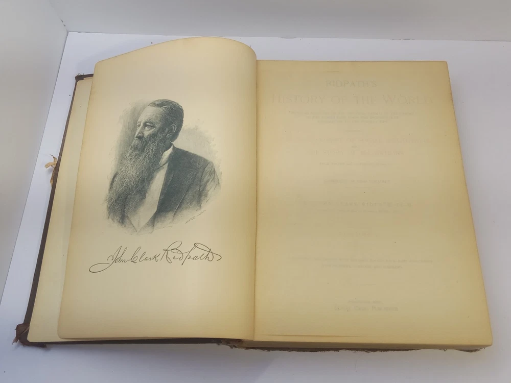 The product is an antique 1901 Ridpath's History of the World Volume I, bound in leather and illustrated. Written by author Ridpath, John Clark, this book was published by Jones Brothers Publishing Company in Cincinnati, Ohio, U.S.A. Focusing on world history, this original print from 1901 provides a unique glimpse into the past with its detailed content and visually captivating maps and illustrations. A valuable addition to any collector's library, this piece of history is a tangible reminder of our shared global heritage.