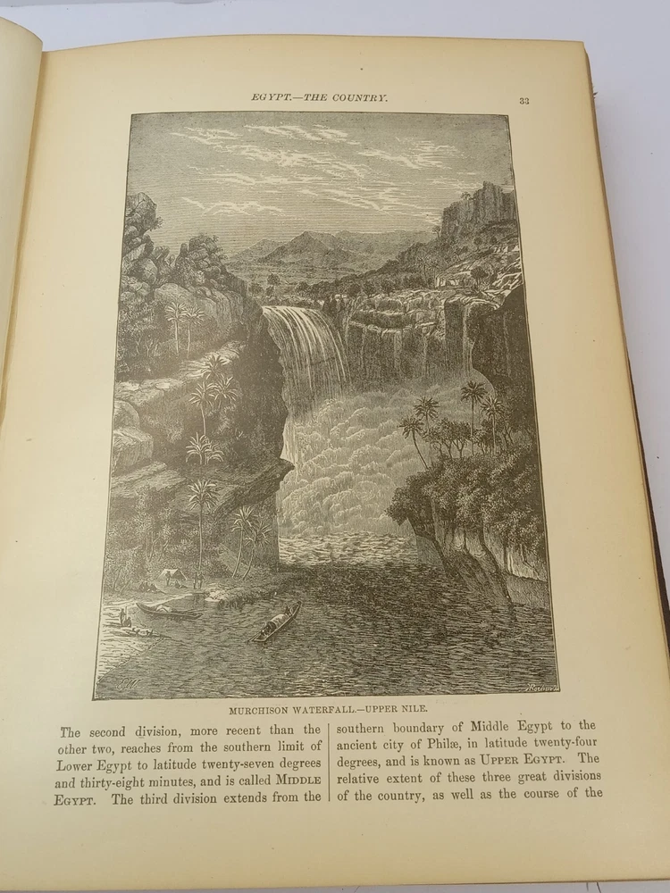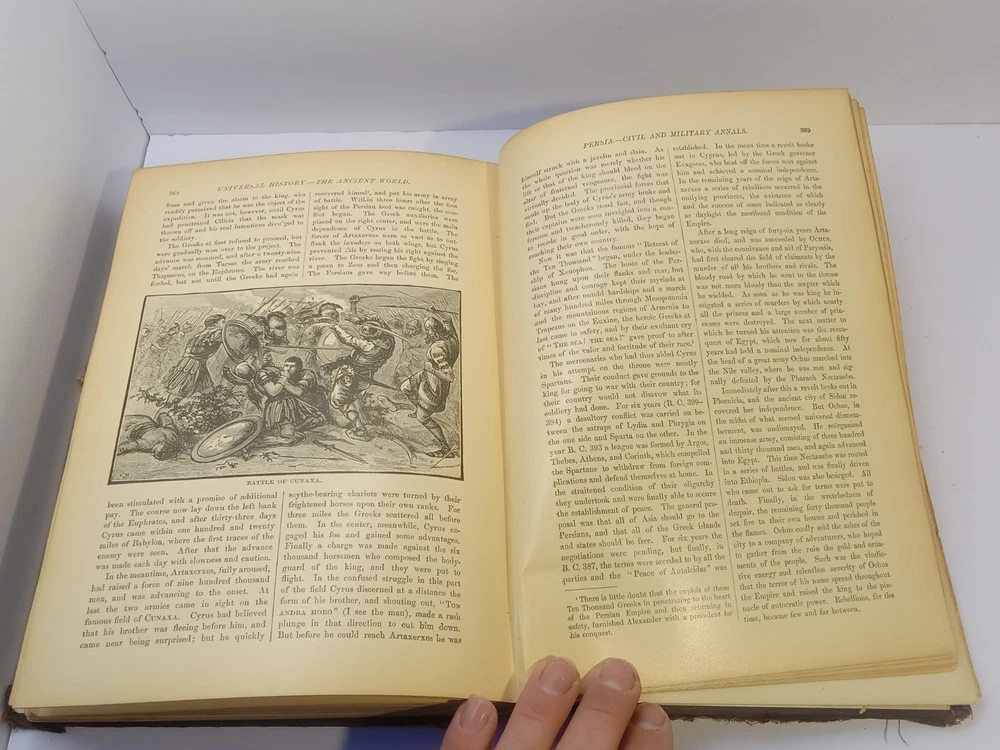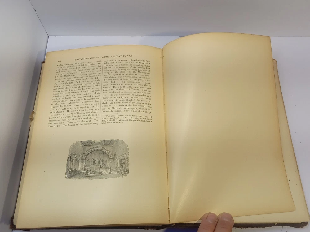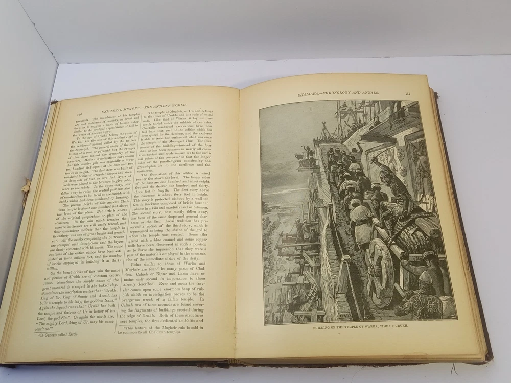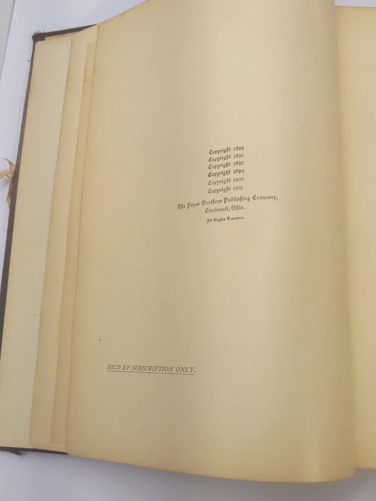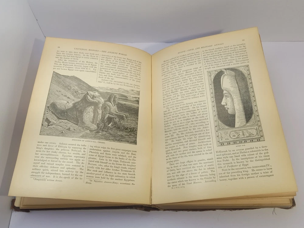 The product is an antique 1901 Ridpath's History of the World Volume I, bound in leather and illustrated. Written by author Ridpath, John Clark, this book was published by Jones Brothers Publishing Company in Cincinnati, Ohio, U.S.A. Focusing on world history, this original print from 1901 provides a unique glimpse into the past with its detailed content and visually captivating maps and illustrations. A valuable addition to any collector's library, this piece of history is a tangible reminder of our shared global heritage.