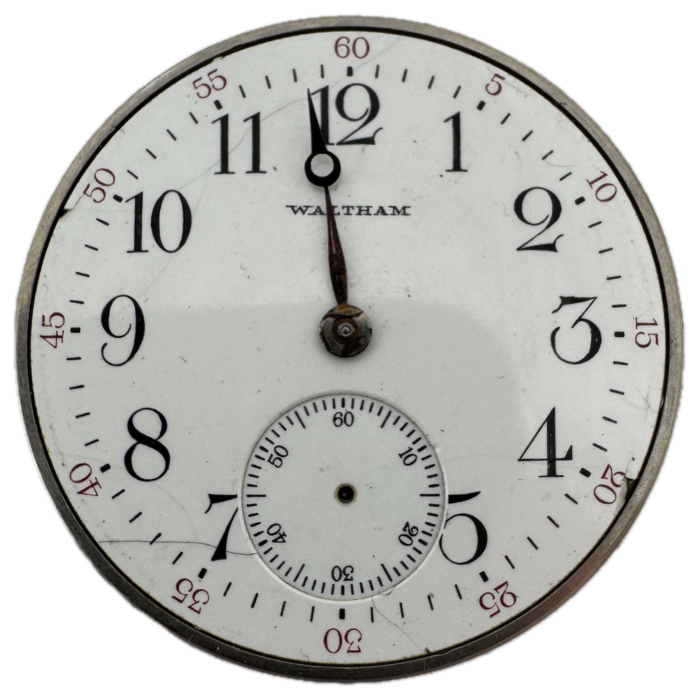 Antique 12s 1909 Waltham 7 Jewel Mechanical Pocket Watch Movement 210 USA Product Description Item: Pocket Watch Movement Brand: Waltham Movement: Mechanical Production Year: 1909 Country: USA Jewels: 7 Jewel Gender: Men's Grade: 210 Size: 12s Product Measurements Diameter: 39.5mm Product Condition Overall Condition: Poor, overall condition for its age. Functions: Not running but the balance complete is in good condition. Dial: The dial has hairline crack(s) on it. Hands: It is missing minute and second hand. There is discoloration on the hands.