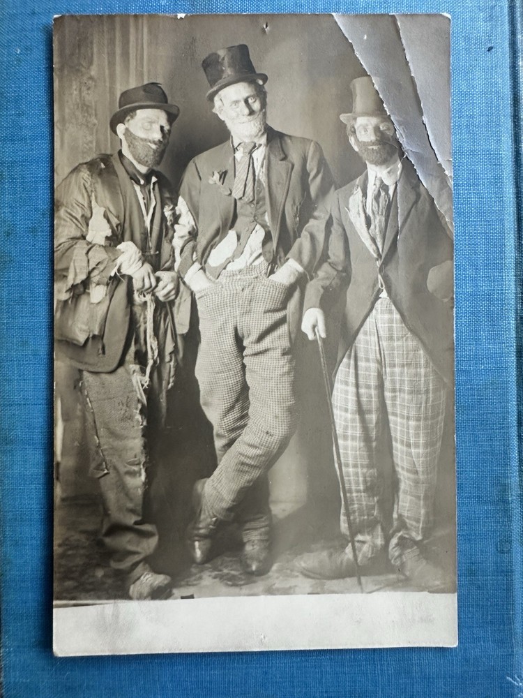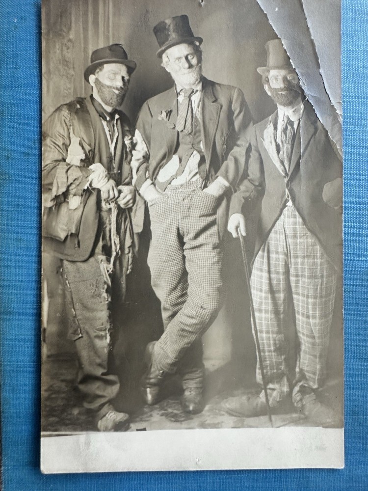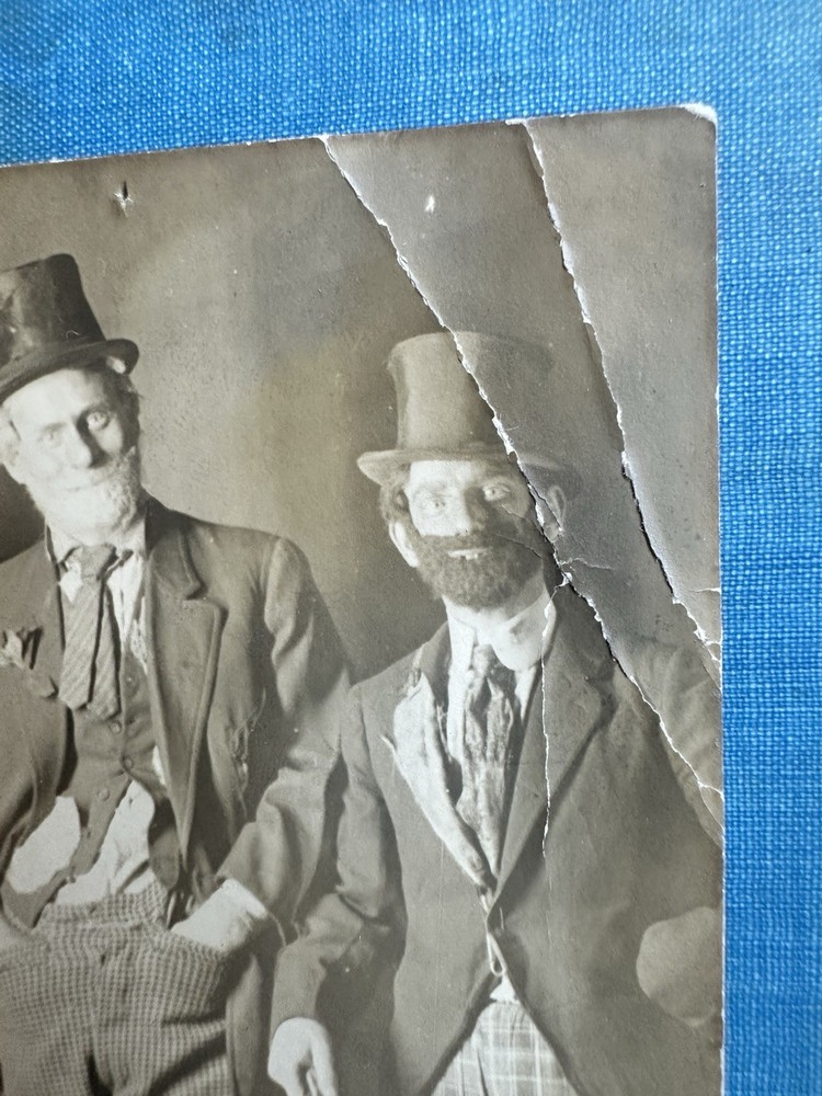 Neat, and fun, antique 1910s/20s Halloween party, men in hobo/clown costumes. The card’s in used condition flaws, mainly the major creasing on the top, right corner. Offering free USPS Ground Advantage shipping! It measures 5” 3/8 long by 3” 3/8 wide. The card is unused/unsent. Also, please note, there’s some age stains, paper loss, some small holes from being mounted, and some creases on the back as well. There’s also a former tag stain on the back, as well as some wear and paper curling on the corners. Selling as is/as found, because of the noted flaws and condition. A must have for antique Halloween ephemera, enthusiasts. A delightful, addition to any collection. Thanks for your interest!