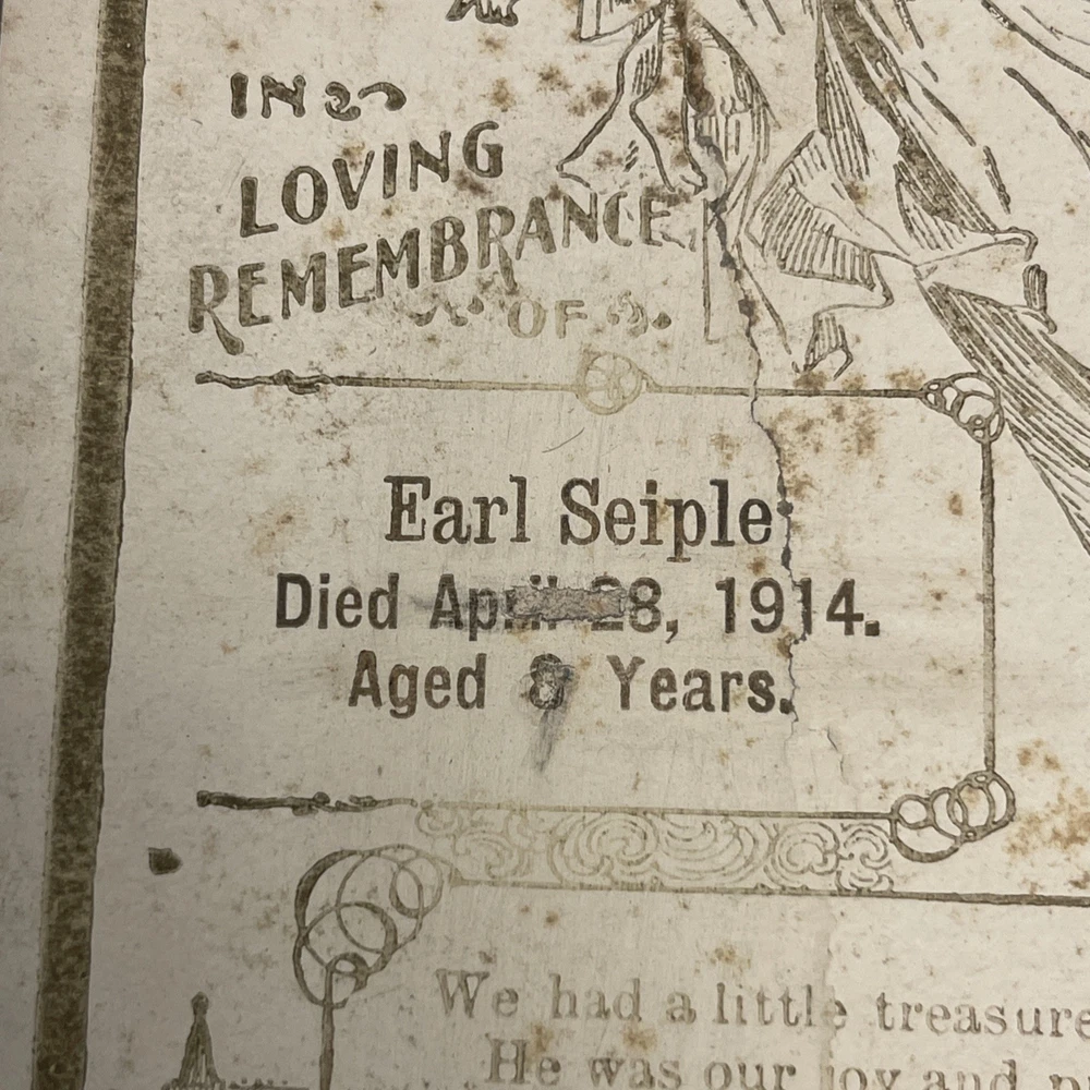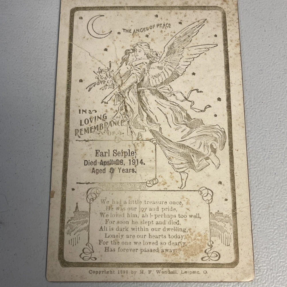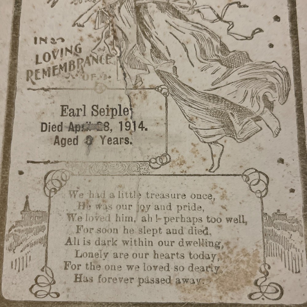 This product is an antique child death notice from 1914, designed in gold and white colors. It is a collectible item originating from the United States, likely serving as a heartfelt tribute or remembrance for a child who passed away. The paper ephemera captures a piece of history and serves as a sentimental keepsake for those who remember the child. T hank you for looking. This item is from a smoke free home. Please view all the photos. Check out all my other items.