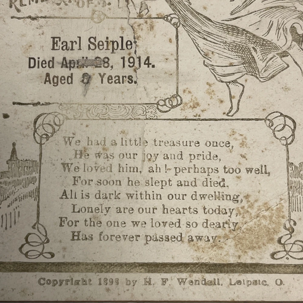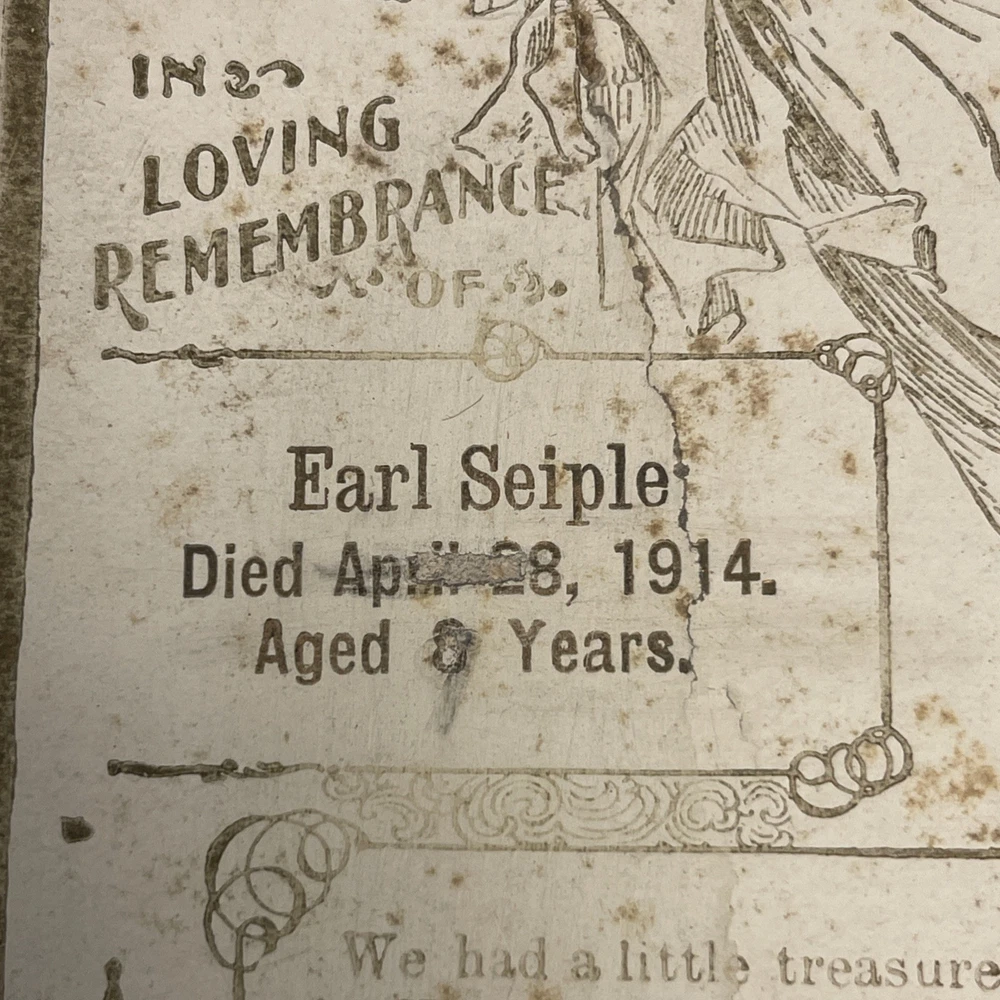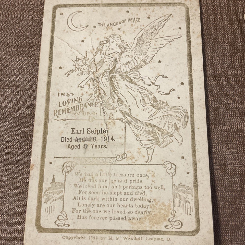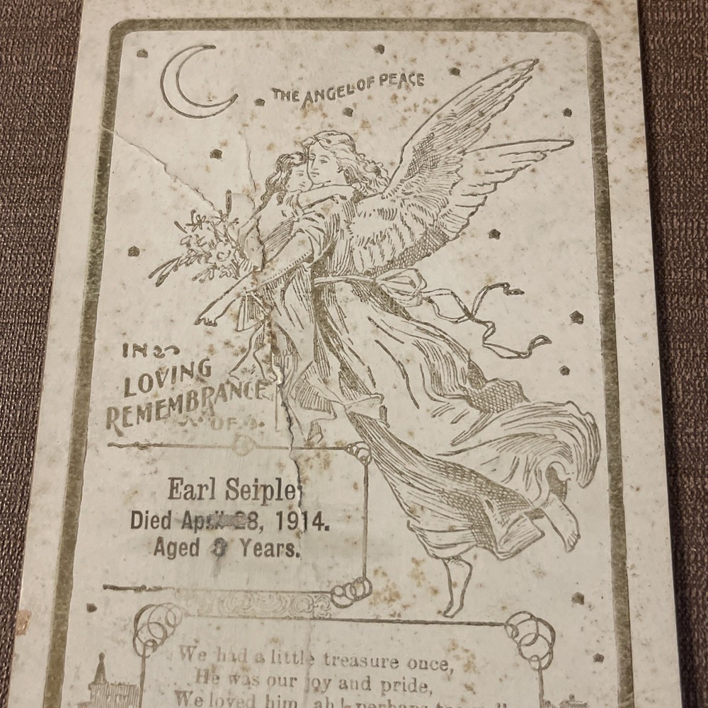 This product is an antique child death notice from 1914, designed in gold and white colors. It is a collectible item originating from the United States, likely serving as a heartfelt tribute or remembrance for a child who passed away. The paper ephemera captures a piece of history and serves as a sentimental keepsake for those who remember the child. T hank you for looking. This item is from a smoke free home. Please view all the photos. Check out all my other items.