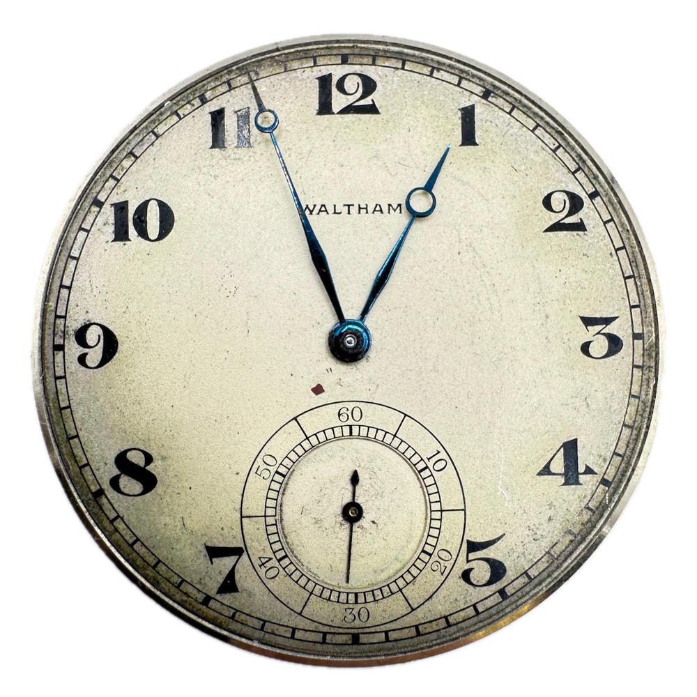 Antique 14s 1918 Waltham 19 Jewel Pocket Watch Movement Riverside A USA Product Description Item: Pocket Watch Movement Brand: Waltham Movement: Mechanical Production Year: 1918 Country: USA Jewels: 19 Jewel Gender: Men's Grade: Riverside A Size: 14s Product Measurements Diameter: 40.5mm Diameter of Dial: 41.5mm Product Condition Overall Condition: Fair, overall condition for its age. Functions: Not running but the balance complete is in good condition. Dial: The dial has scratches and discoloration. Hands: There is discoloration on the hands.