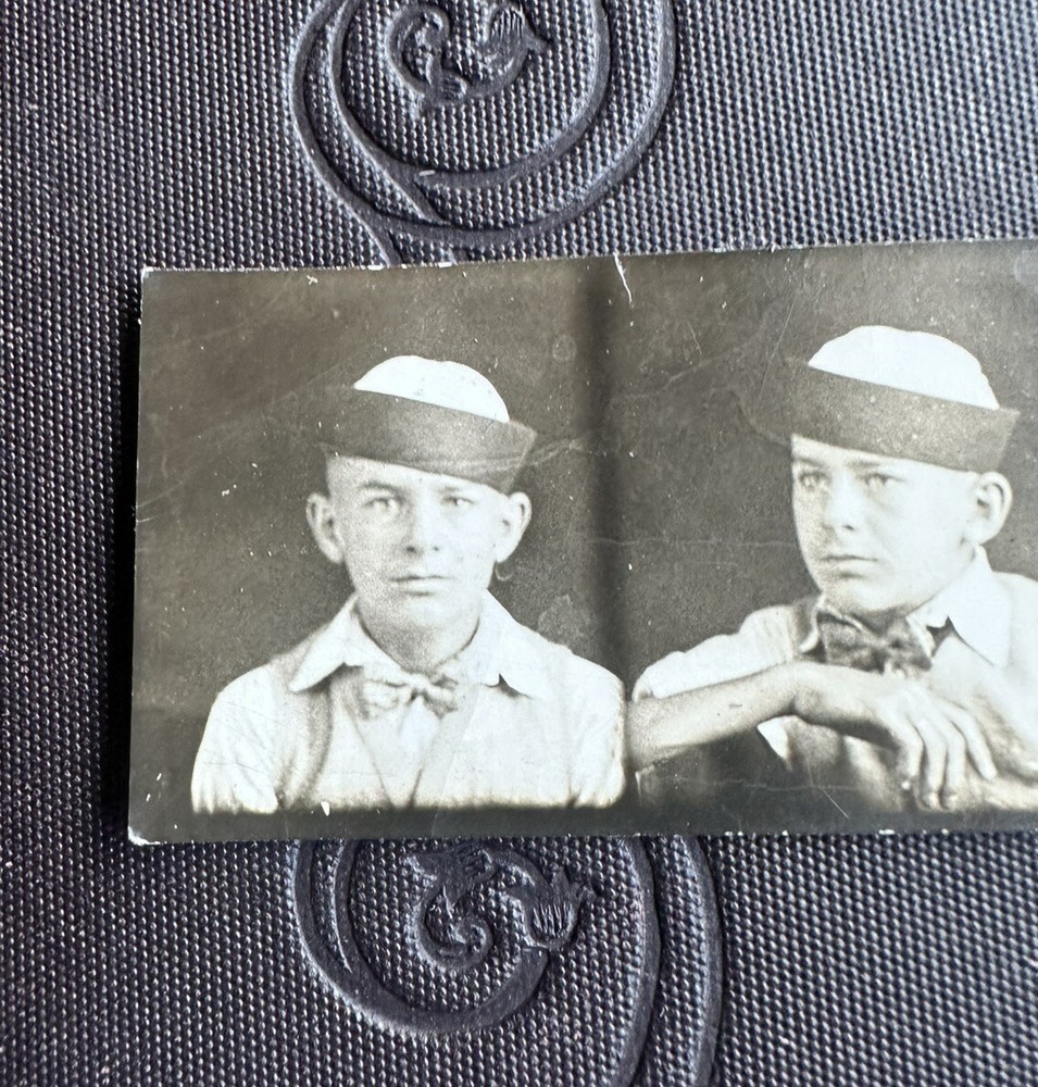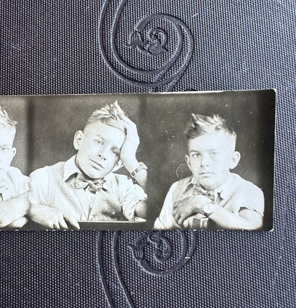 Wonderful, antique 1920s or early 1930s Photo Booth coin op photo. Featuring a boy in a hat of that time. The photo measures 5” 1/2 long by 1” 1/4 tall. Unfortunately, the photo has a crease on the front top left photo. As well as in the back right. A must for early coin operated, Photo Booth machine portrait photography. Most likely taken at a fair/carnival/amusement park. Selling as is. Offering free shipping. Thanks for your interest!