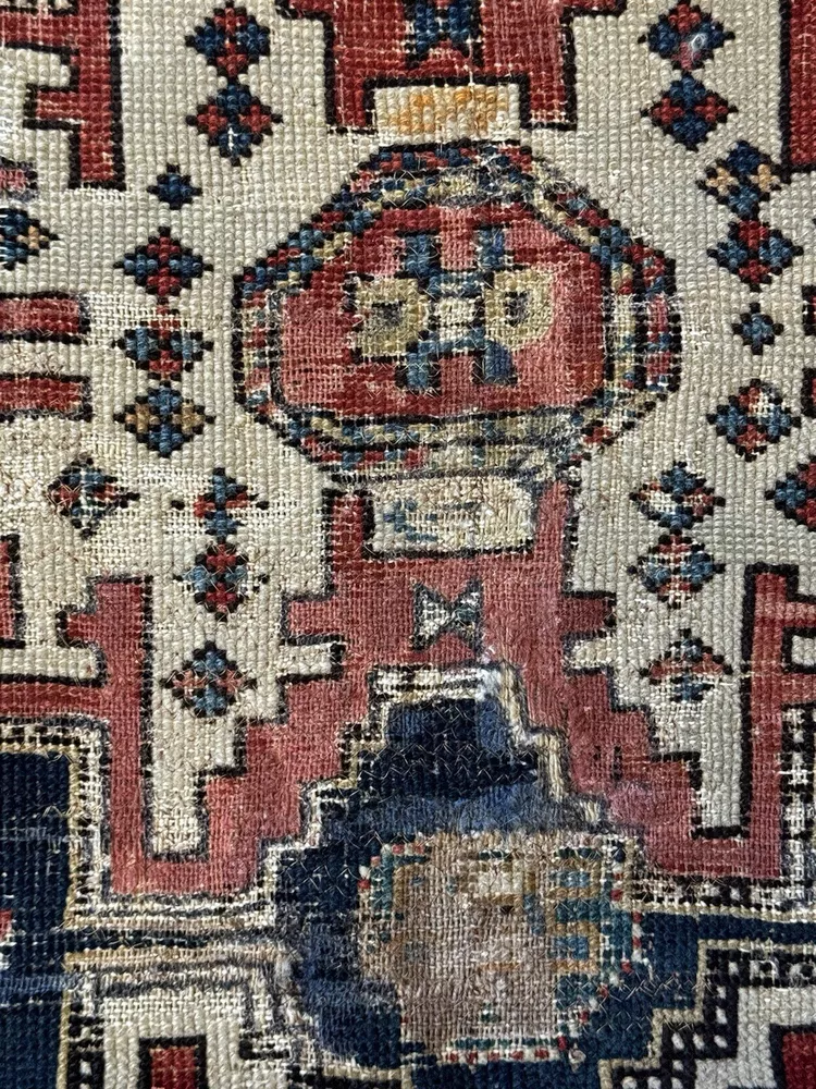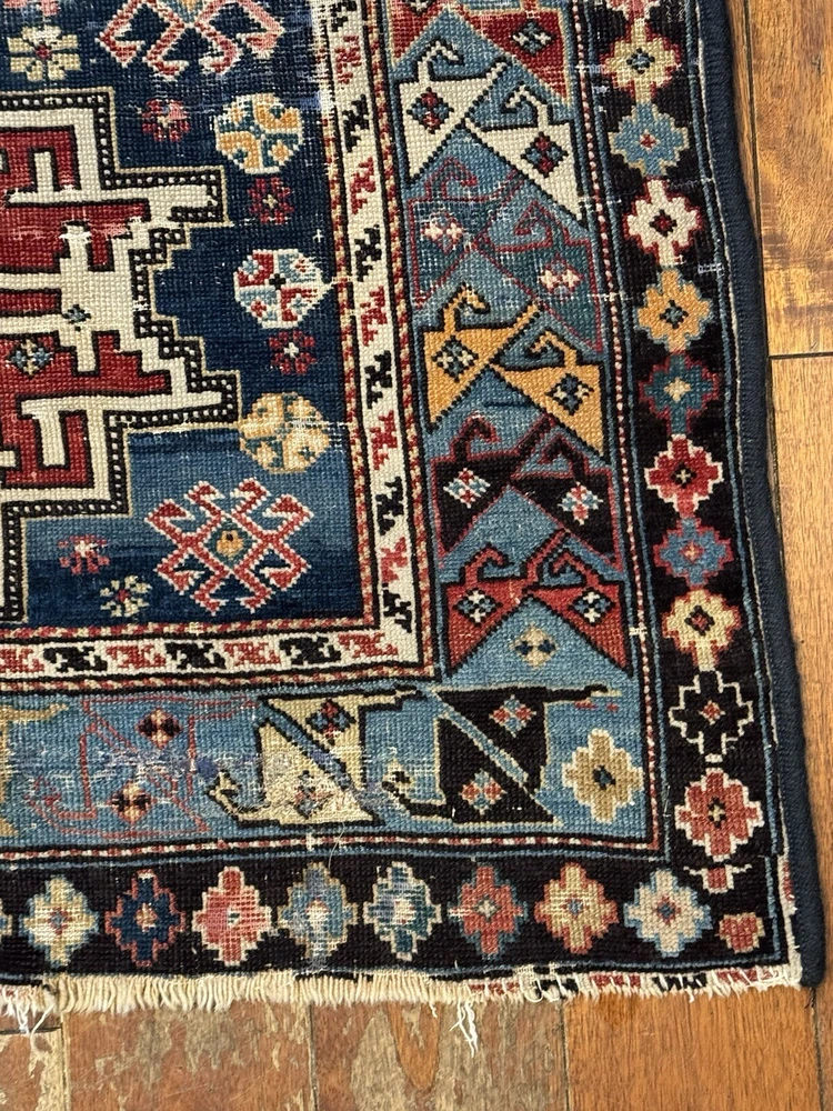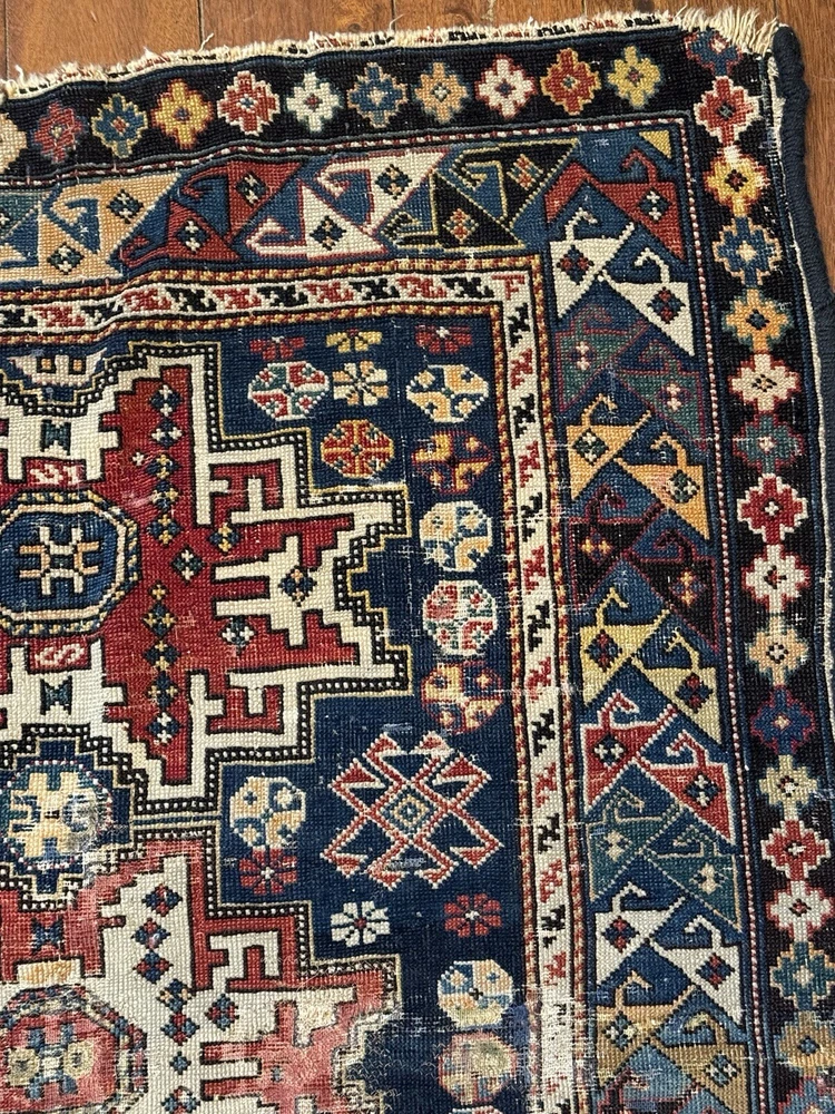 Antique 19th century South Central Caucasian Kazak Rug measures approx. 37" x 49" with Lesghi Star Design. This multi colored hand knotted rug was well loved. The sides have binding (not sure when that was done). There are numerous repairs, soiled and worn areas. An area looks like it was reattached as well. Despite all that, this Azerbaijan rug is gorgeous. The colors are still rich, despite in the worn areas. The design is particularly complex with many motifs scattered about. Zoom into photos for additional details. Thanks for looking!