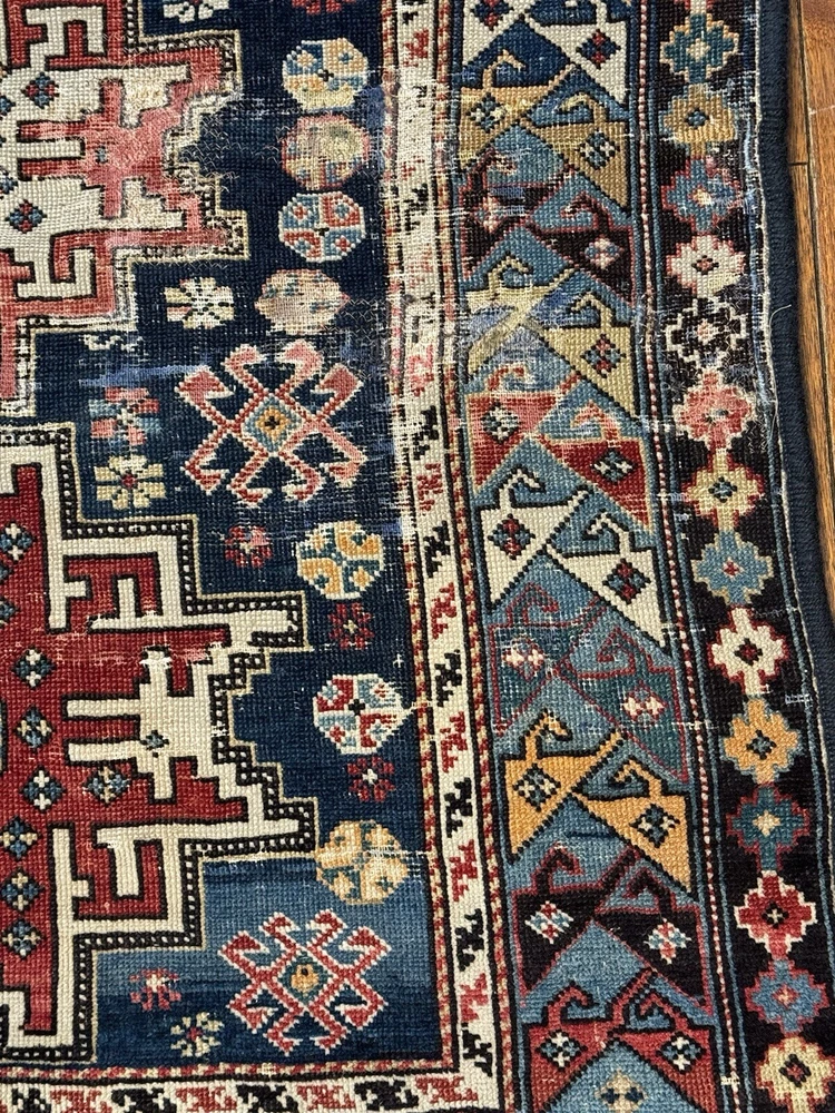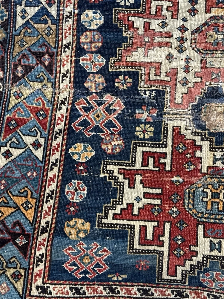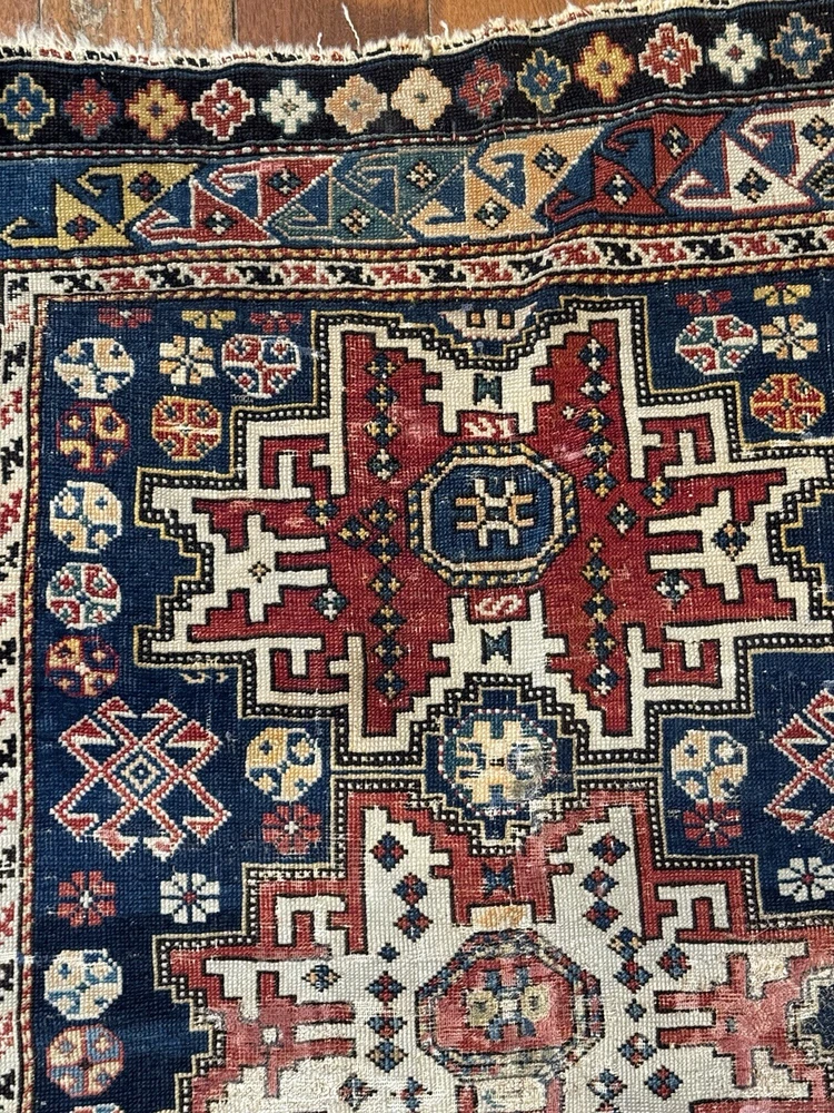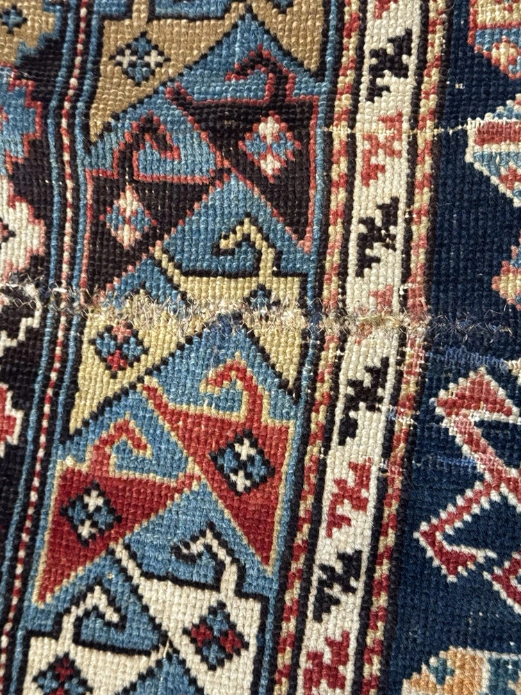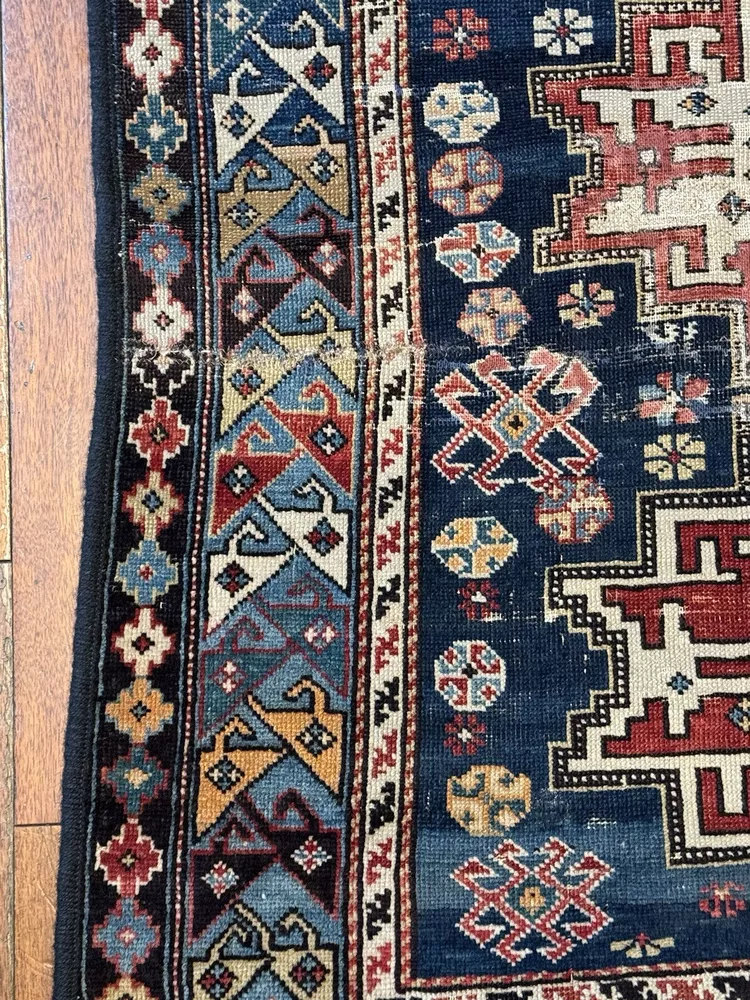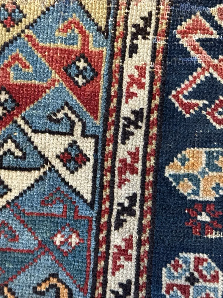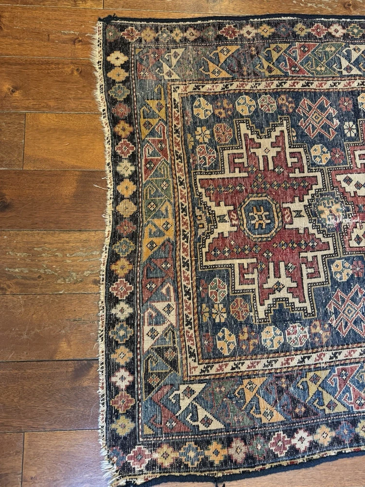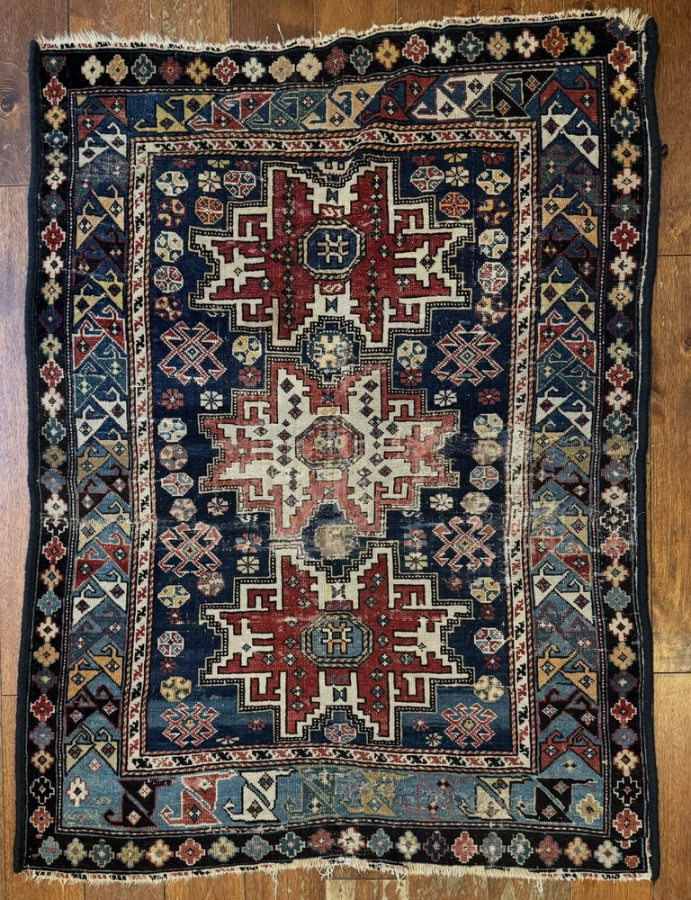 Brand: Handmade Culture: Caucasian Care Instructions: Avoid Harsh Chemicals Color: Multi color Original/Licensed Reproduction: Original Item Width: 37" Seller Notes: “There are numerous repairs, soiled and worn areas. An area looks like it was reattached as well.” Handmade: Yes Type: Rug Country/Region of Manufacture: Azerbaijan Room: Any Room, Bedroom, Conservatory, Foyer, Guestroom, Home Office/Study, Living Room, Lounge Department: Teens, Adult Production Technique: Knotted Item Length: 49" Features: Eco Friendly, For Chairs with Wheels (Living and Commercial Area), Hand-Knotted, Noise-Reducing, Self-Laying, Suitable for Floor Heating Material: 100% Wool Pile Height: Low Pattern: star geometric Shape: Rectangle Size: 37" x 49" Era: Victorian (1837-1900) Regional Design: Kazak Weave: Hand-Knotted Theme: Star Style: Tribal Time Period Manufactured: 1850-1899