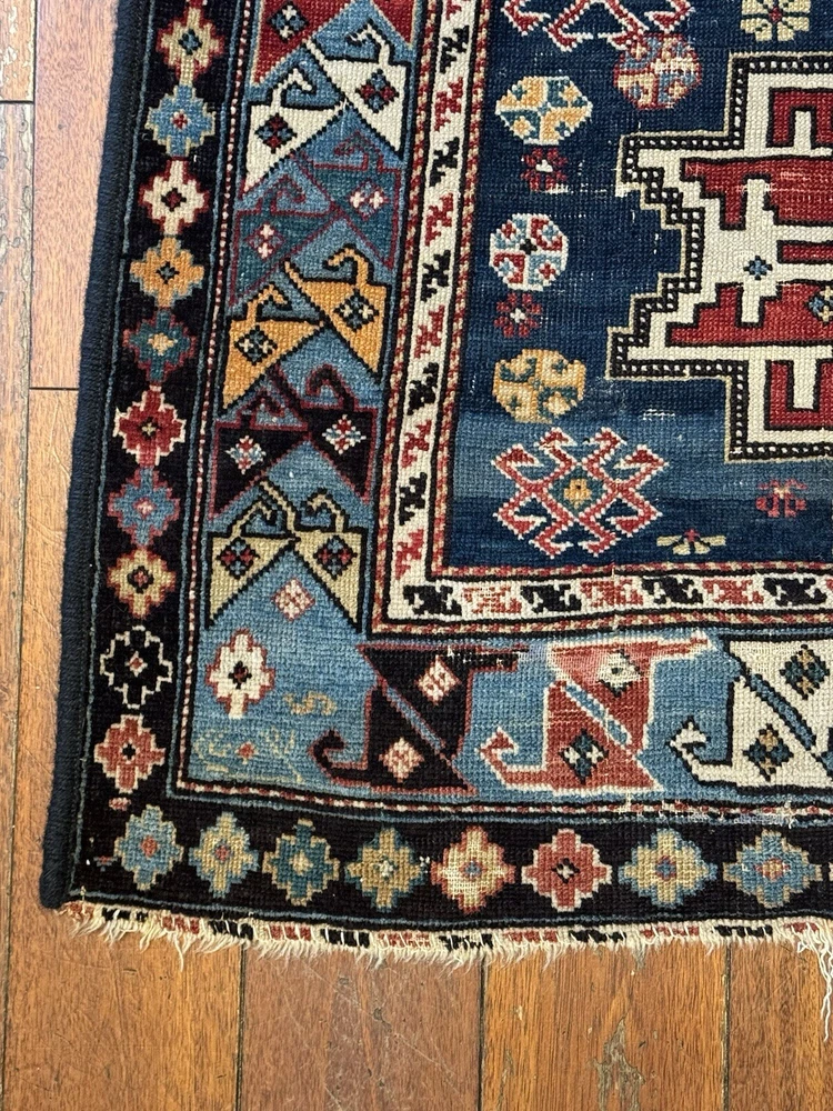 Antique 19th C. Kazak Rug 37" x 49" LESGHI STAR Design Red Tan Navy