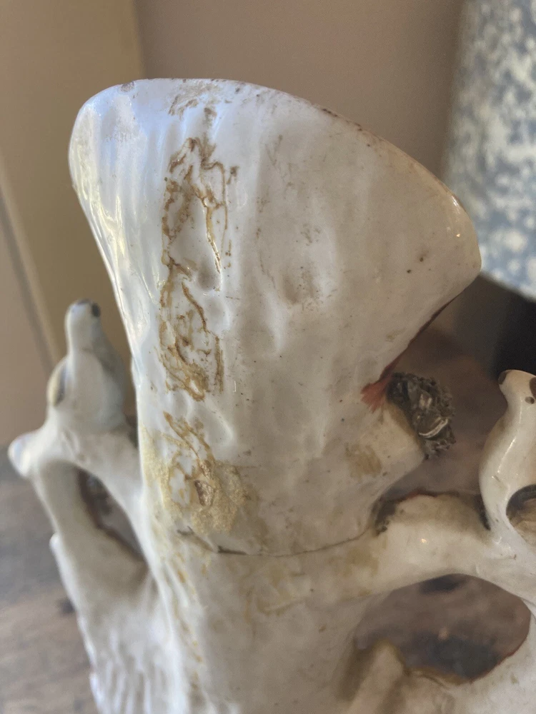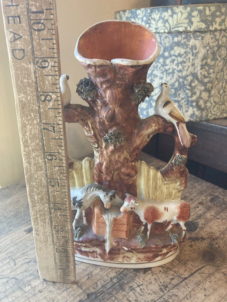 For sale is a nice Antique 19th century victorian era porcelain/ceramic/Staffordshire spill vase used to hold kindling wood shavings. It features a tree with a spring bubbling from beneath and animals around. A nice example of early ceramic work. Each figurine measures 10” tall, 7” wide. It is in restored antique condition on the neck. Not too obvious. See picture. appropriate surface wears and manufacturer imperfections are to be expected. Please check photos from all angles for details. Overall, it is a nice piece of early Victorian era ceramic artwork that would fit well in any antique collectors home. Ship with careful packaging and full insurance. Feel free to check out my other antique and collectible listings. I gladly combine shipping whenever practical.