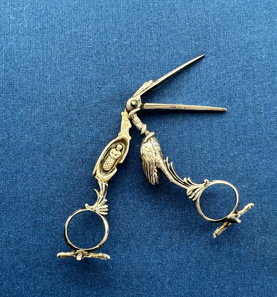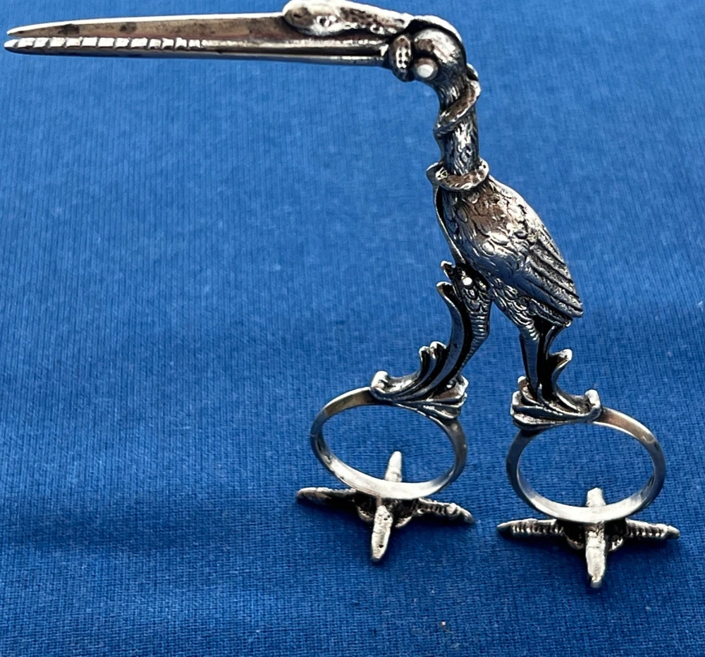 A wonderfully detailed figural stork sewing clamp in solid 800 silver (stamped under the bill), paired with vintage Revlon stork scissors . Packed with symbolism and sculptural detail—display-worthy and collectible. 🧵 Stork Clamp Highlights Material: Solid 800 silver (80% purity), not plated Design: Long stork bill forms the working clamp Hidden motif: Inside the jaws are tiny swaddled babies in relief Symbolism: Coiled snake wraps the neck and beak Freestanding: Detailed stork feet act as a stand —it perches upright (see photos) Markings: “800” purity stamp under bill + maker’s hallmark (unidentified) just below the hinge Size: approx. 4.75" tall (overall) Era/Origin: Late 19th–early 20th c., continental Europe ✂️ Bonus: Revlon Stork Scissors Vintage Revlon embroidery/sewing scissors (marked REVlon / W. Germany ) Good working condition; classic stork form Condition Notes Clamp opens/closes smoothly; lovely age patina from decades of gentle use No breaks or repairs noted Revlon scissors show light surface wear consistent with age Please review all photos for the best representation of condition 📌 Collector Notes Figural stork tools are favorites in antique sewing and medical-curio circles. This example stands out for its babies-in-jaws and serpent details, solid 800 silver construction, and the ability to stand on its own feet for display. 📦 Shipping Carefully packed, boxed with padding, and shipped insured with tracking (USPS Ground Advantage). 👉 Thanks for looking! Check out my shop for more antique sewing and vintage curiosities!! 👈 +++ 🔹 A Note on My Listings: I am not a historian or antique dealer, but I do my best to research and provide accurate information. Please review the details and conduct your own research if needed. I encourage you to ask any questions before purchasing—I’m happy to help! I strive to represent all items accurately, whether they come from my own home or another well-loved source. If you notice anything that seems incorrect or misrepresented, or if you have any concerns after receiving your item, please reach out directly—I’ll gladly assist in resolving any issues.