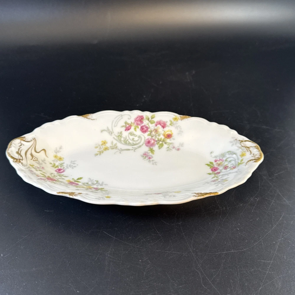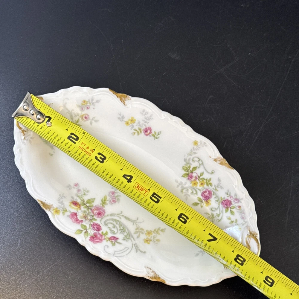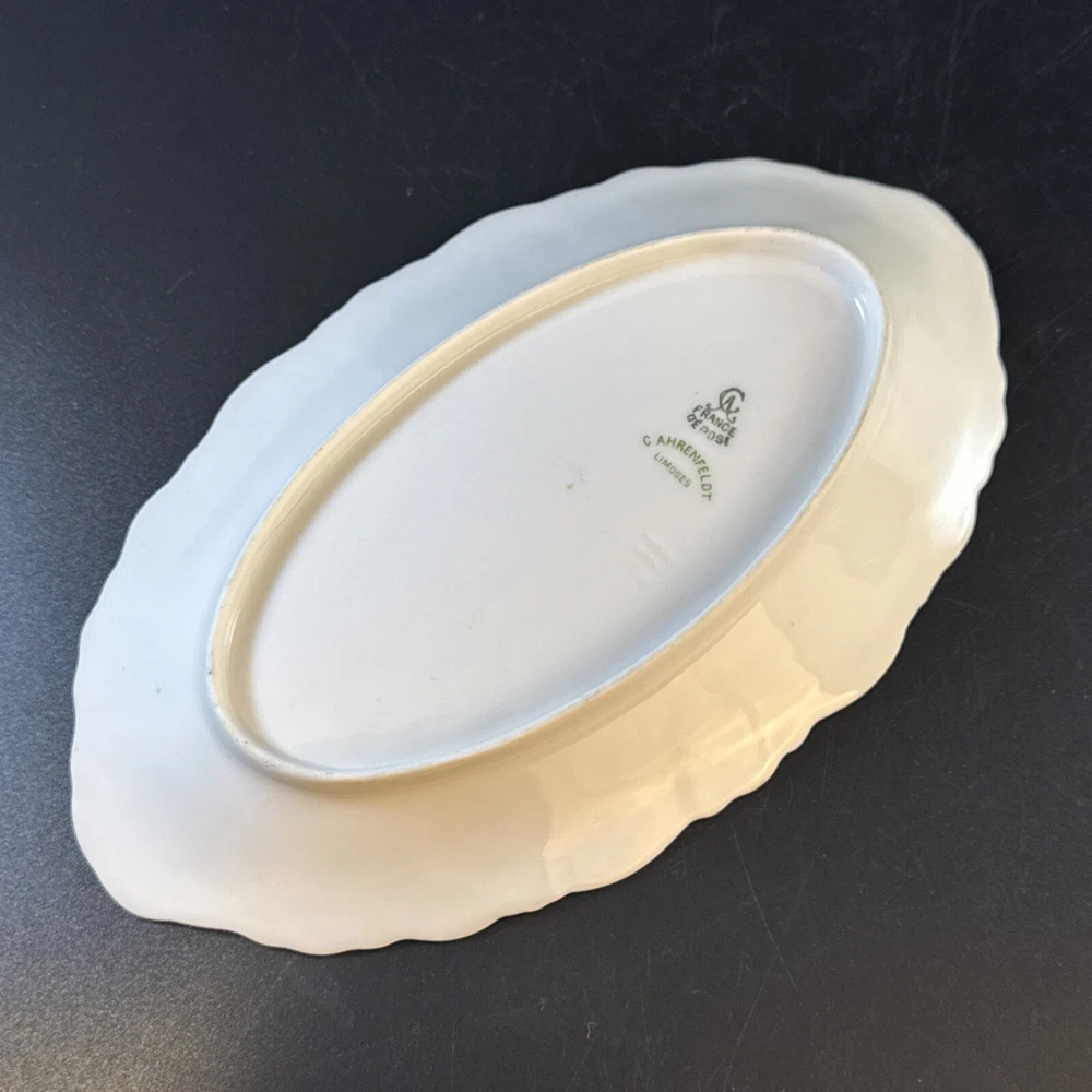 This antique 8.5" oval relish/celery dish by Charles Ahrenfeldt Limoges originates from Limoges, France, and was manufactured in 1894. The dish features a Victorian style with a glossy finish, adorned with a pattern of pink roses on a white background with blue, green, and gold trim. Measuring 6 & 3/8 inches in length, 4 & 1/8 inches in width, and 5/8 inches in height, this porcelain dish is an elegant piece for any occasion and would make a lovely display item for collectors of art pottery from the early 20th century.