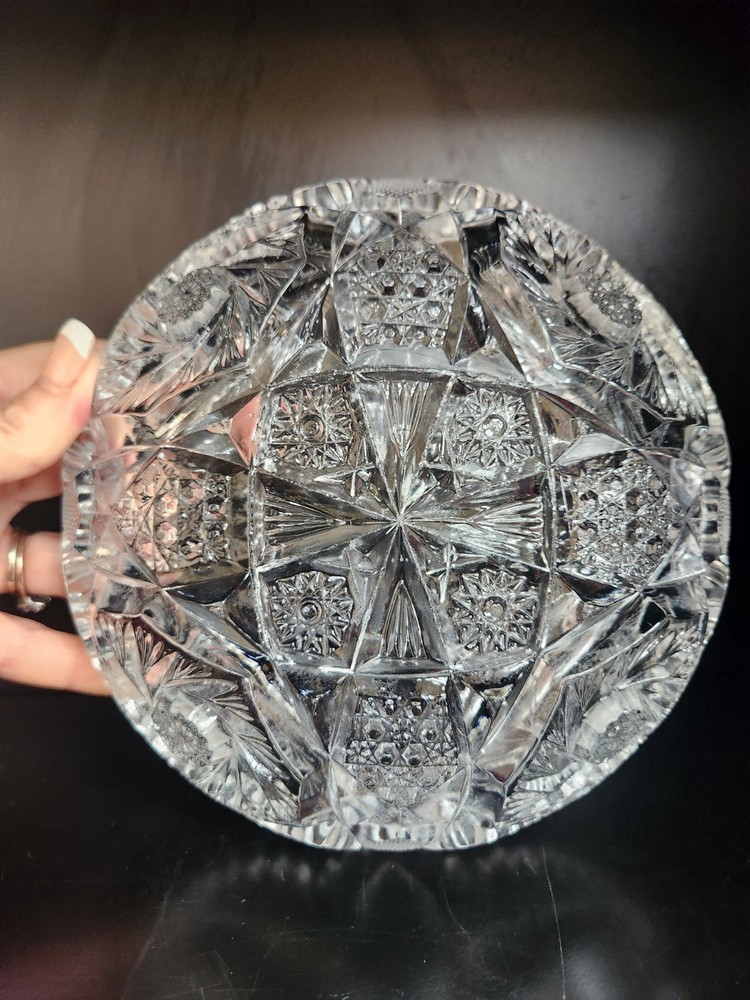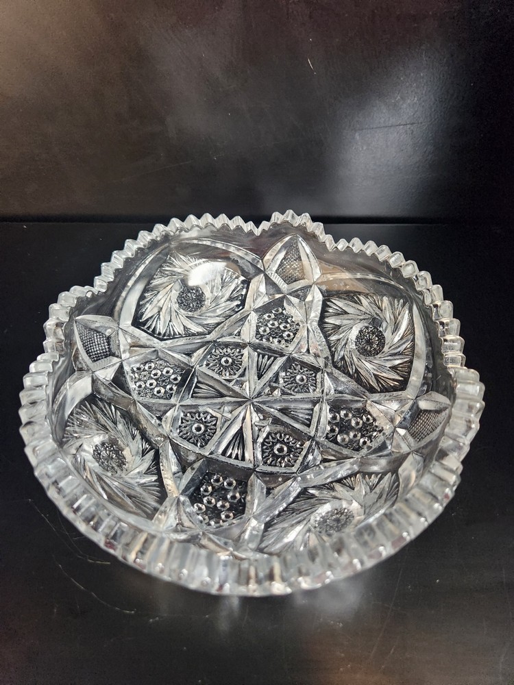 The ABP American Brilliant Period Clear Cut Glass Candy/Nut Dish, dating back to 1876-1915, is a beautiful and collectible decorative piece that exudes elegance and style. Made from glass with a clear color, this original piece reflects the craftsmanship and design of the American Brilliant Period. Perfect for storing candies or nuts, this dish adds a touch of historical charm to any decor with its intricate details and timeless appeal. Size: 7.5" diameter.